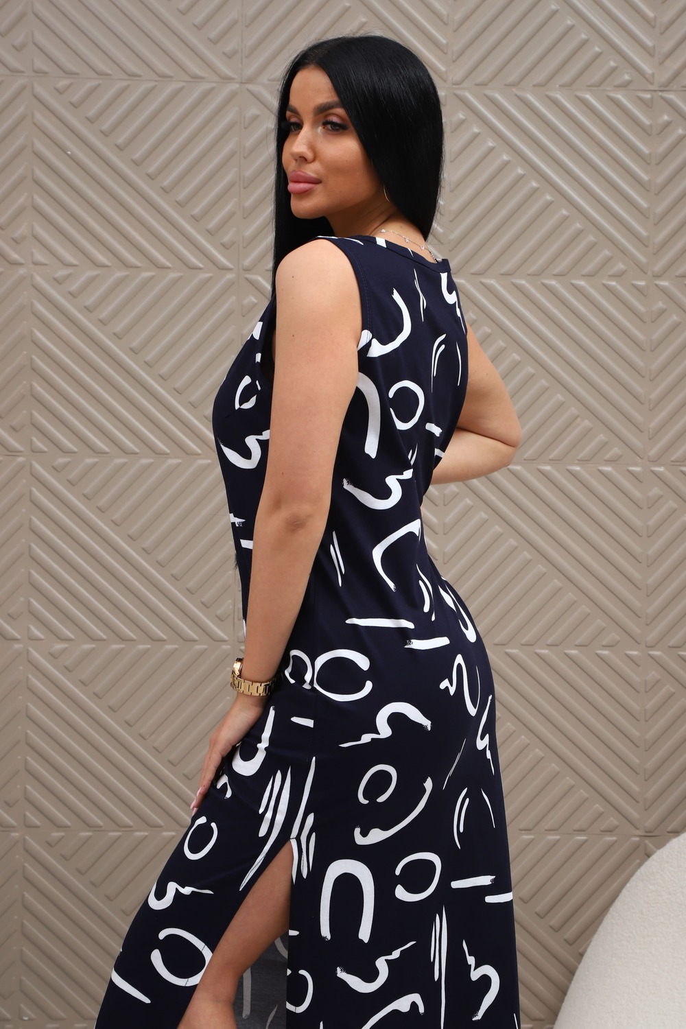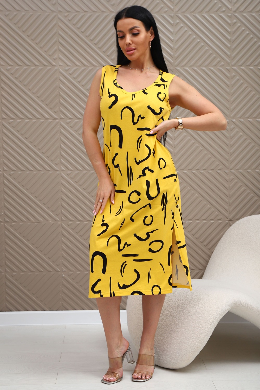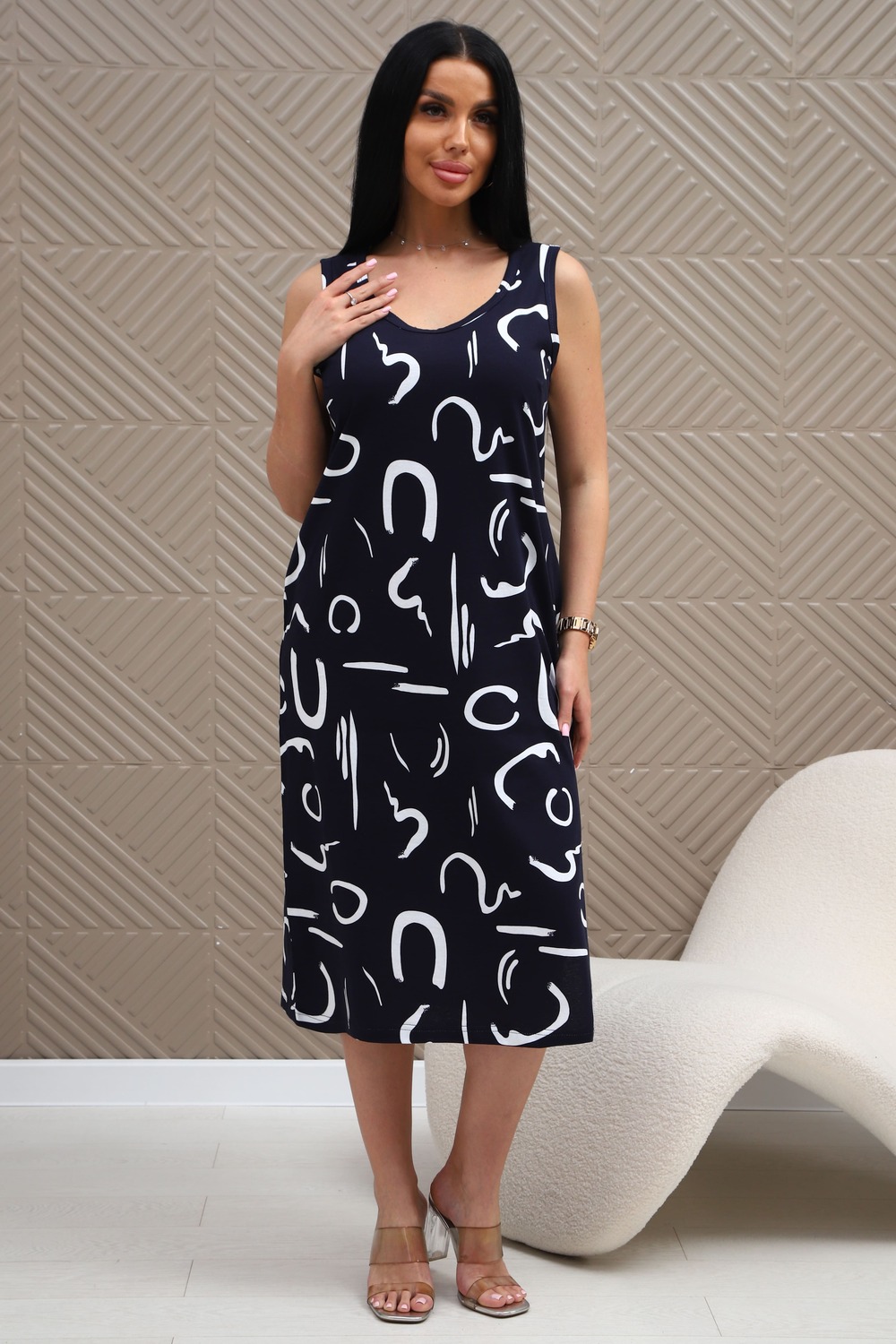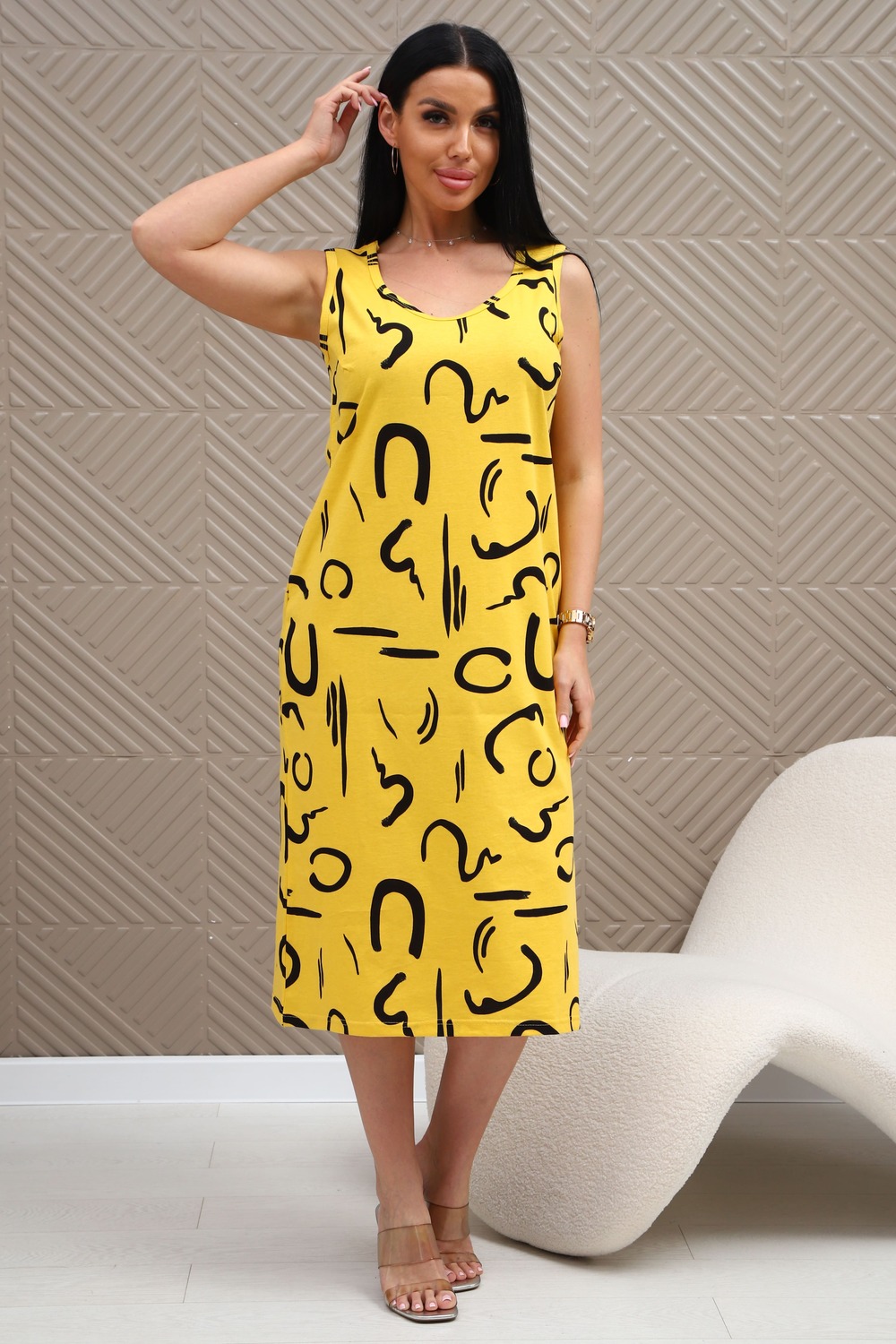 Сарафан из натурального трикотажного полотна. Силуэт прямой, слегка приталенный. Горловина V-образной формы. Без рукава. Спинка и перед гладкие, без рельефов. В боковых швах карманы. Разрезы по низу с двух сторон. Низ изделия прямой.