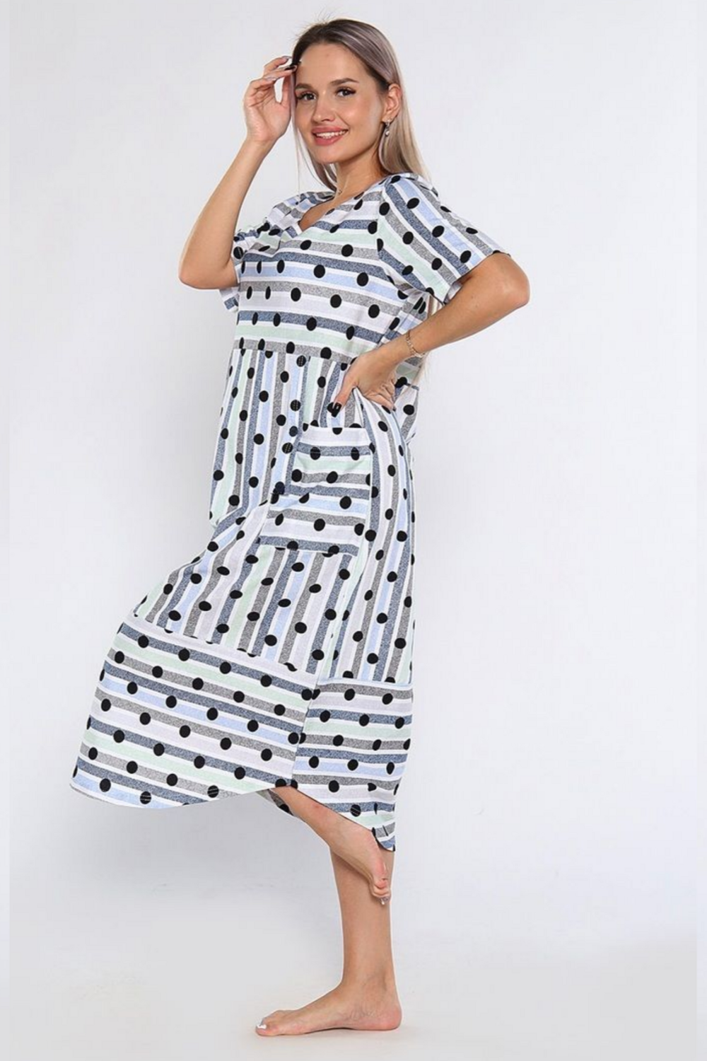 Геометрический принт с горошком действительно вечно актуален и может внести в outfit нотки игривости. Сочетание с различной обувью — сандалиями для неформального образа или с кроссовками для более спортивного стиля — позволяет создать разные образы в зависимости от настроения. Платье женскеое "Руся" действительно универсально и может стать основой для множества летних луков!