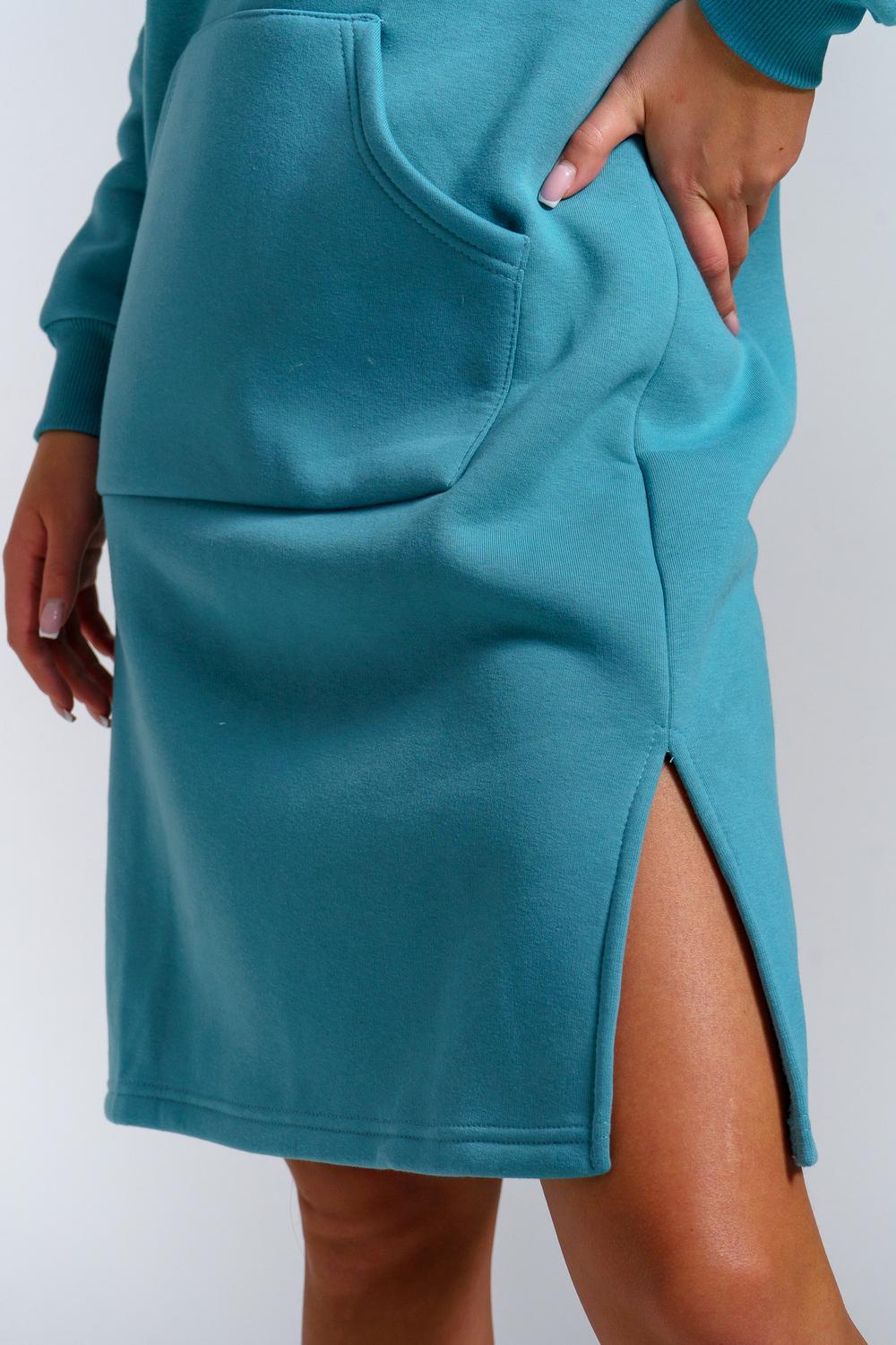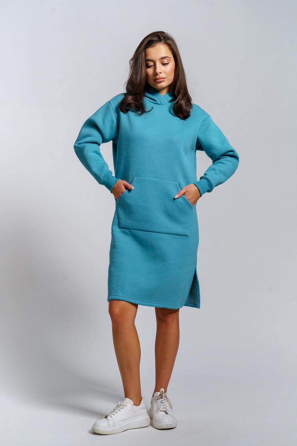 Платье женское утепленное с двойным капюшоном и накладным карманом. Манжеты выполнены из кашкорсе, в боковых швах по низу изделия разрезы.