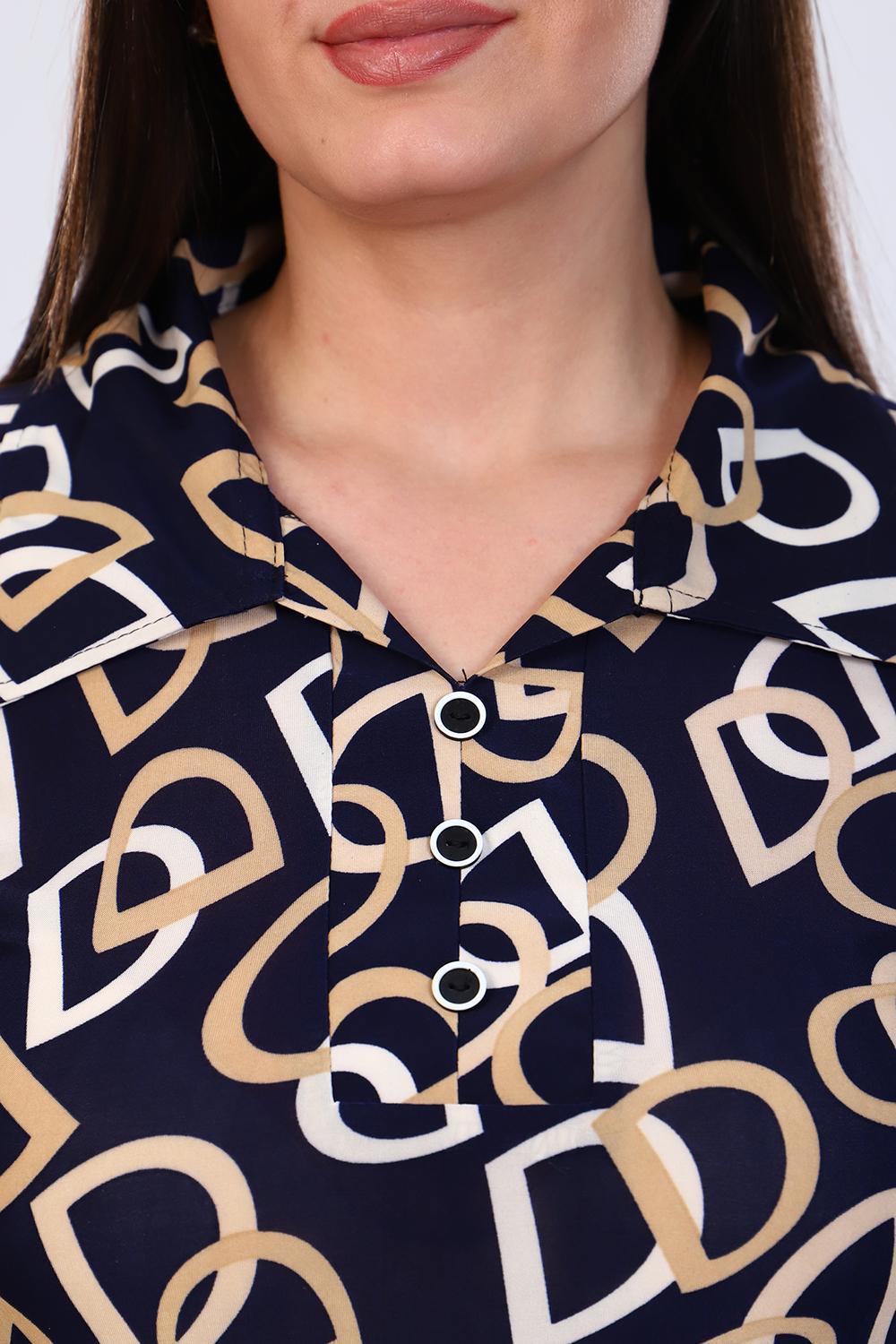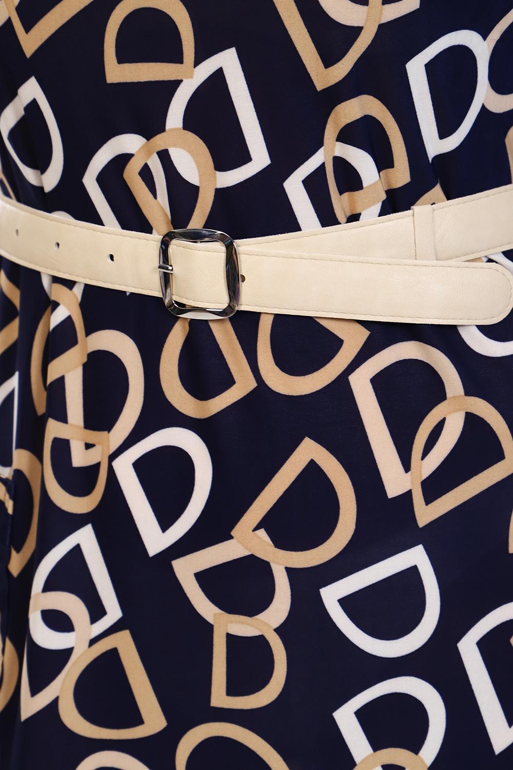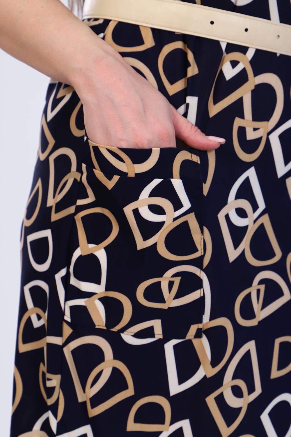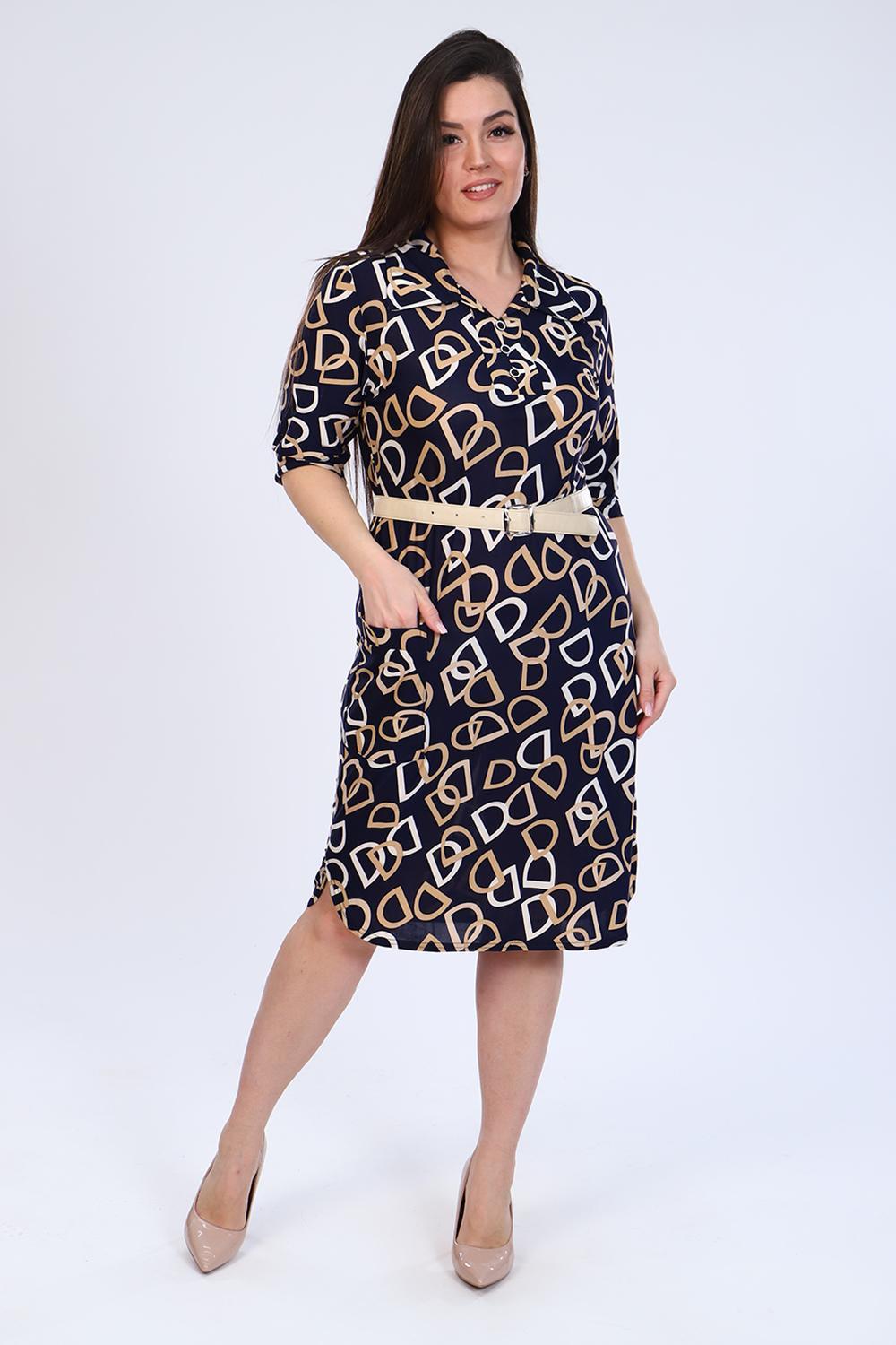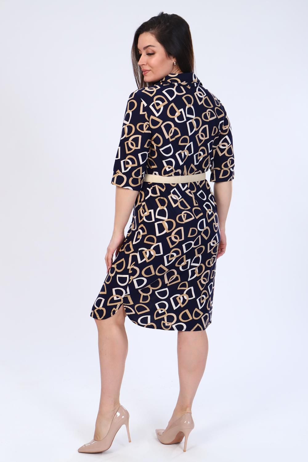 Платье прямое рубашечного покроя с закругленным низом, отложной воротник, рукав 3/4 подобран патами, с закругленным низом, накладной карман. Пояс в комплекте.