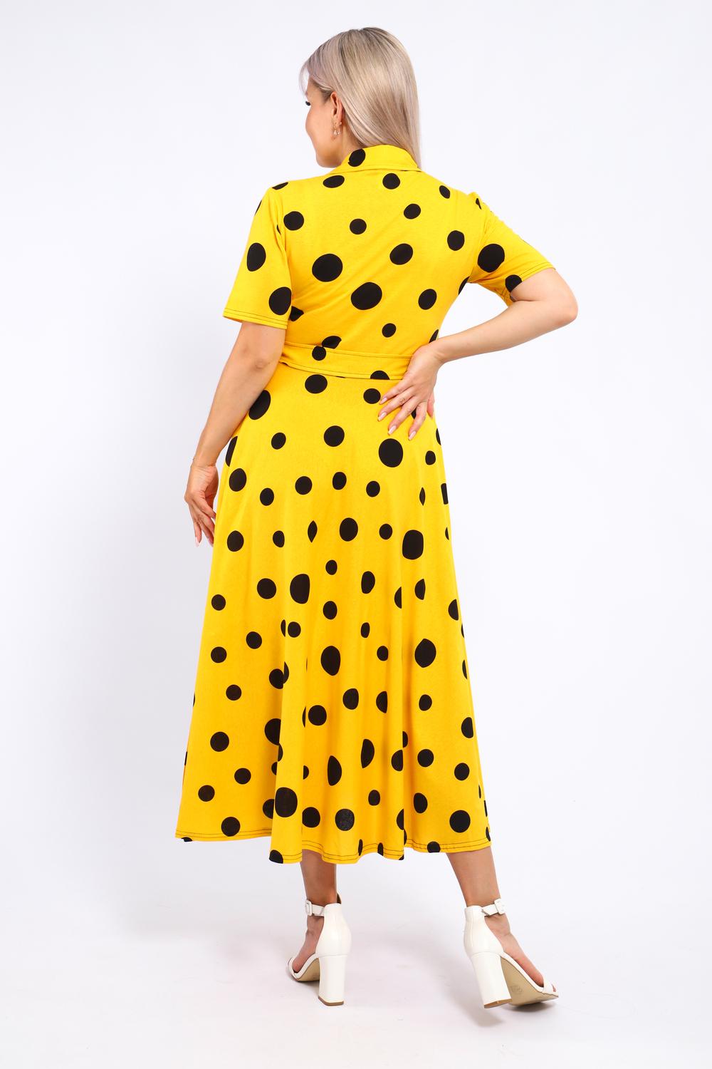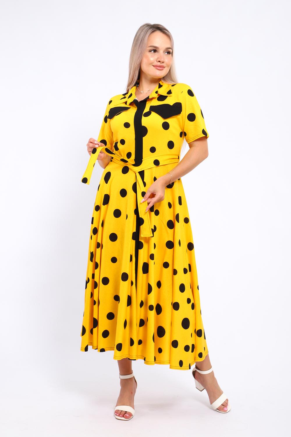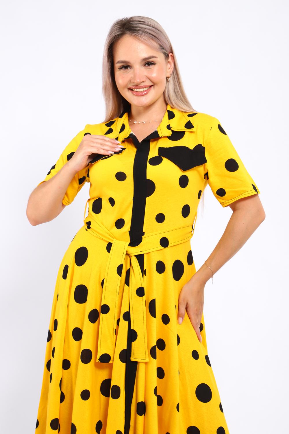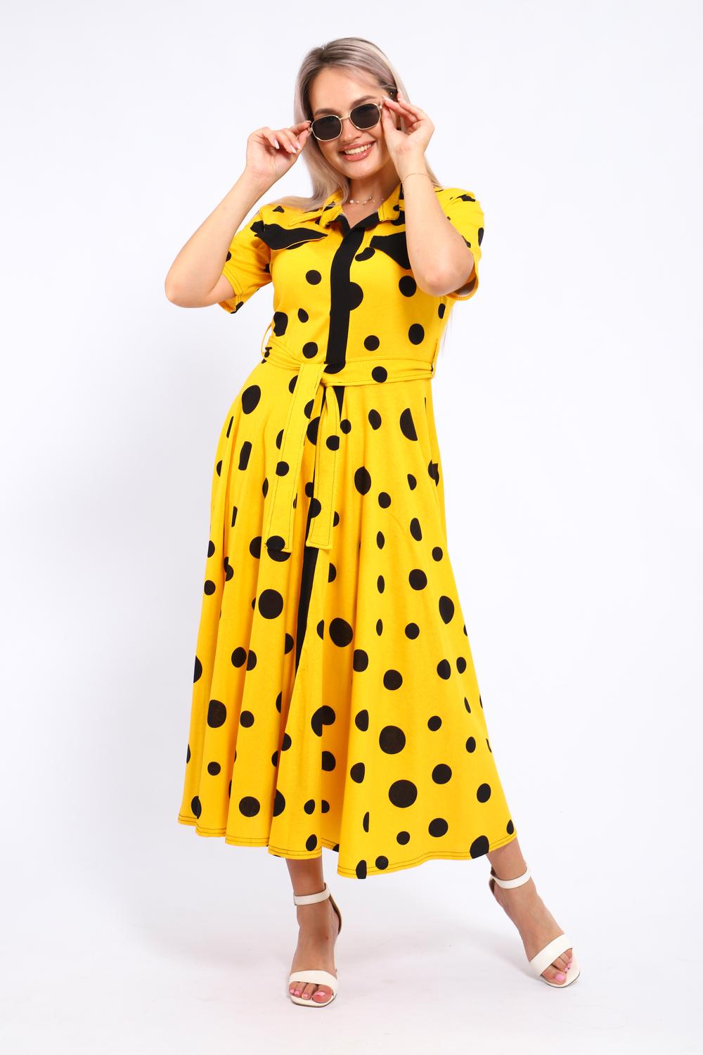 Платье, которое сочетает в себе комфорт и уникальный дизайн. Модель выполнена из мягкого материала, что делает её идеальной для повседневной носки. Свободный крой с расклешённой юбкой и акцент на талии с помощью пояса создают воздушный и женственный силуэт. Контрастное сочетание жёлтого и чёрного в гороховом принте — смелое и при этом очень гармоничное решение. Это платье — отличный выбор для прогулок, встреч с друзьями или офиса. Носите его с босоножками на каблуке для создания изысканного образа или с кедами для более расслабленного стиля.