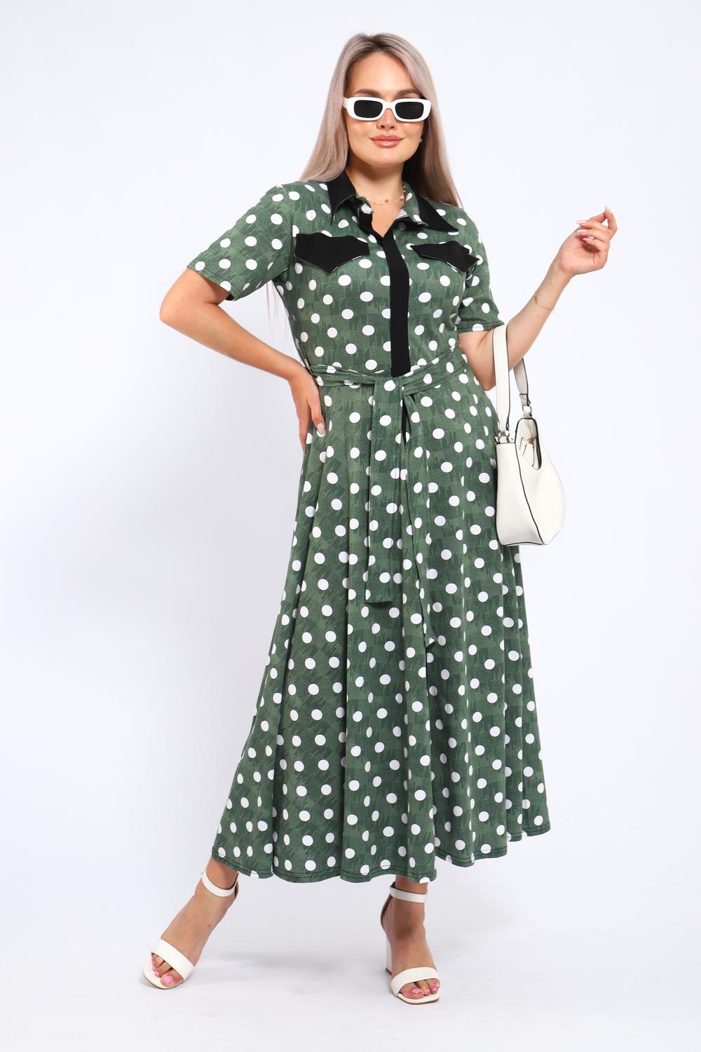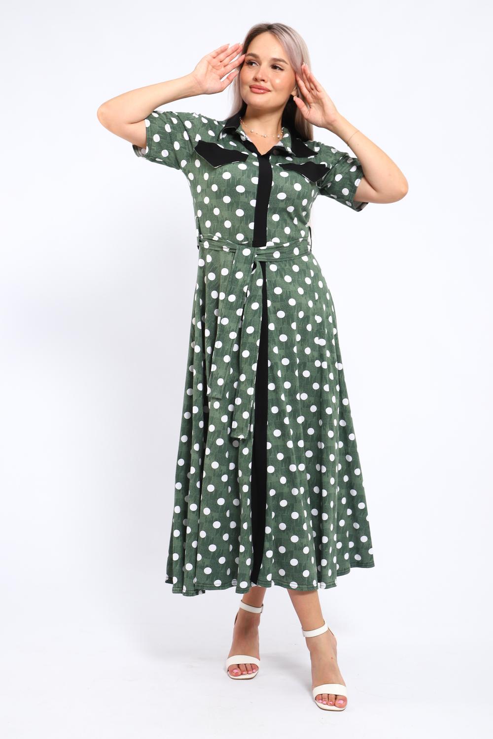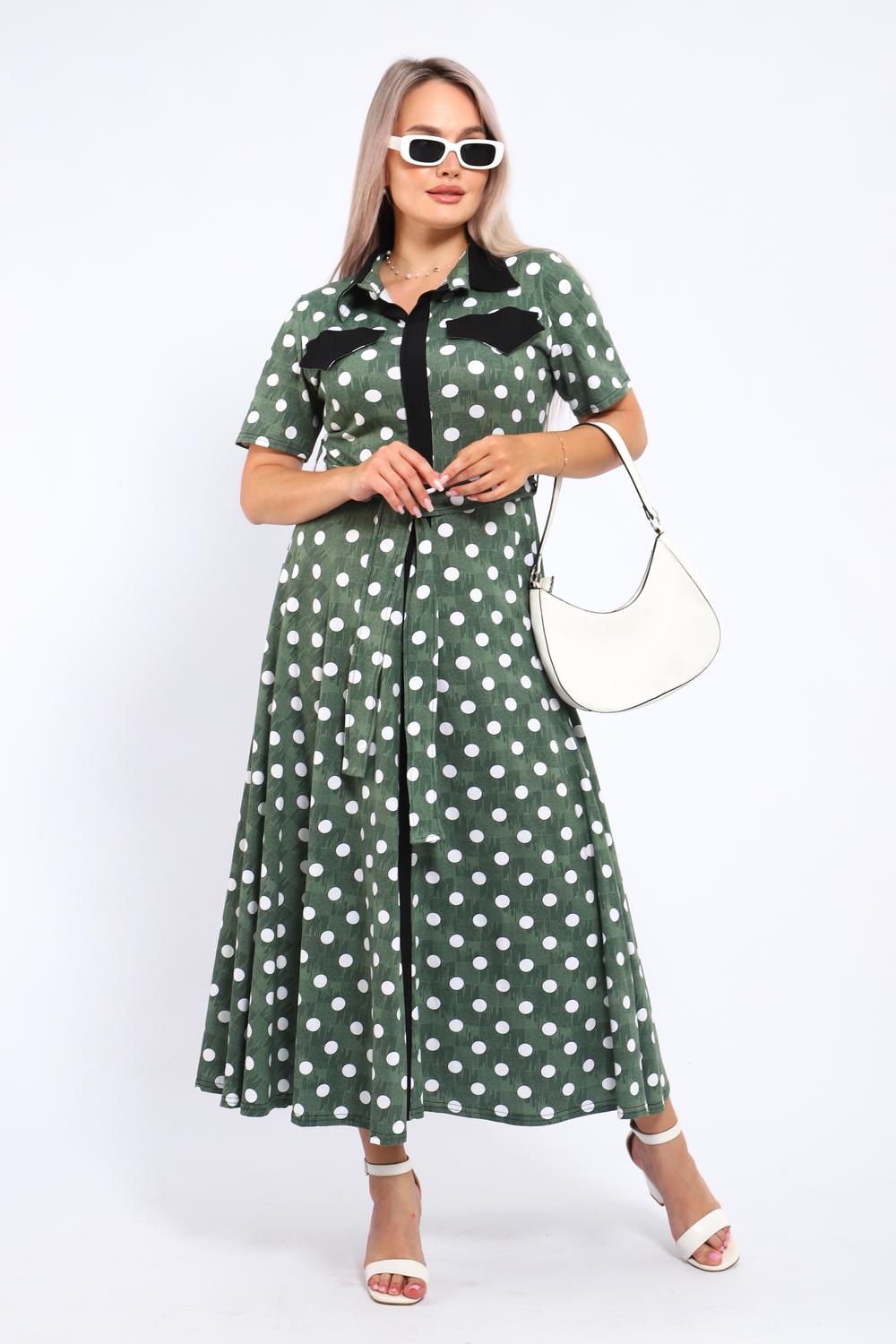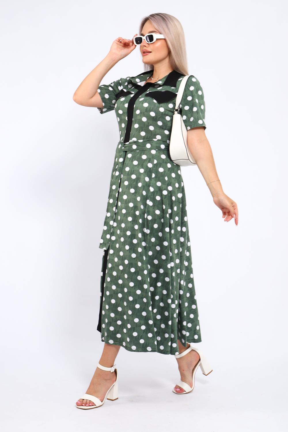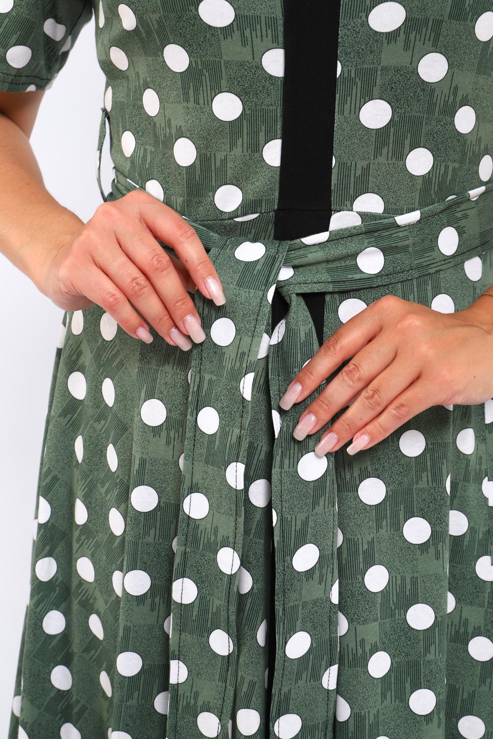 Платье, которое сочетает в себе комфорт и уникальный дизайн. Модель выполнена из мягкого материала, что делает её идеальной для повседневной носки. Свободный крой с расклешённой юбкой и акцент на талии с помощью пояса создают воздушный и женственный силуэт. Контрастное сочетание жёлтого и чёрного в гороховом принте — смелое и при этом очень гармоничное решение. Это платье — отличный выбор для прогулок, встреч с друзьями или офиса. Носите его с босоножками на каблуке для создания изысканного образа или с кедами для более расслабленного стиля.