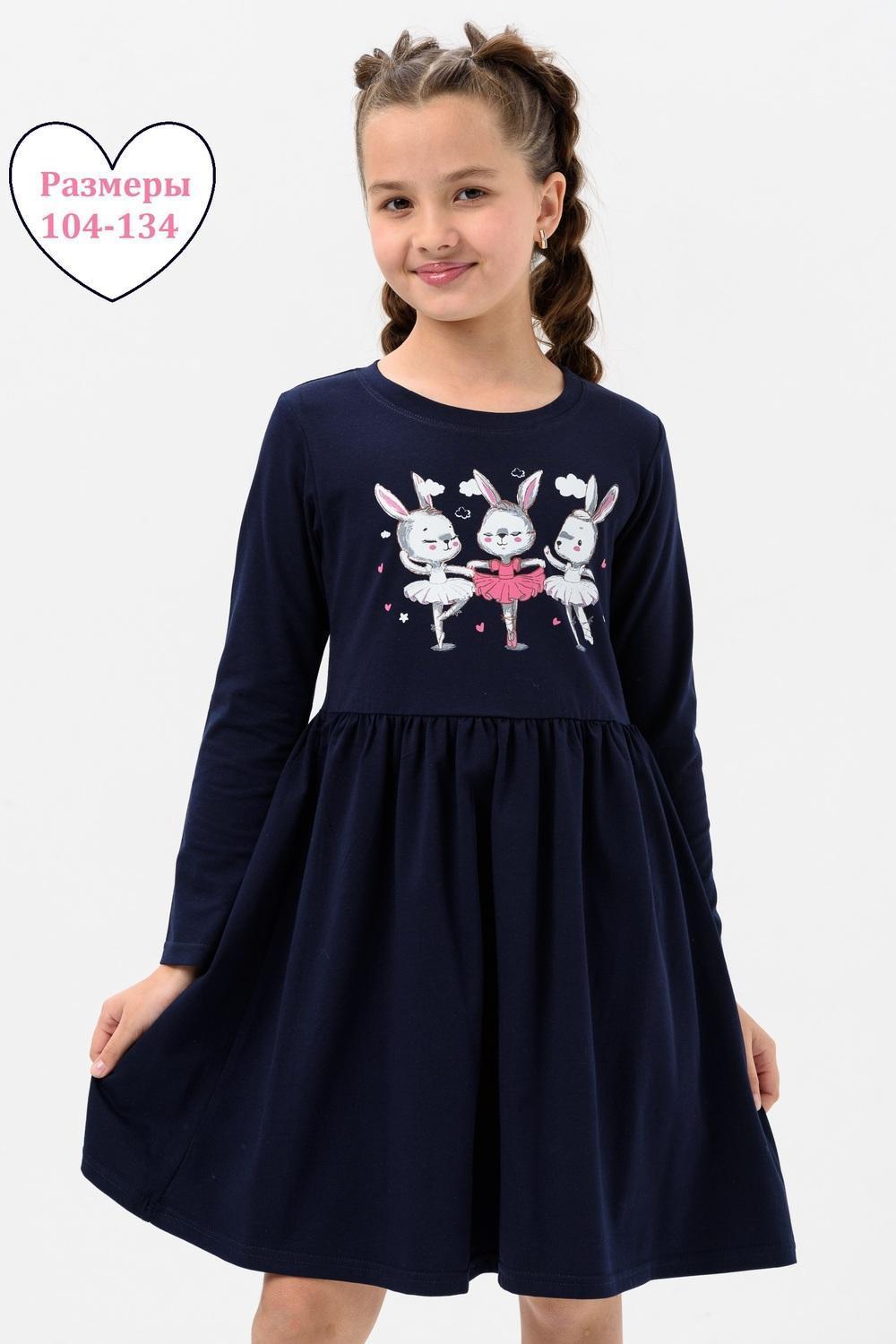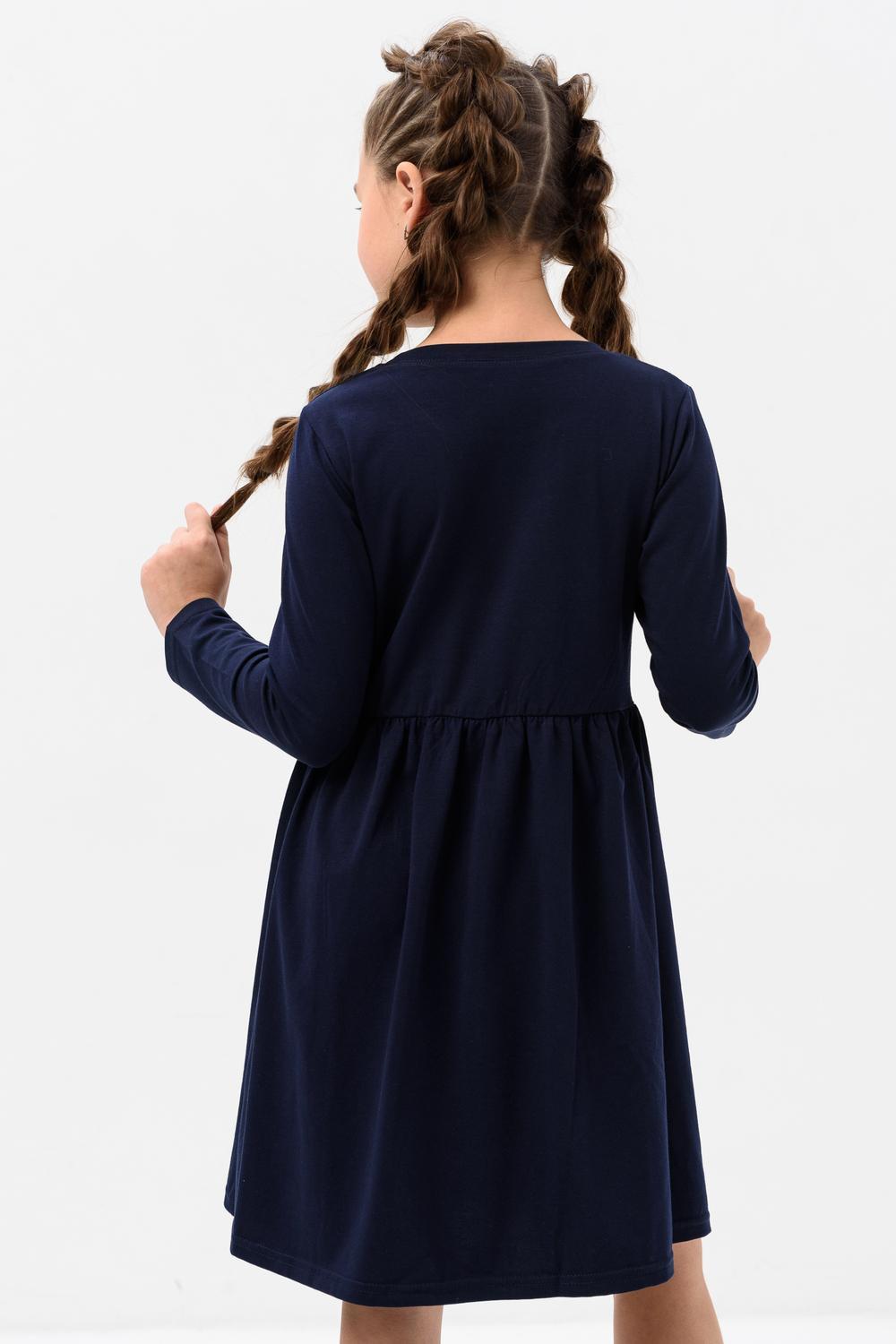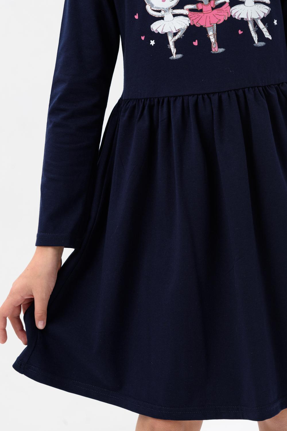 Платье для девочек дошкольного и младшего школьного возраста, из трикотажного полотна кулирка с лайкрой с рисунком. Платье прилегающего силуэта, отрезное и расклешенное от линии талии, с втачным длинным одношовным рукавом, с обтачкой в горловине. Низа рукавов и нижней части платья подогнуты. По шву втачивания обтачки в горловину проложена отделочная строчка. Спереди на верхней части платья нанесен печатный рисунок.