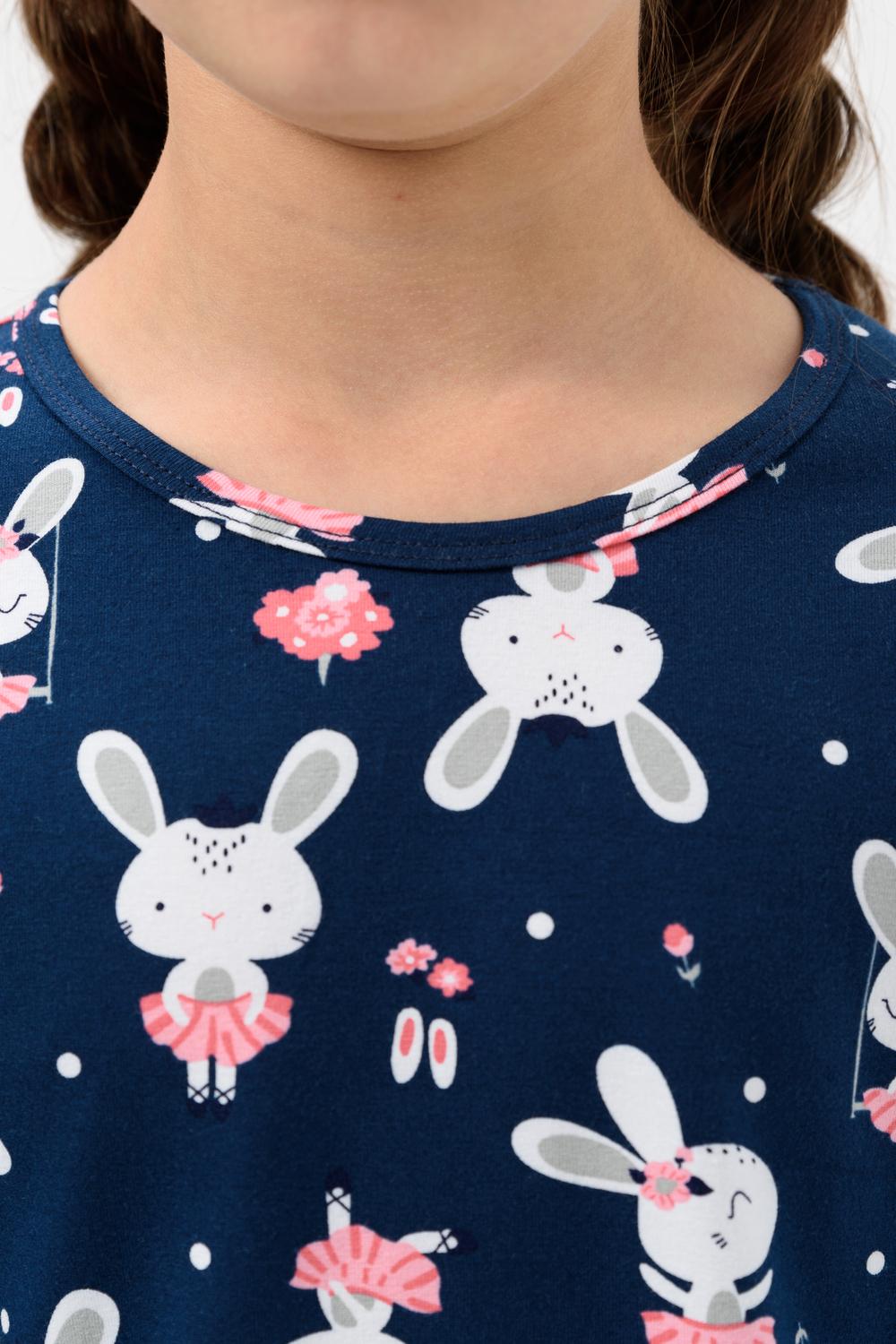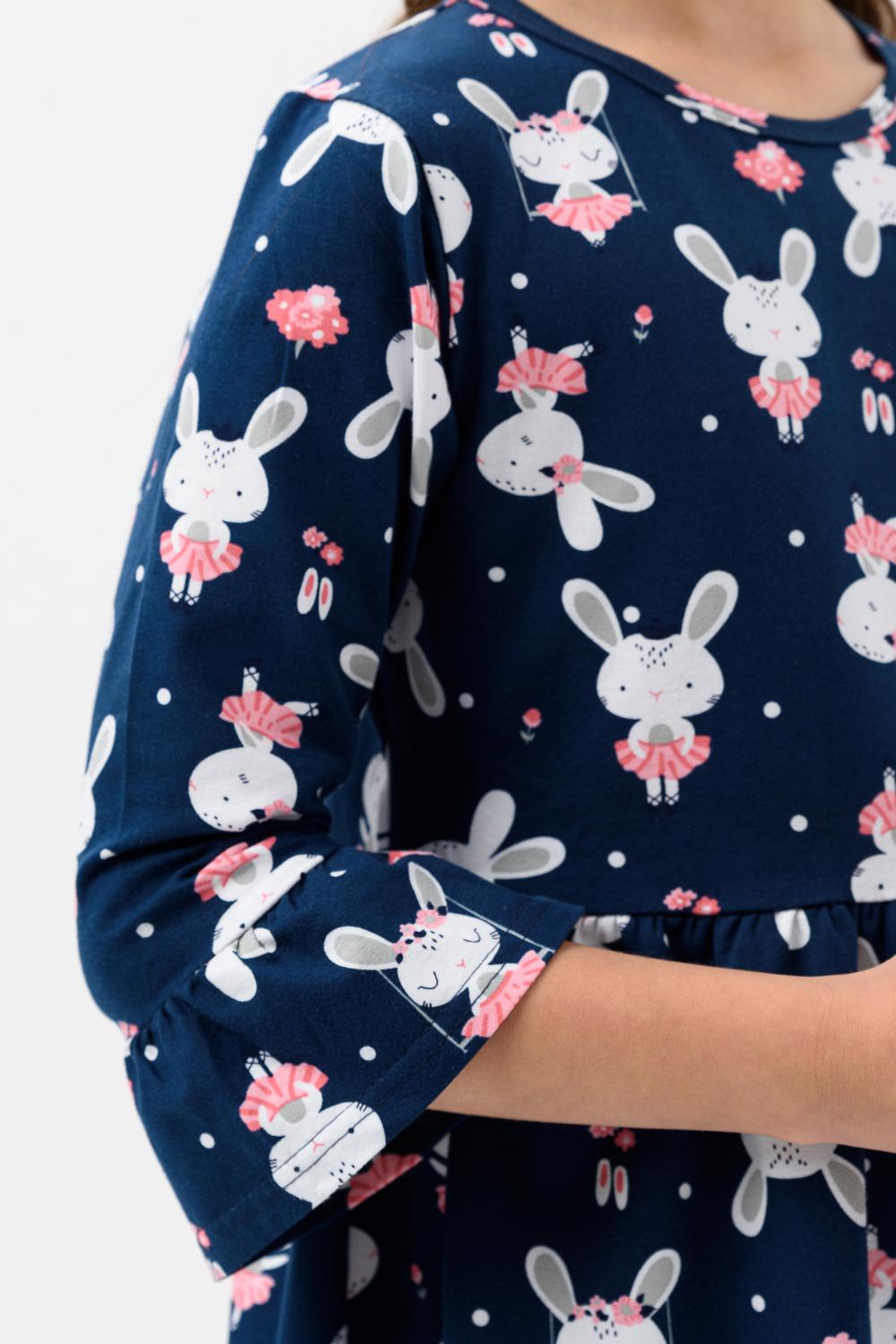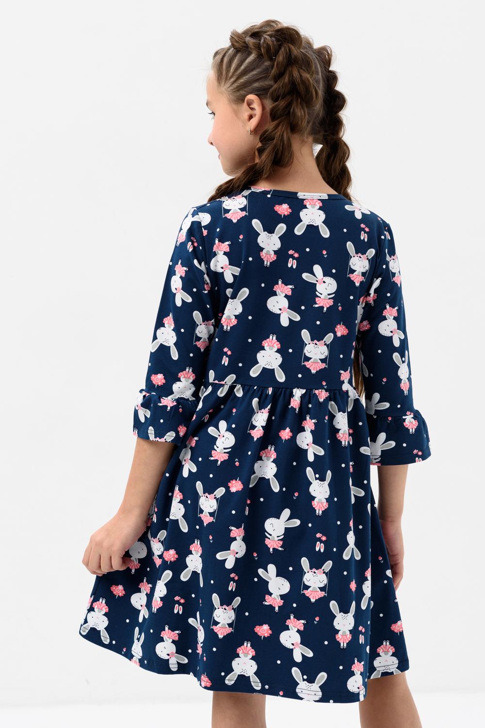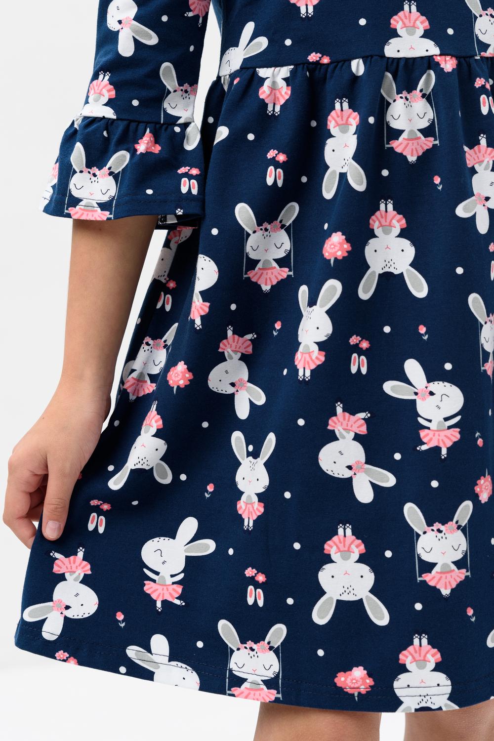 Платье для девочек дошкольного и младшего школьного возраста, из трикотажного полотна кулирка с лайкрой с рисунком. Силуэт прилегающий, отрезное и расклешенное от линии талии, рукав 3/4 втачной одношовный. По низу рукава широкий волан, выполненный из основного материала. Срез горловины окантован.