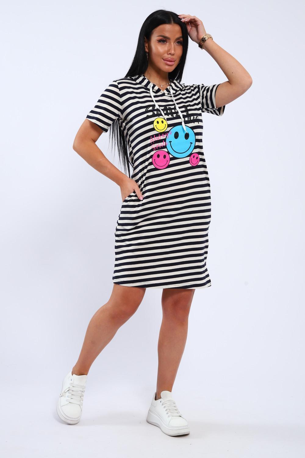 Воздушное хлопковое платье из кулирки в озорную полоску с веселыми смайликами на полочке станет приятным дополнением вашего летнего гардероба! Хлопок позволит чувствовать себя комфортно в любую погоду, капюшон поможет защитить волосы от любых природных воздействий, а полоска всегда напомнит о предстоящем отдыхе на море!