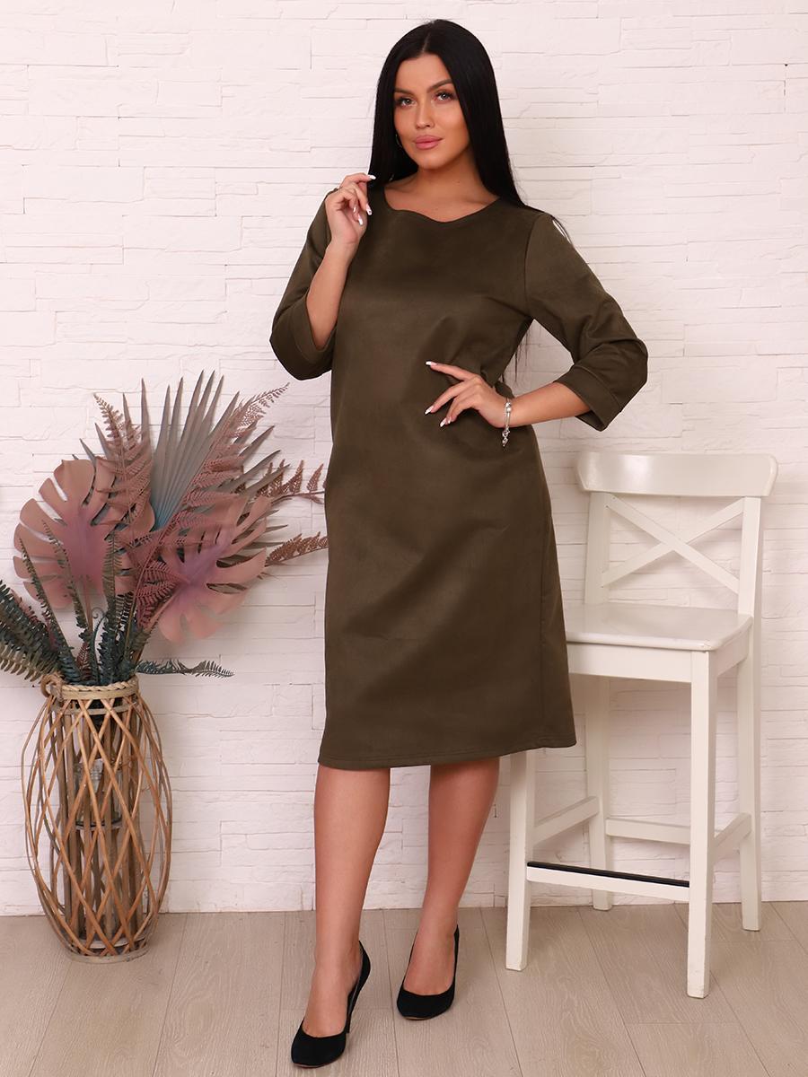 Платье прямого силуэта из замшевой ткани с рукавом ниже локтя. Горловина и низ платья подшиты плоскошовным швом.