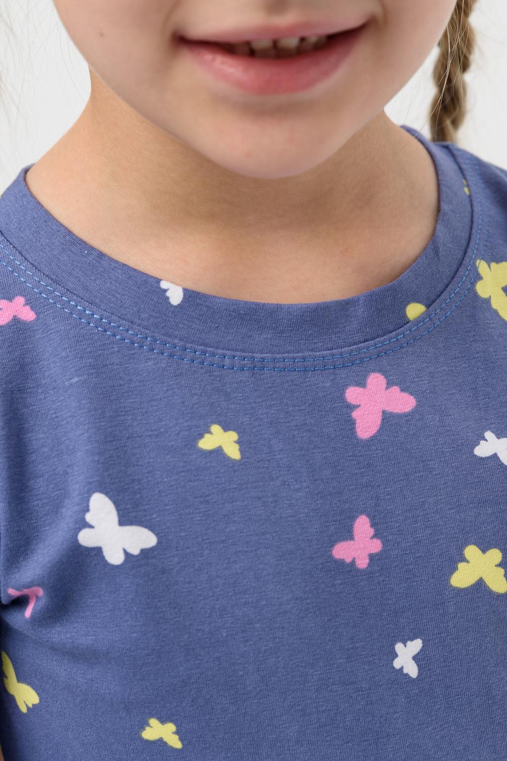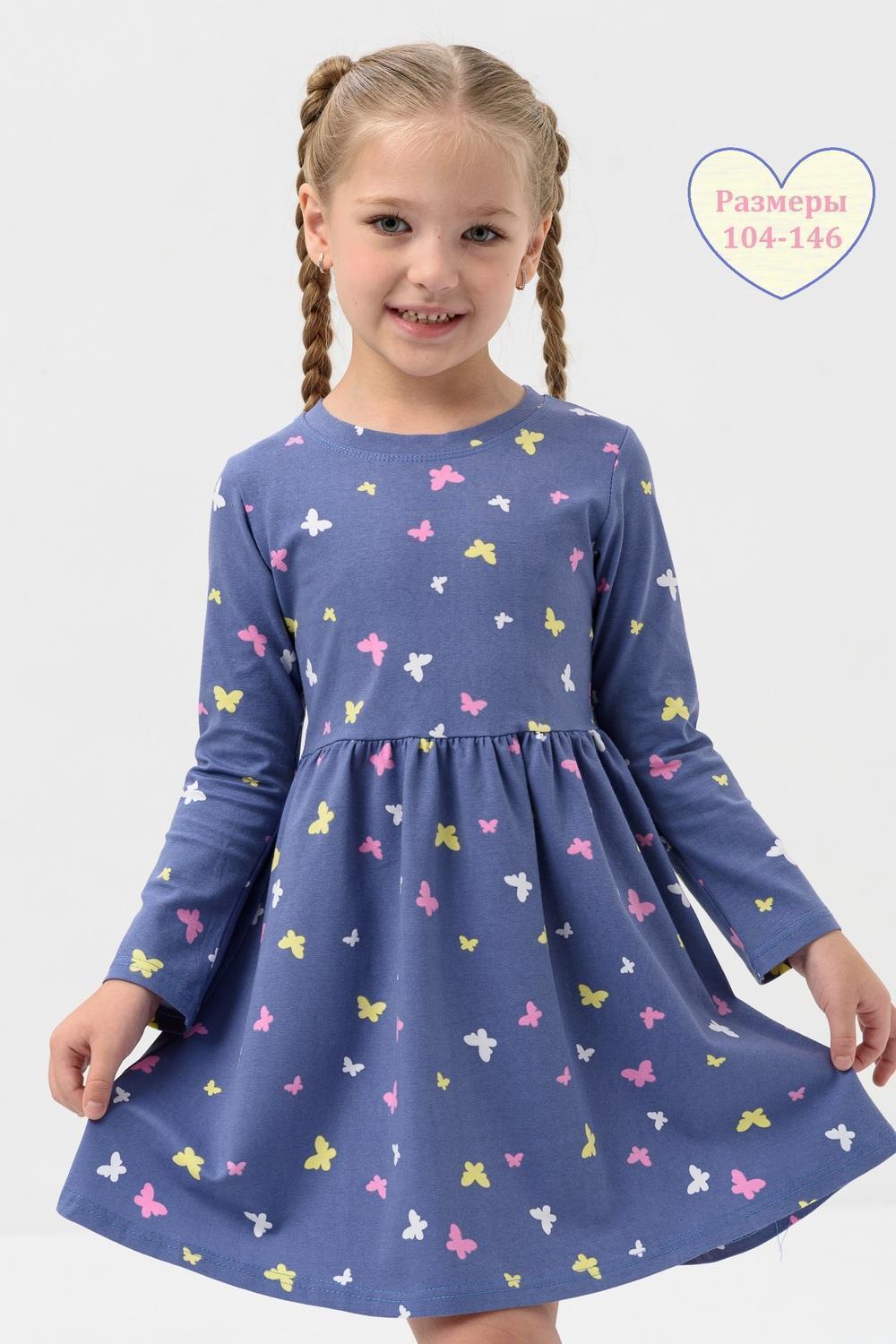 Платье для девочек дошкольного и младшего школьного возраста, из трикотажного полотна кулирка с лайкрой с рисунком. Платье прилегающего силуэта, отрезное и расклешенное от линии талии, с втачным длинным одношовным рукавом, с обтачкой в горловине. Низа рукавов и нижней части платья подогнуты. По шву втачивания обтачки в горловину проложена отделочная строчка.