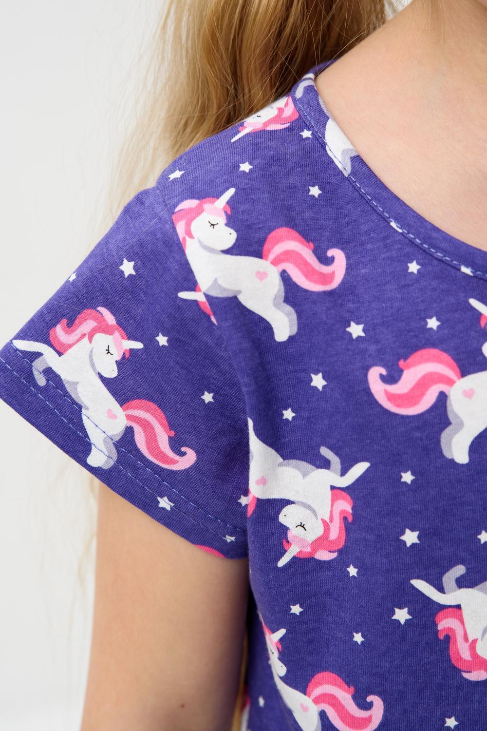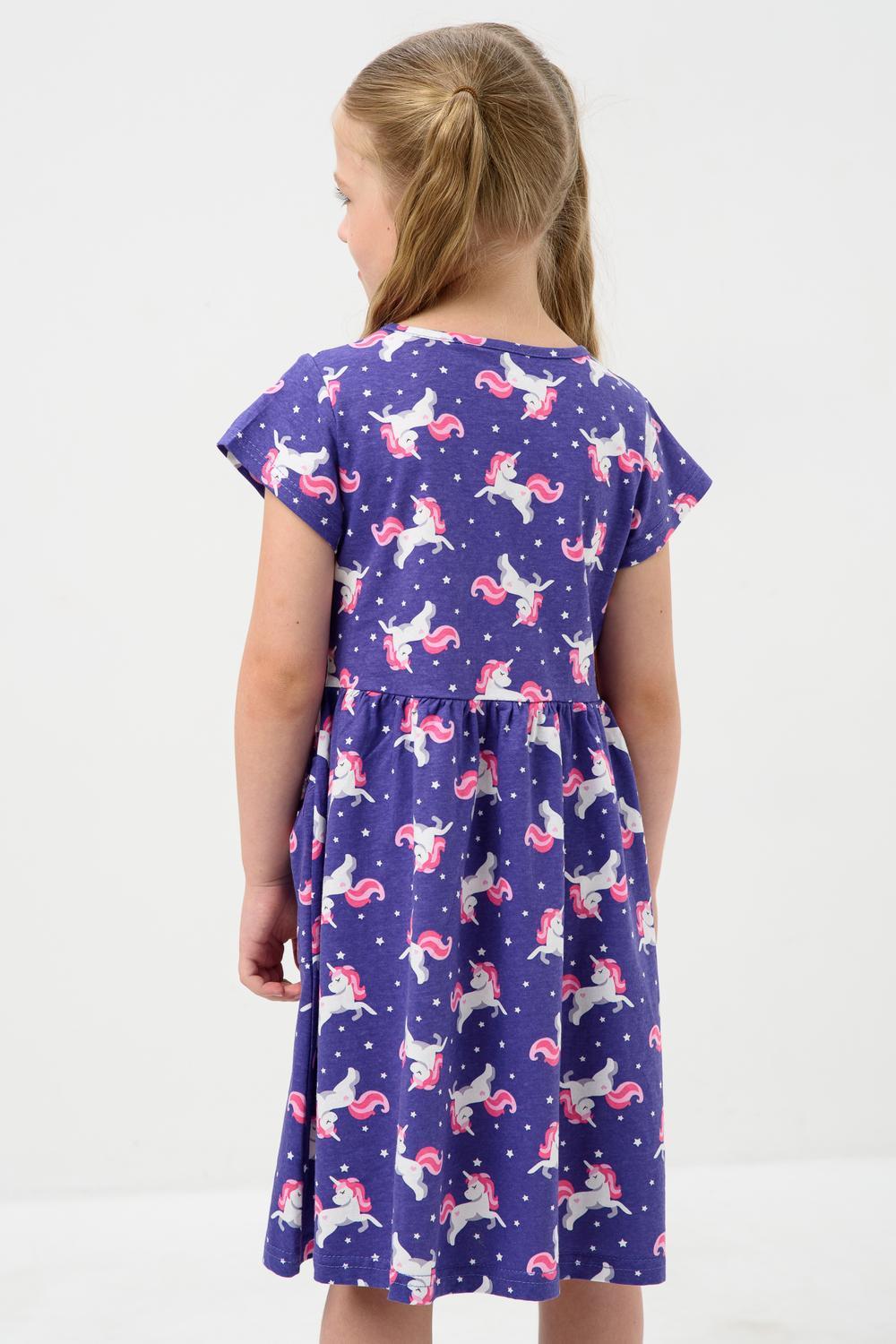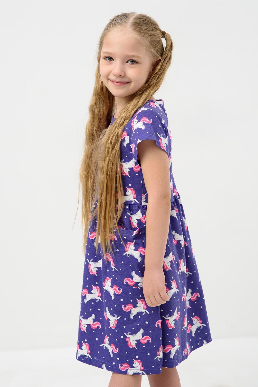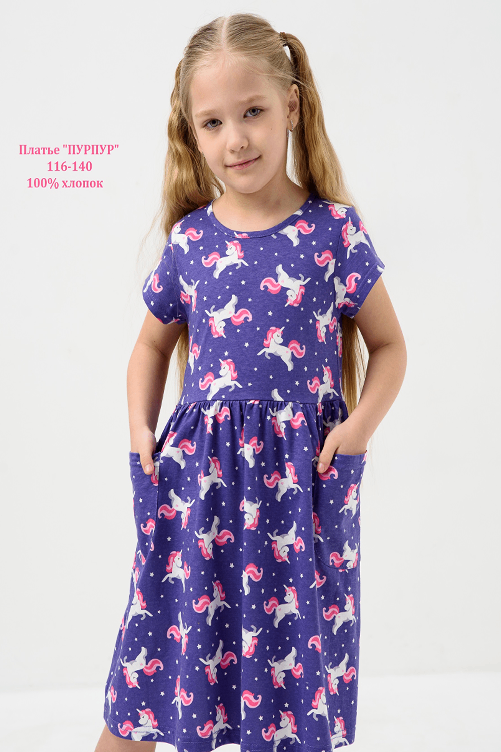Платье для девочек дошкольного и младшего школьного возраста, из трикотажного полотна с рисунком. Платье прилегающего силуэта, отрезное и расклешенное от линии талии, с втачным рукавом, с накладными карманами на нижней части переда. Нижние части переда и спинки присборены. Рукава короткие. Горловина окантована. Низа платья, верхний срез карманов и рукава подогнуты.