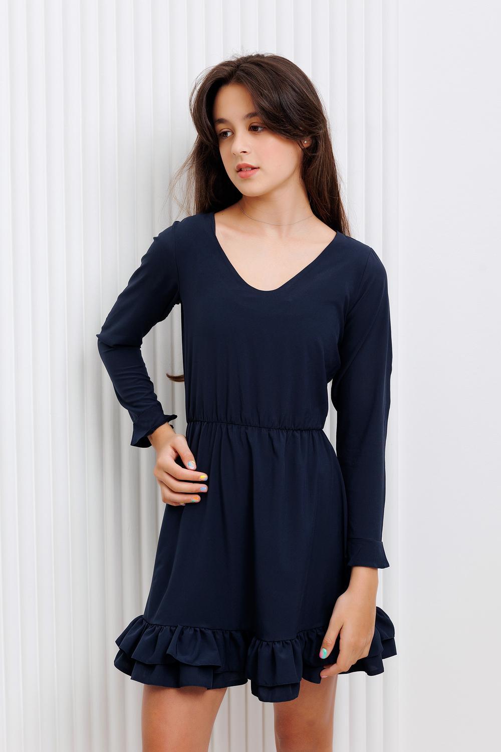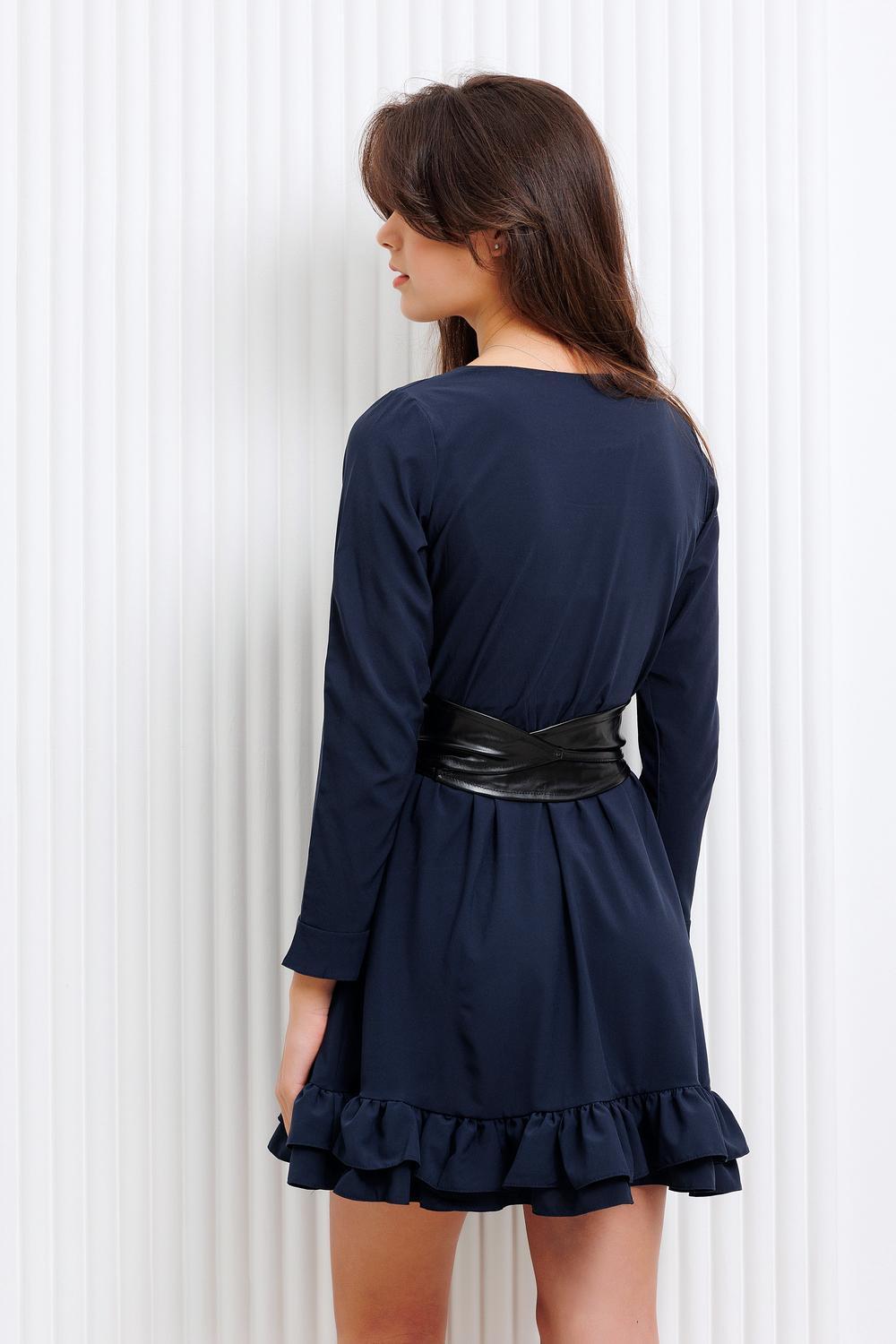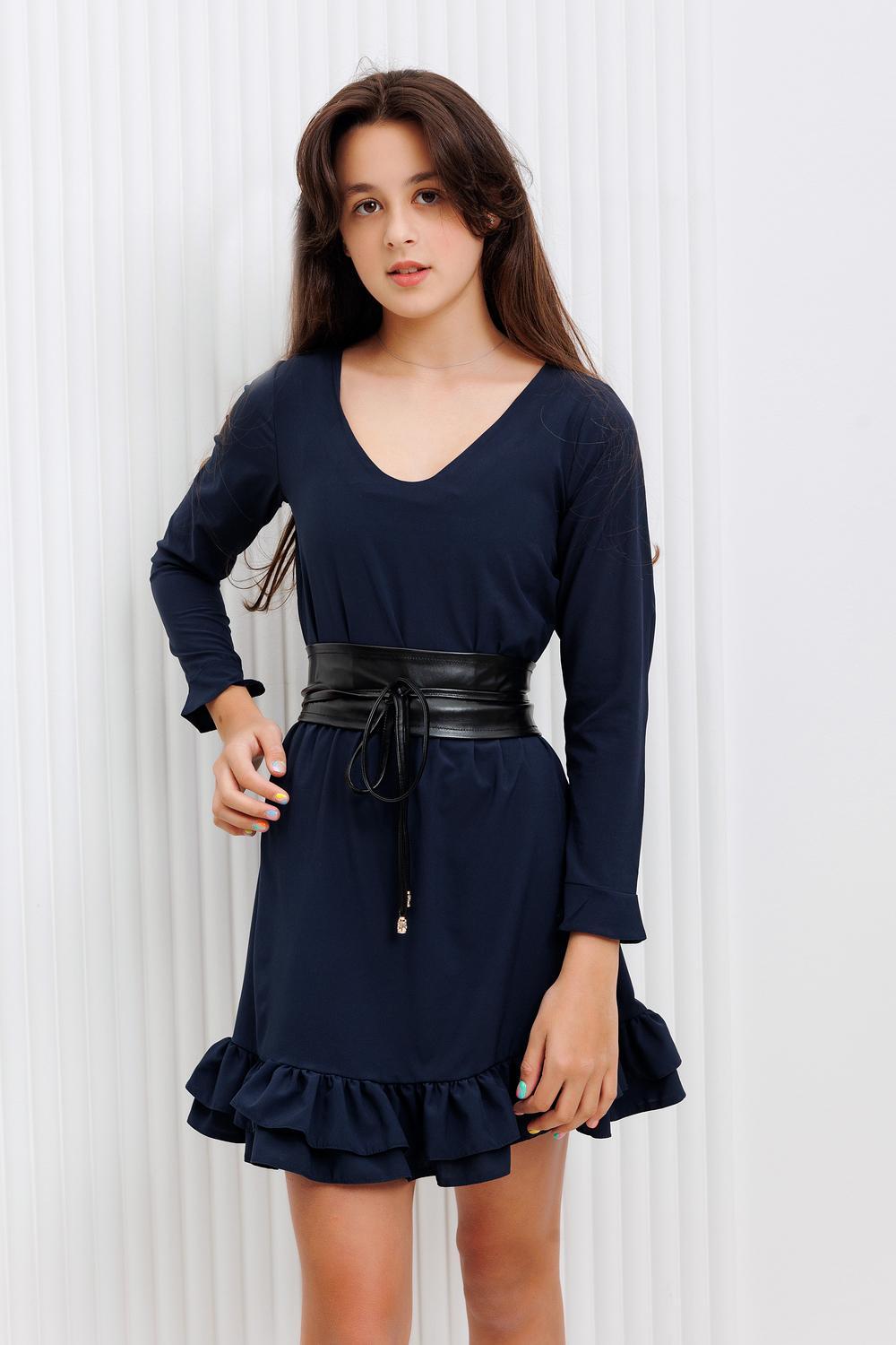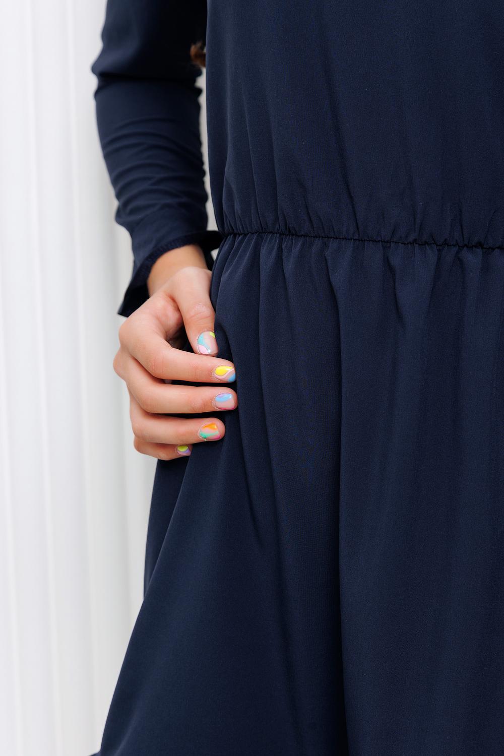 Платье для девочки Raposa темно-синего оттенка отлично подойдет для школьного мероприятия, такого как выпускной или последний звонок. Оно сочетает в себе требования школьной формы и при этом имеет стильный и элегантный вид. Длинный рукав оформленный воланом, оригинальный подол. Два пояса в комплекте позволят изменить общий образ и подчеркнуть талию. Учитывайте индивидуальные предпочтения и особенности фигуры, чтобы выбрать идеальное повседневное платье для девочки. Комплект: платье, пояс (ниагара), пояс (экокожа).
