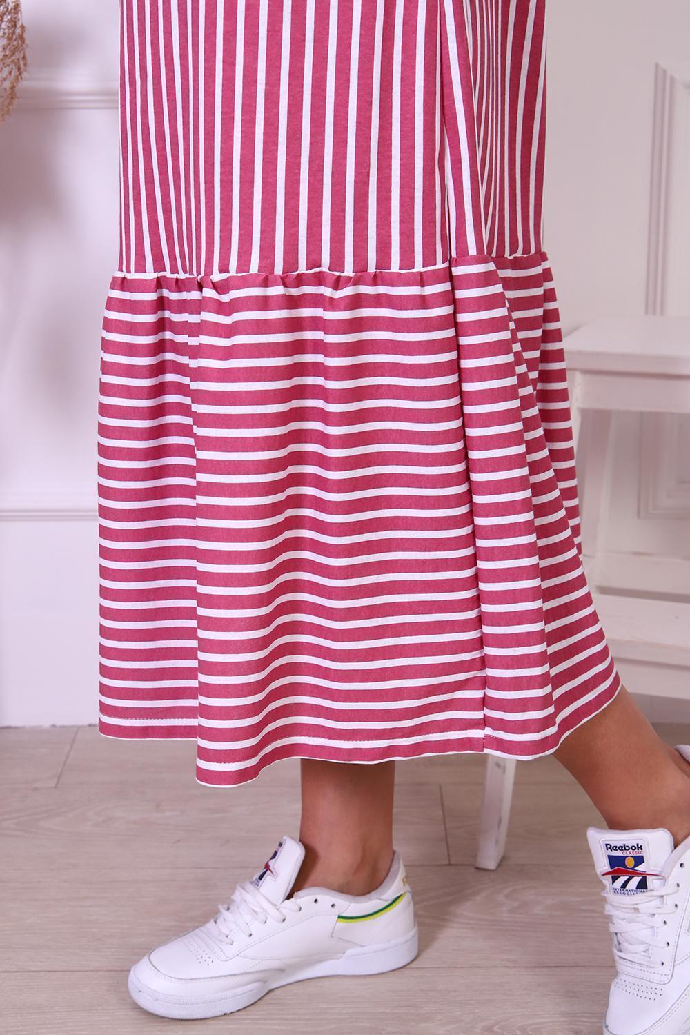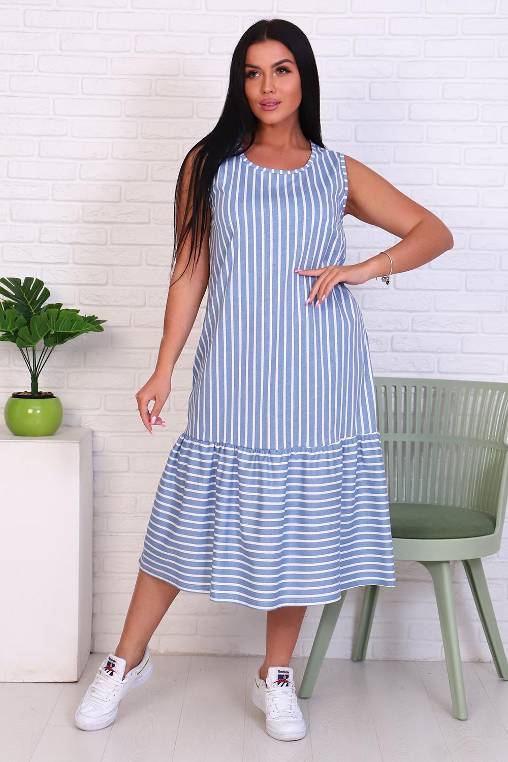 Сарафан женский расширенного силуэта с воланом по низу. Полочка изделия с нагрудными выточками. Горловина изделия округлой формы. Горловина и проймы обработаны окантовкой. Низ сарафана подогнут.