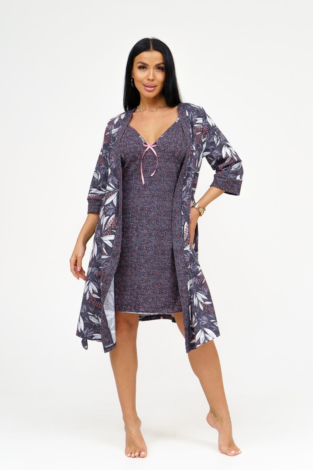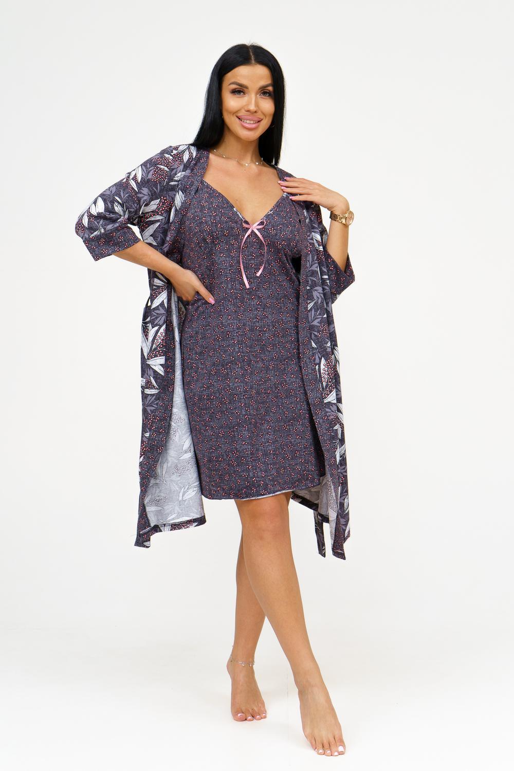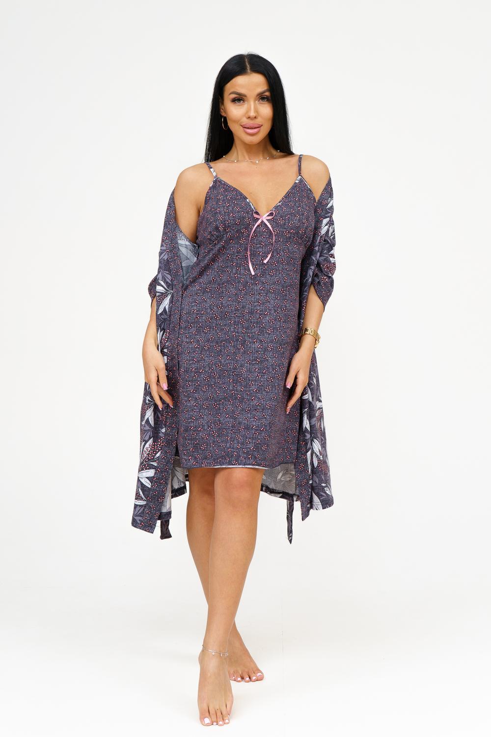 Представляем вашему вниманию изысканный комплект из сорочки и пеньюара, который станет идеальным дополнением к гардеробу каждой женщины. Выполненный из 100% хлопка, этот комплект обеспечивает комфорт и стиль, позволяя чувствовать себя уверенно и привлекательно. Основные характеристики: Сорочка на тонких бретелях: Элегантная сорочка с отрезными чашками обеспечивает идеальную посадку и поддержку. Удобные тонкие бретели придают образу легкость и изящество. Декор в виде бантика: Вырез сорочки украшен нежным бантиком, добавляющим романтичности и игривости в образ. Это делает сорочку не только удобной, но и привлекательной. Запашной пеньюар: Пеньюар с втачным рукавом длиной ¾ на манжете обеспечивает удобство и свободу движений. Он идеально дополняет сорочку, создавая гармоничный и стильный комплект. Подчеркнутая линия талии: Пояс на пеньюаре акцентирует внимание на линии талии, придавая силуэту женственность и элегантность. Качественный материал: Изготовленный из кулирки, 100% хлопка, комплект обеспечивает отличную воздухопроницаемость и комфорт при носке, идеально подходя для домашнего использования. Широкий размерный ряд: Доступен в размерах 46-56, что позволяет каждой женщине найти идеальный вариант для себя. Этот комплект из сорочки и пеньюара станет отличным дополнением к вашему ассортименту и привлечет внимание клиентов, ищущих стильную и комфортную домашнюю одежду. Заказывайте оптом и предложите своим покупателям уникальный вариант для уютных вечеров и романтических моментов!