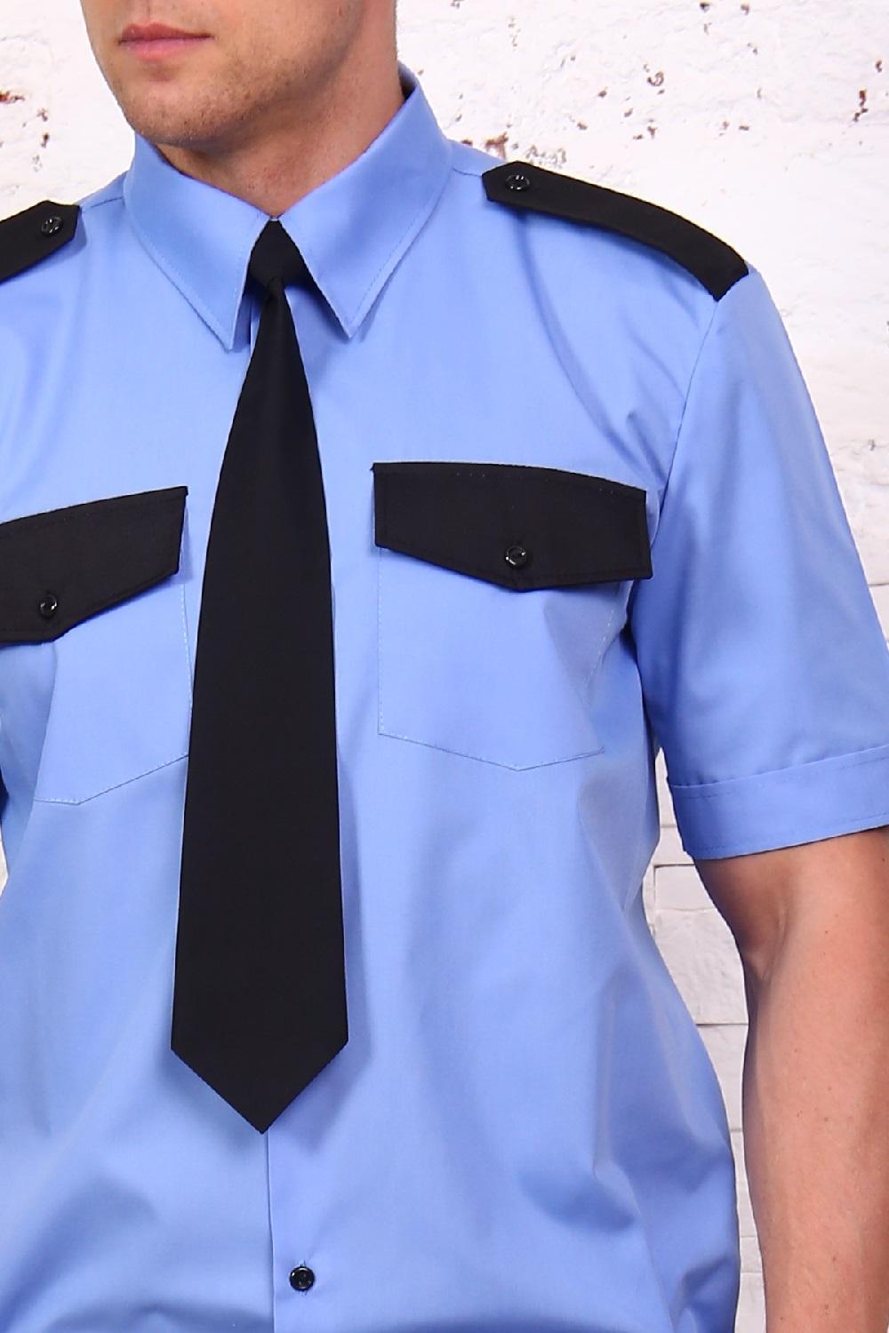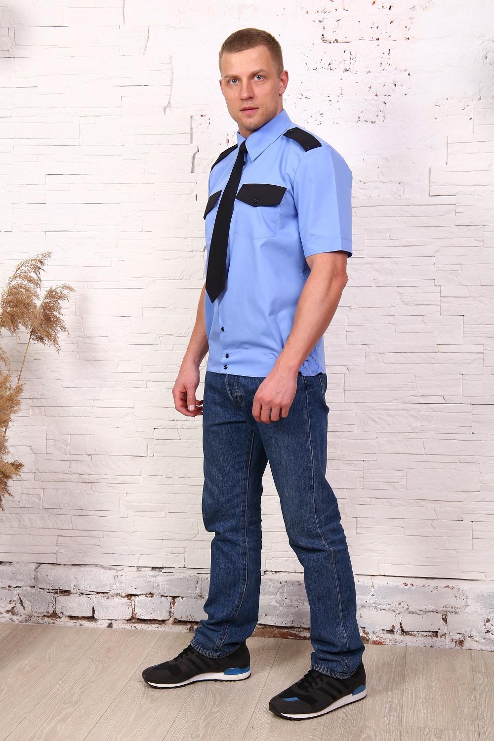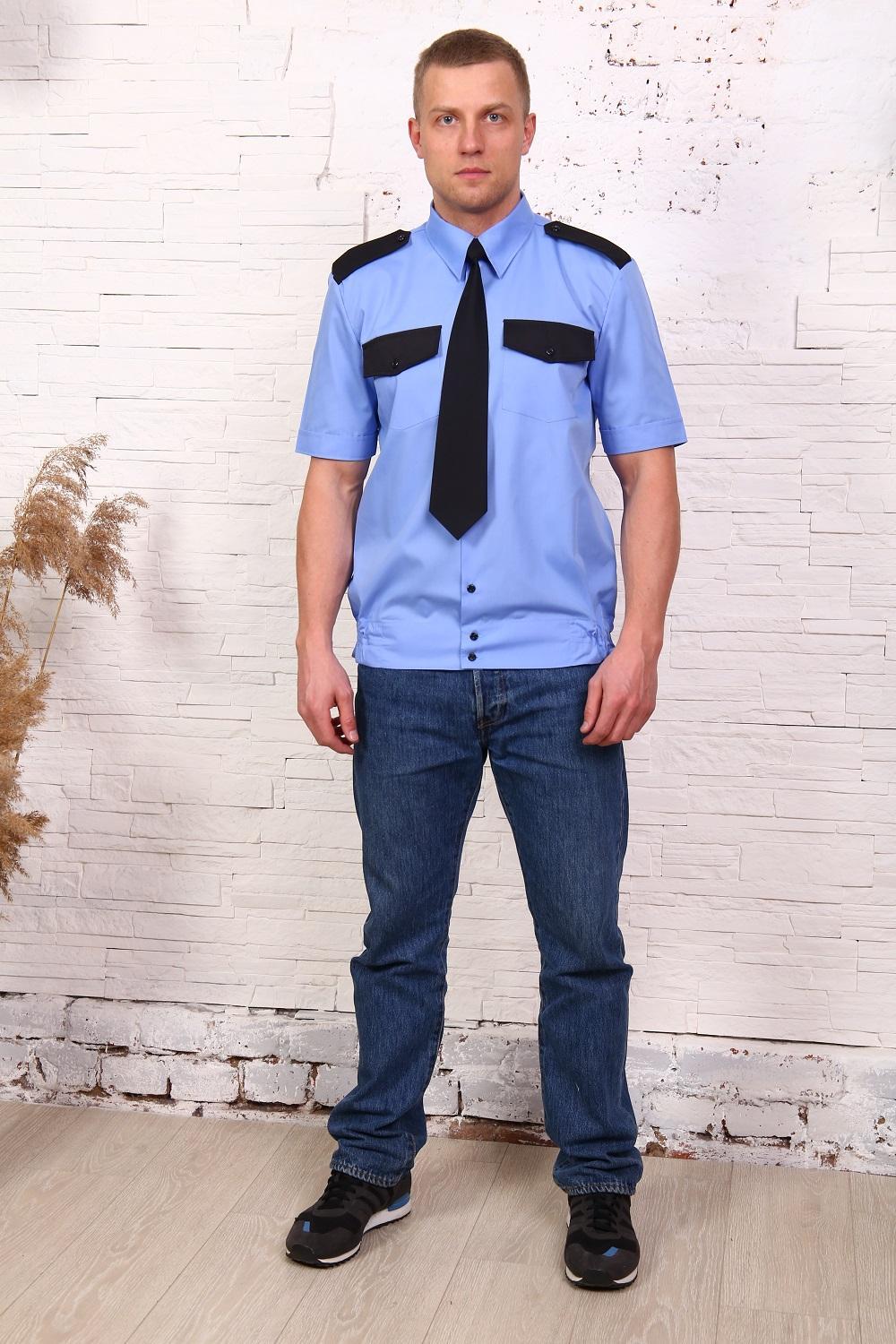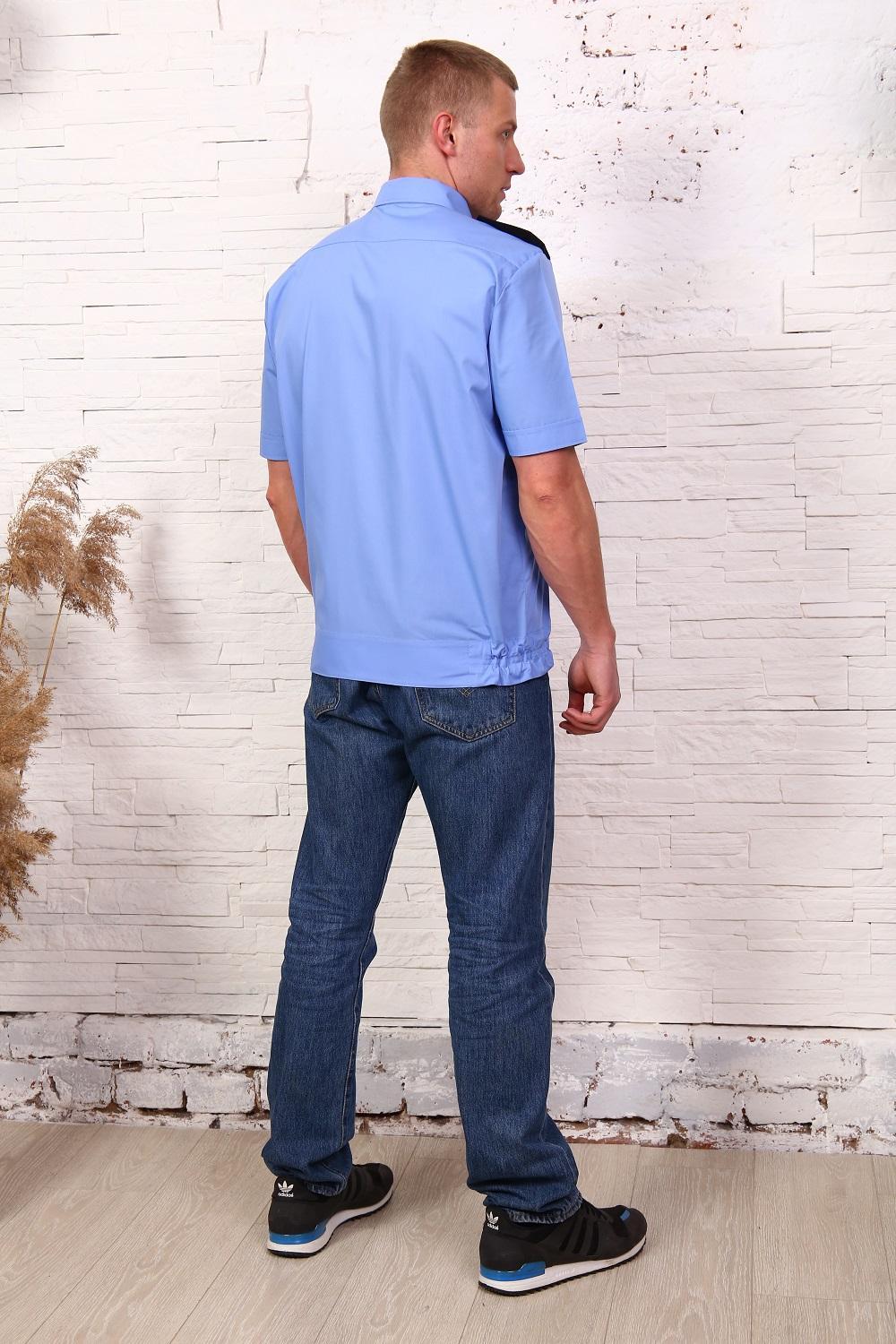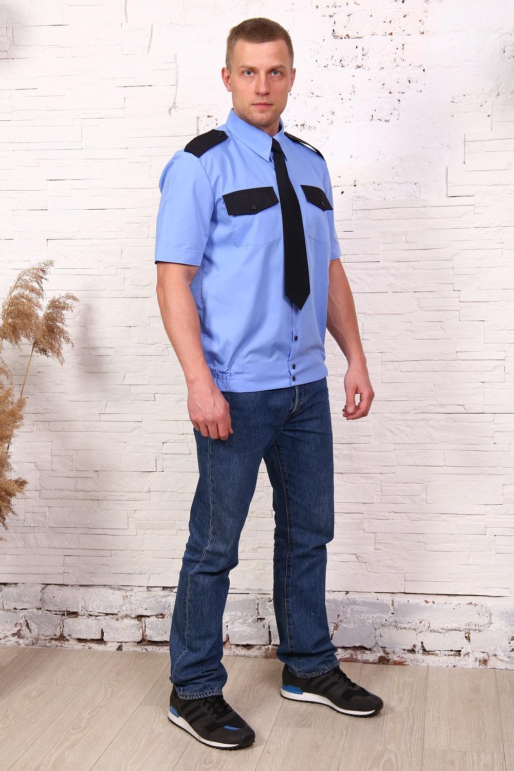 Рубашка охранника мужская, на поясе, короткий рукав, два нагрудных кармана, погоны. Ткань - тиси. Легко утюжится, низкая сминаемость, износостойкая ткань.