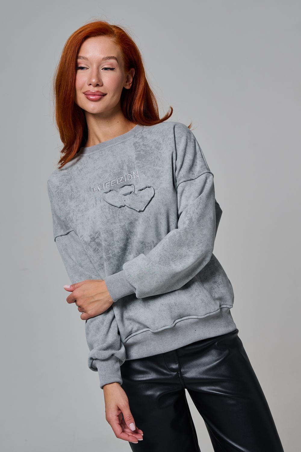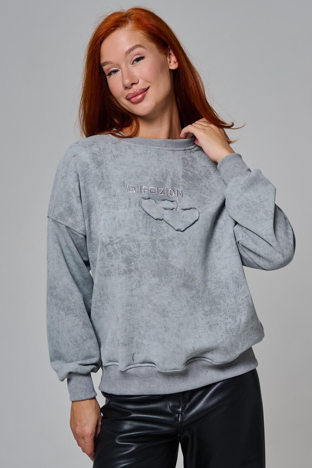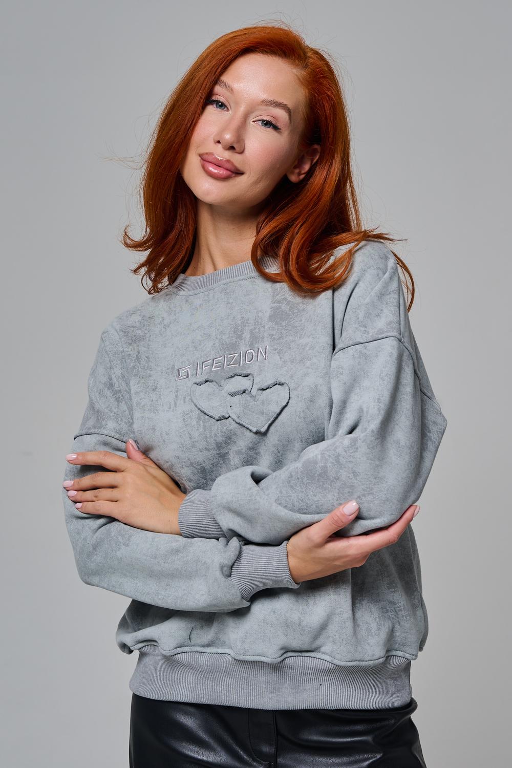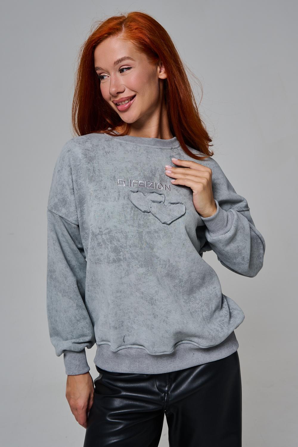 Толстовка женская оверсайз с вышивкой на полочке. Горловина, пояс, манжеты из кашкорсе в цвет основной ткани. Вверху по центру спинки - элемент в виде сердца.