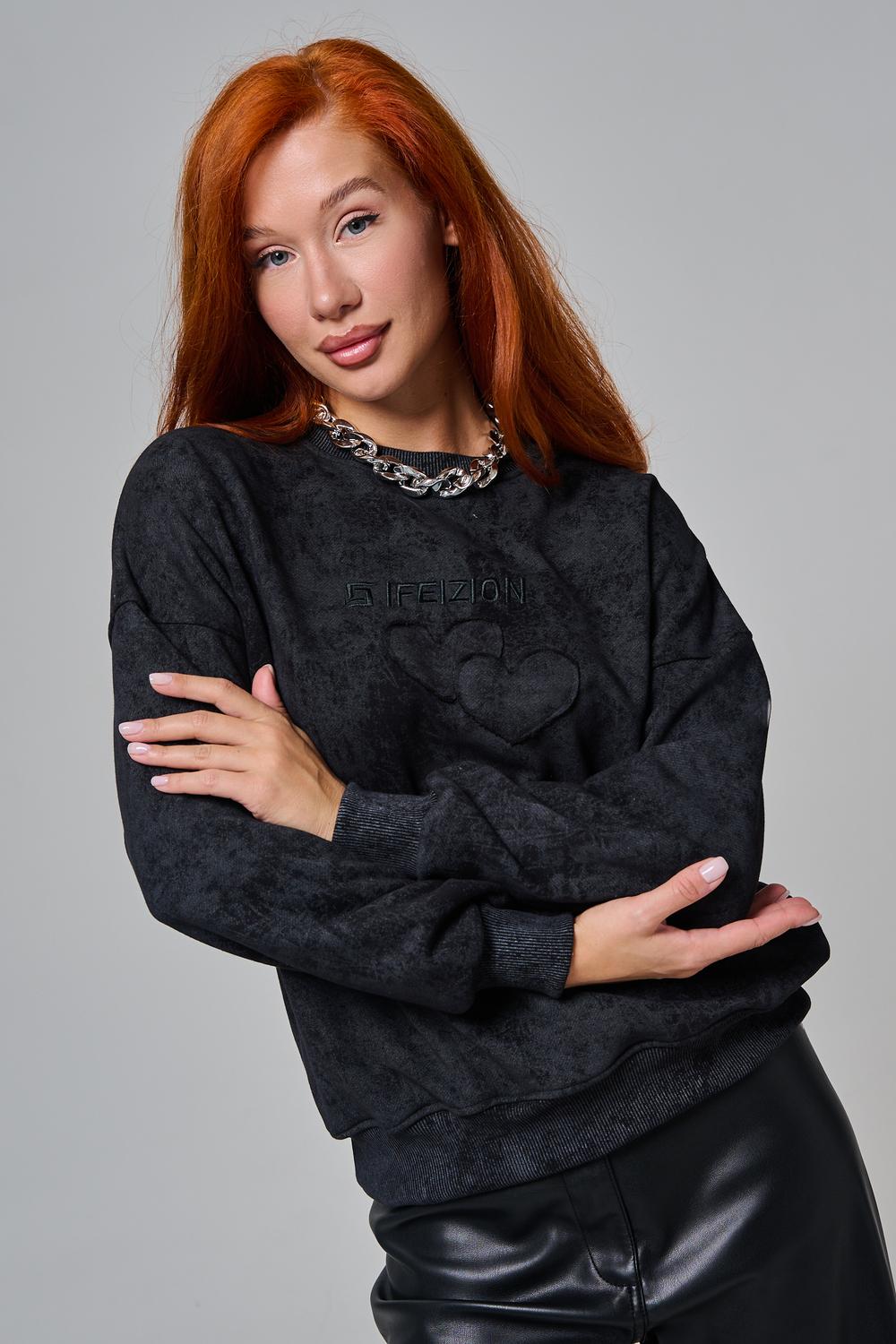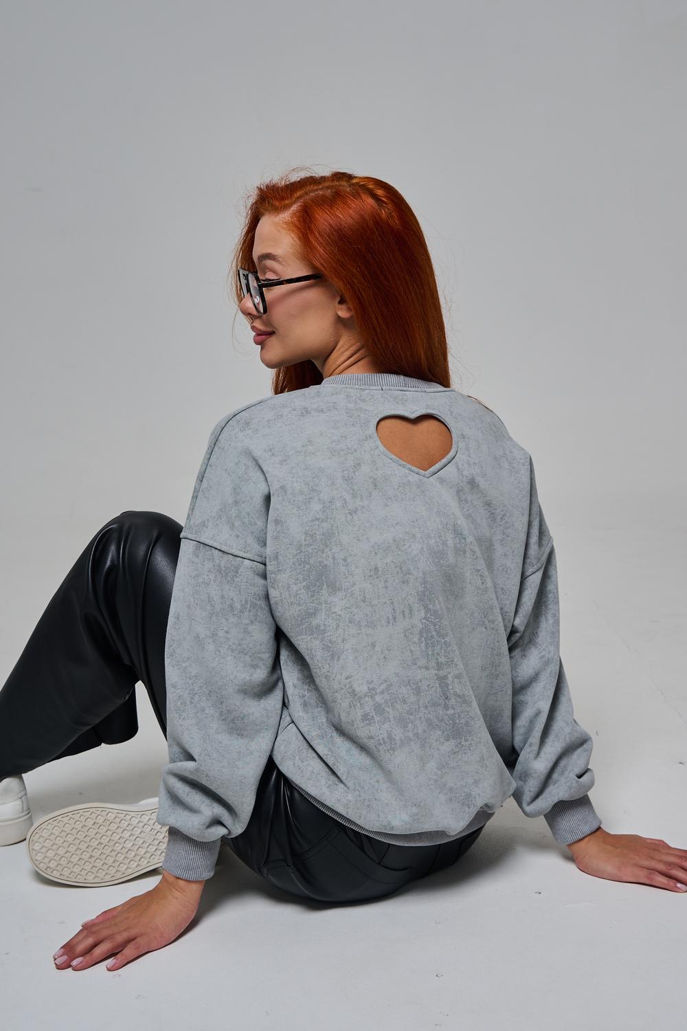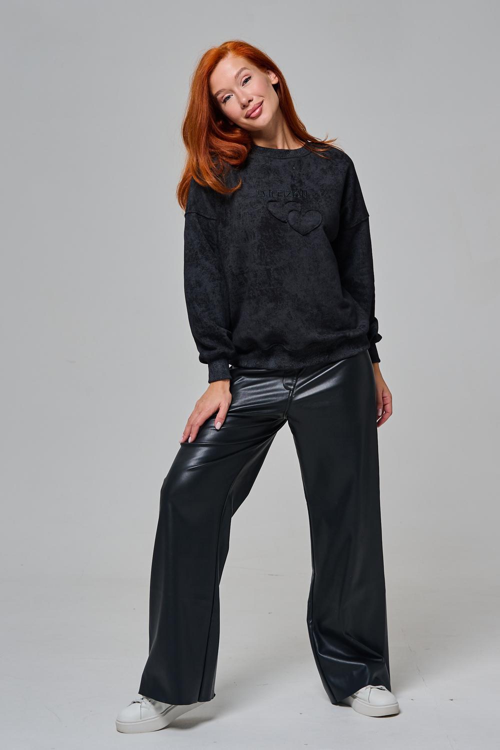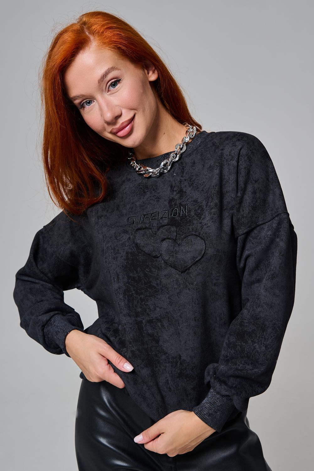 Толстовка женская оверсайз с вышивкой на полочке. Горловина, пояс, манжеты из кашкорсе в цвет основной ткани. Вверху по центру спинки - элемент в виде сердца.