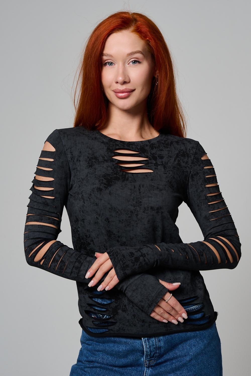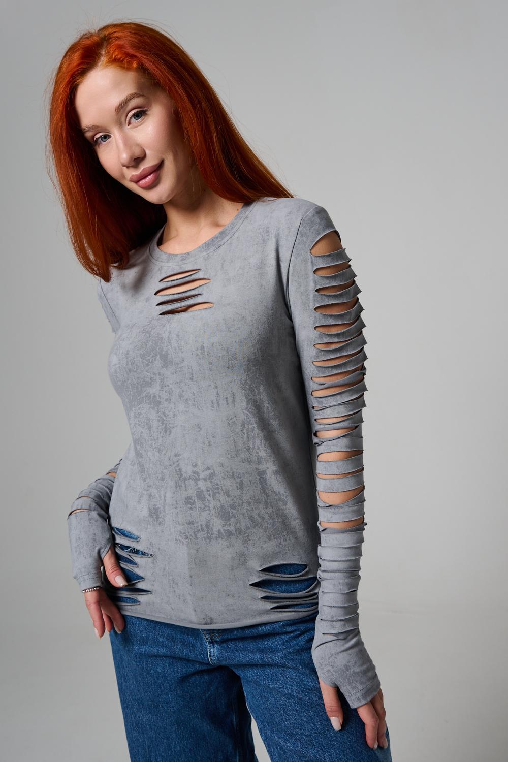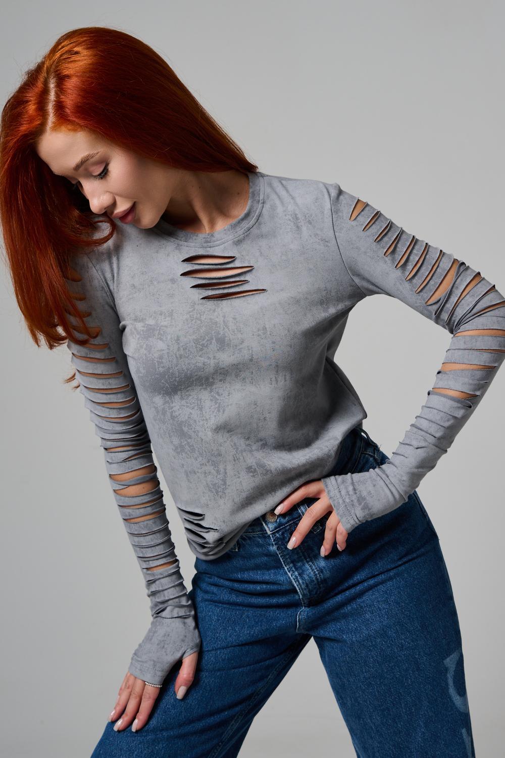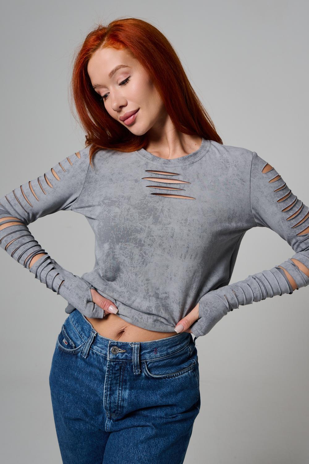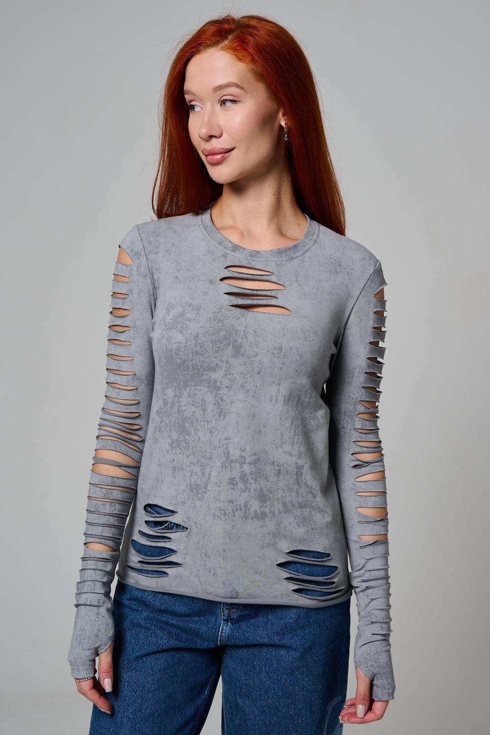 Женский лонгслив с длинными рукавами с из качественного хлопкового трикотажа. Необычный дизайнерский лонгслив с декоративным разрезами станет ярким дополнением к Вашему образу.