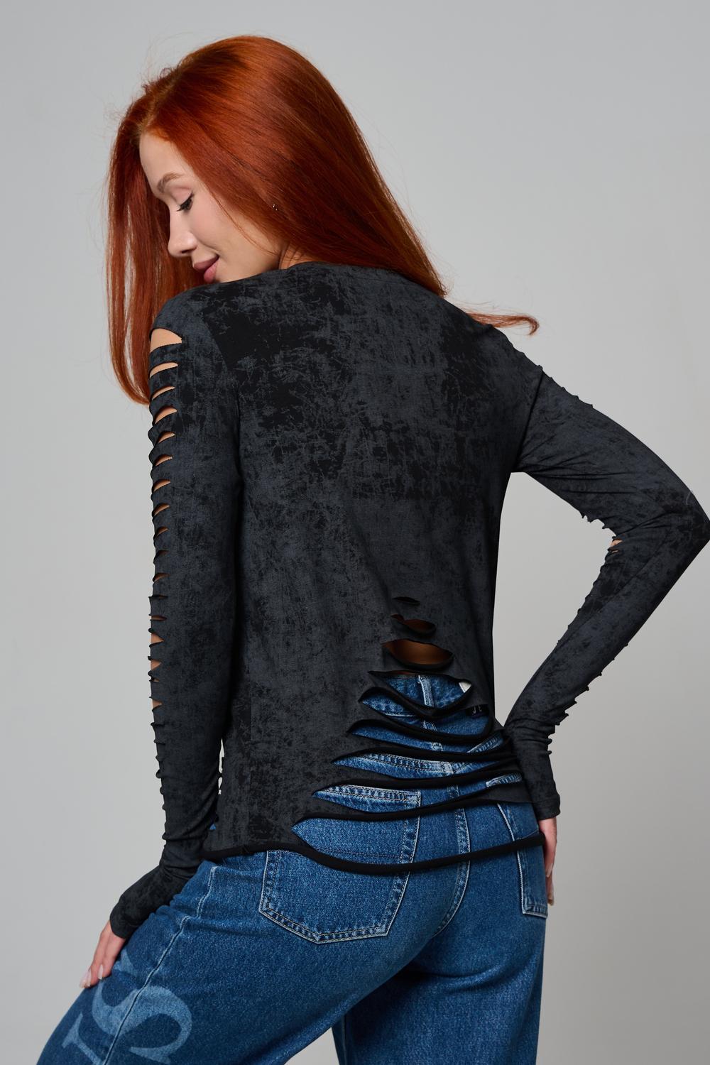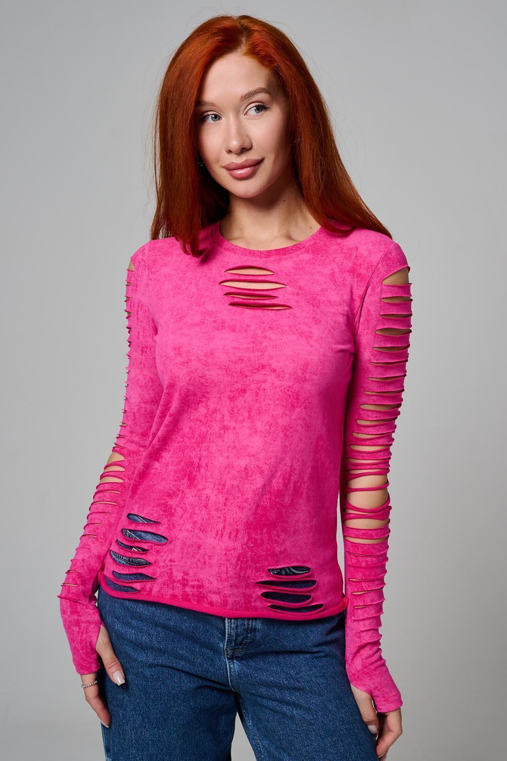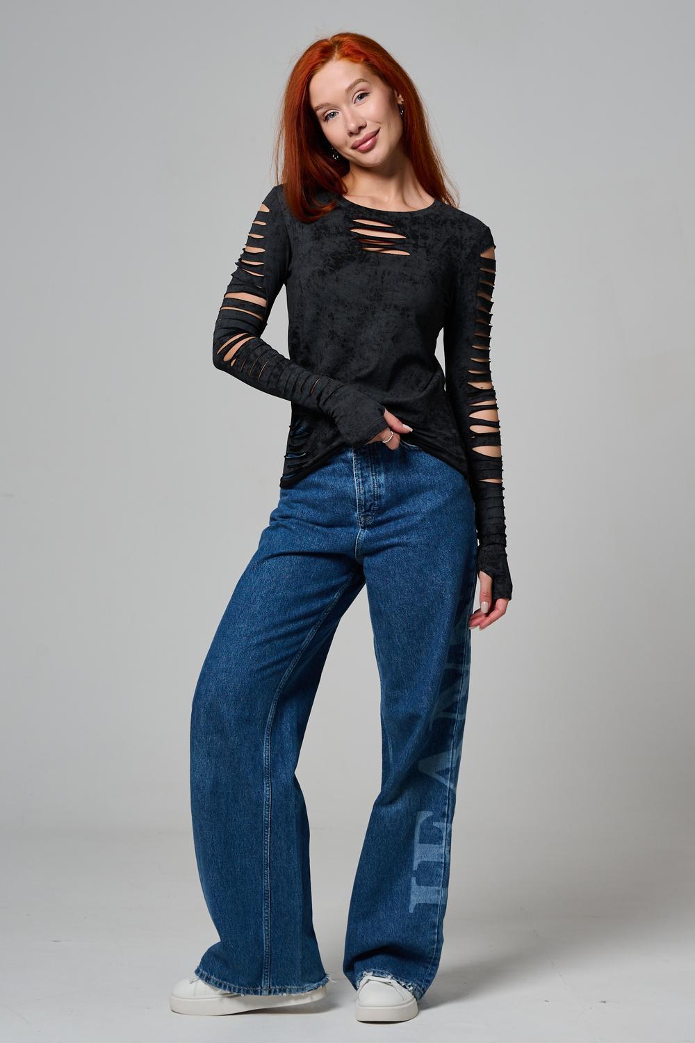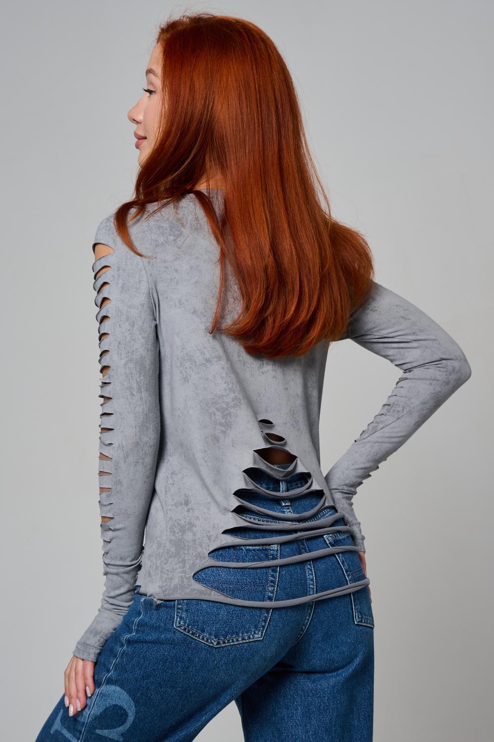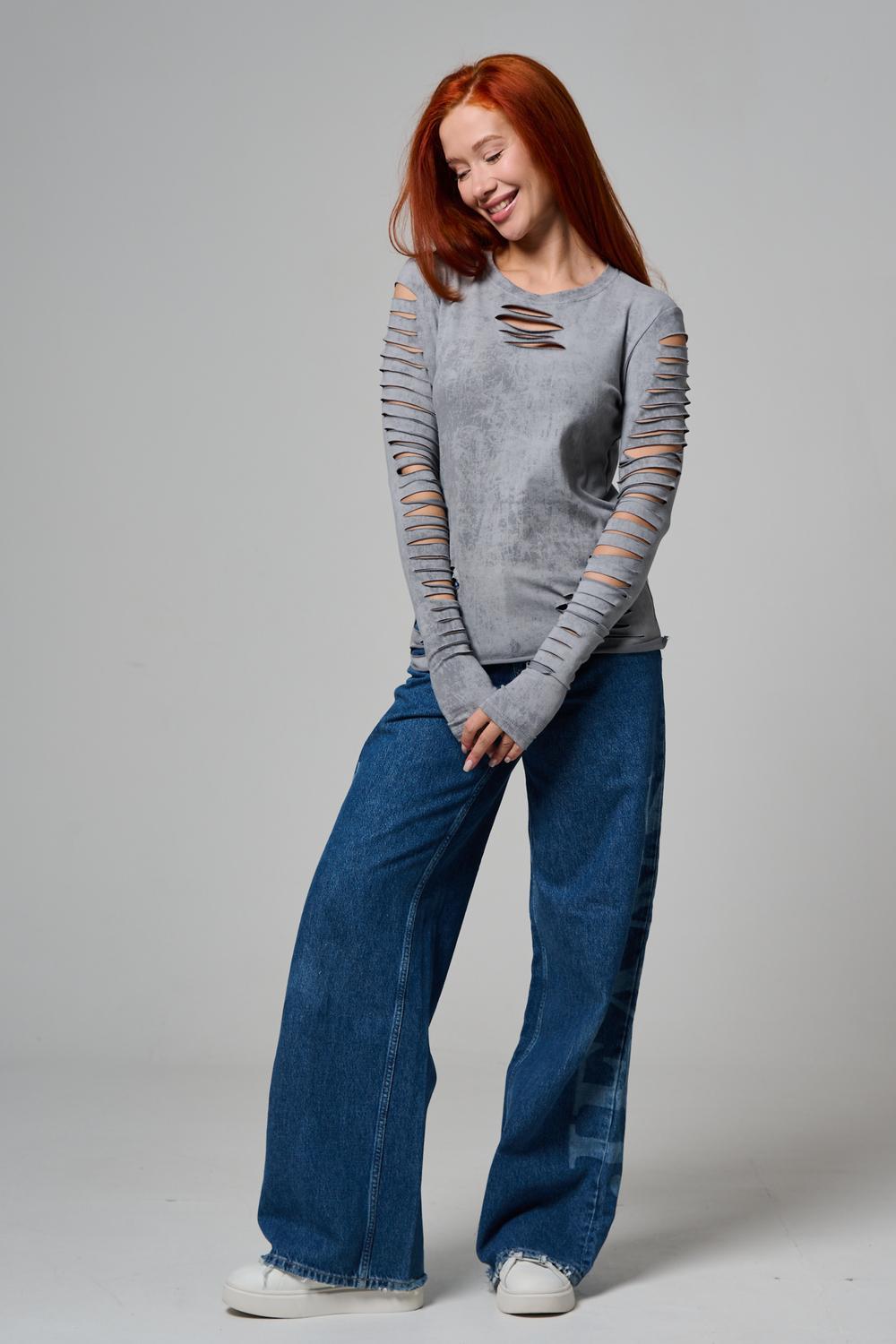 Женский лонгслив с длинными рукавами с из качественного хлопкового трикотажа. Необычный дизайнерский лонгслив с декоративным разрезами станет ярким дополнением к Вашему образу.