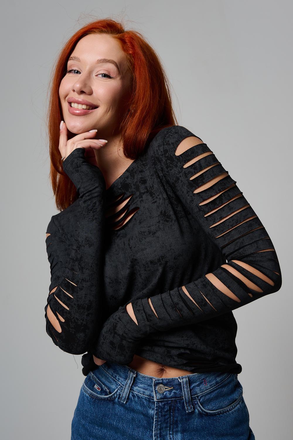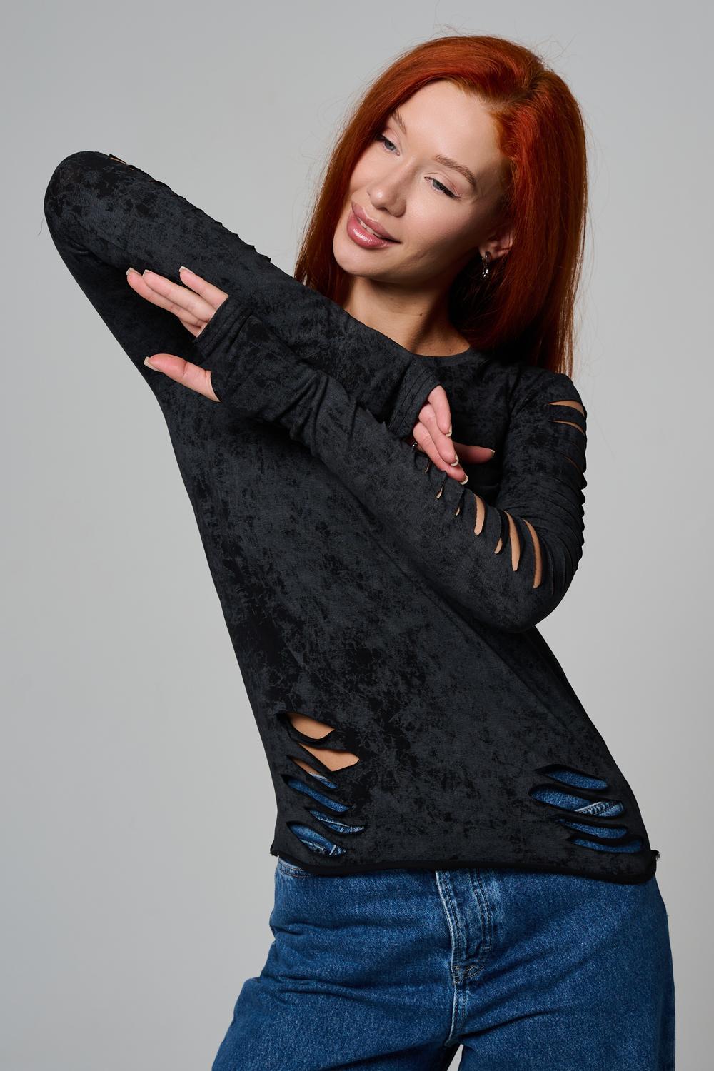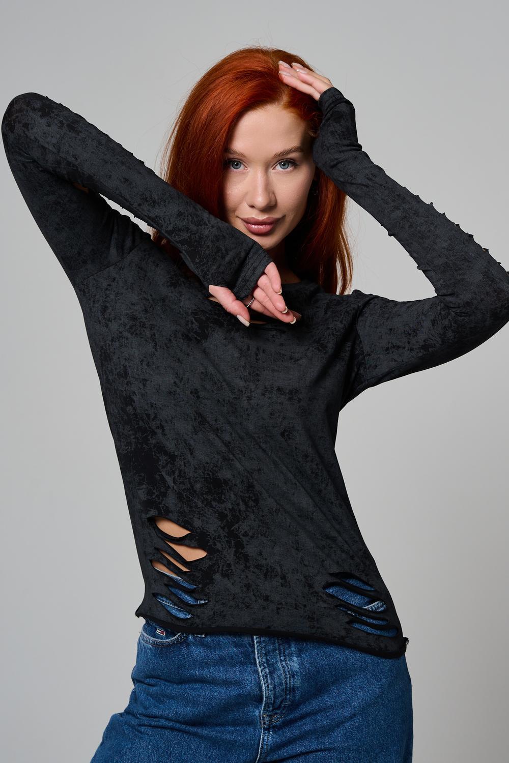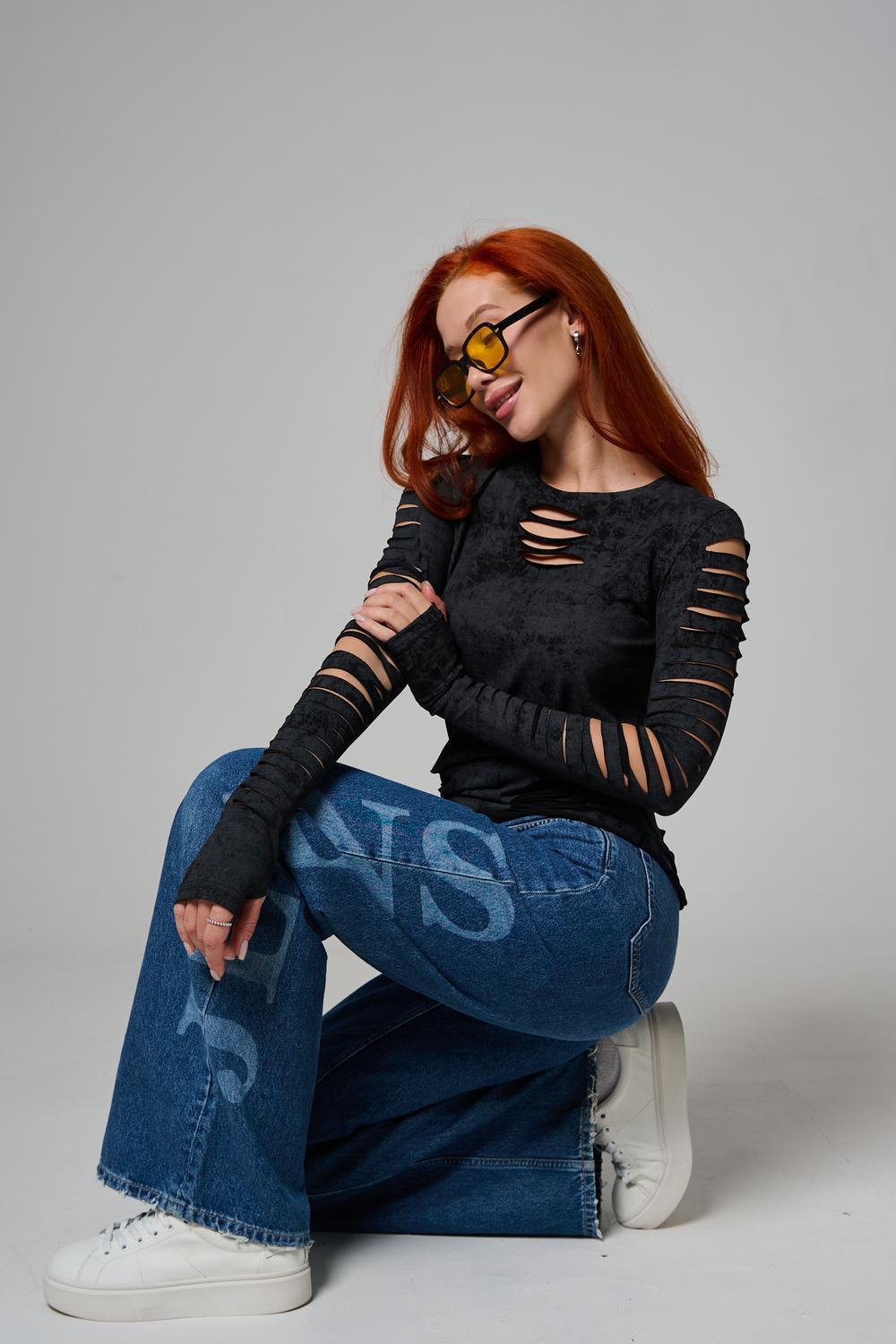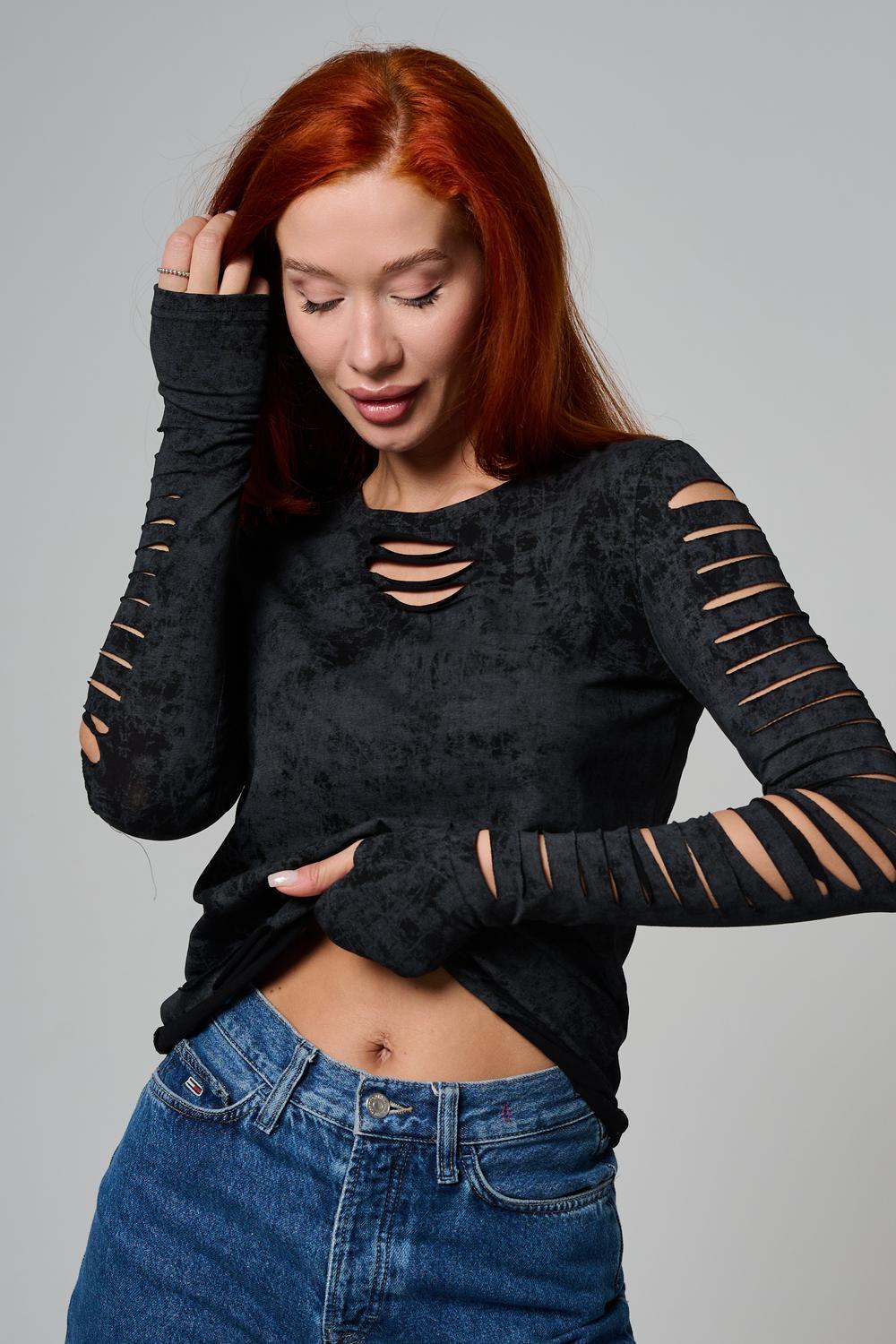 Женский лонгслив с длинными рукавами с из качественного хлопкового трикотажа. Необычный дизайнерский лонгслив с декоративным разрезами станет ярким дополнением к Вашему образу.