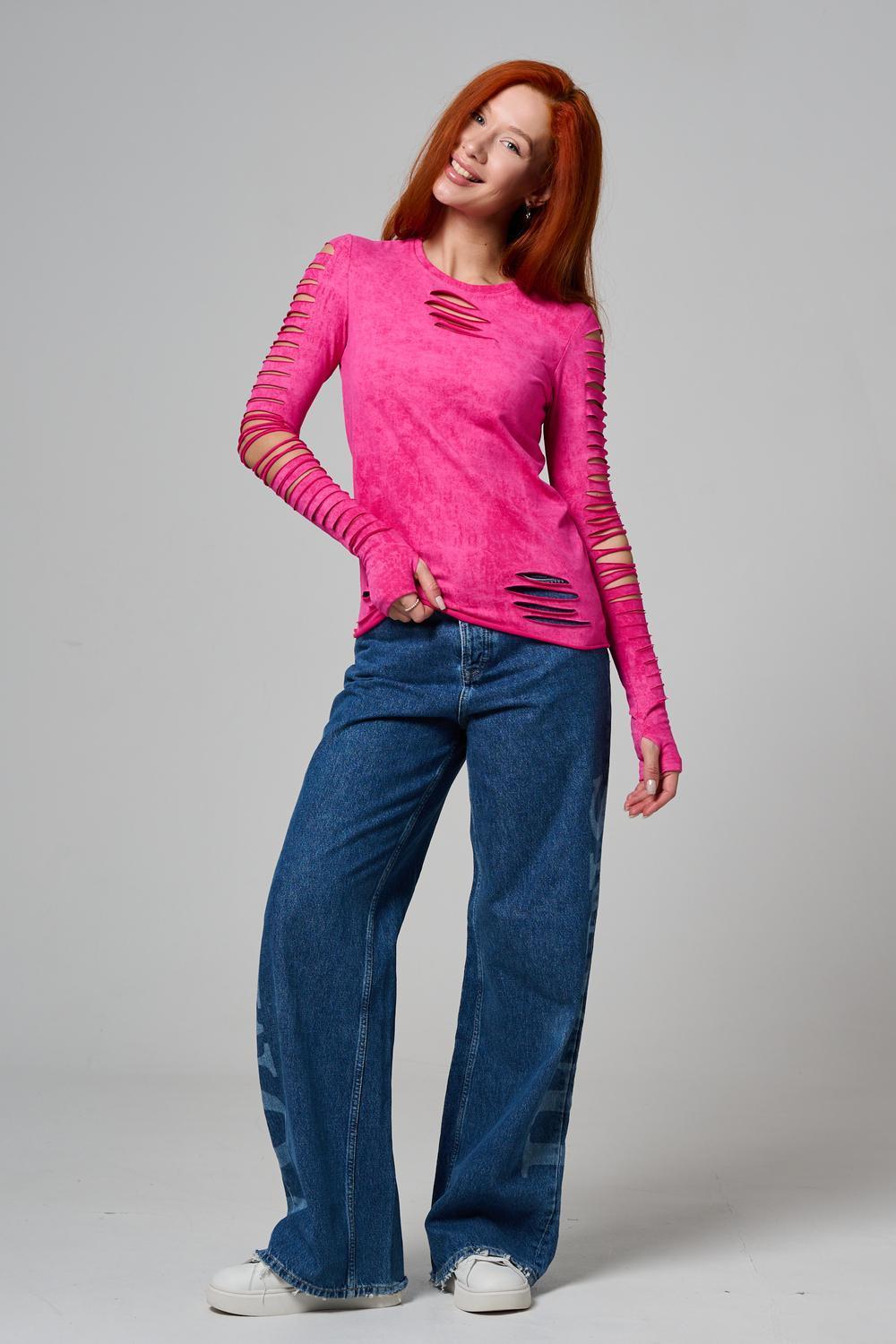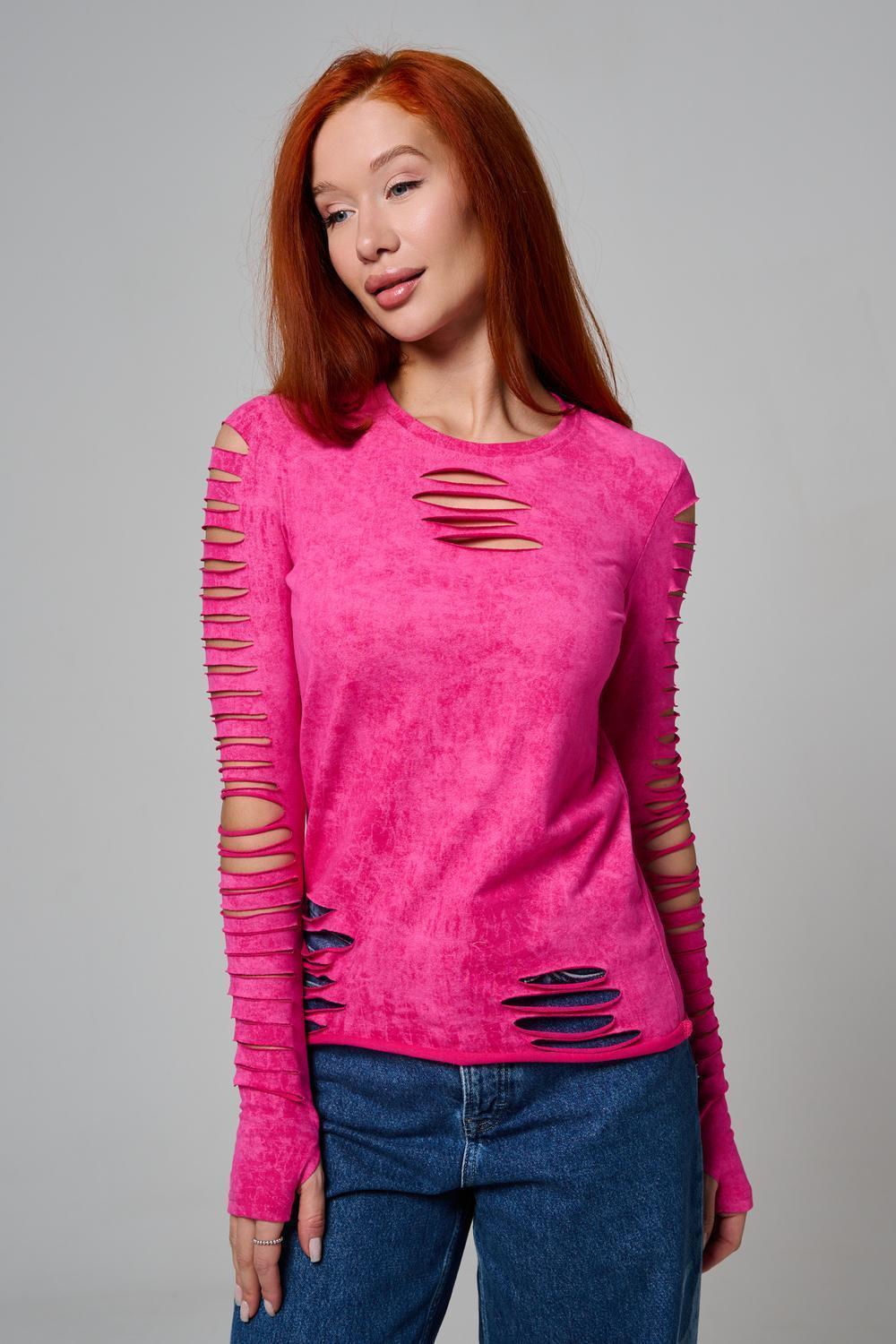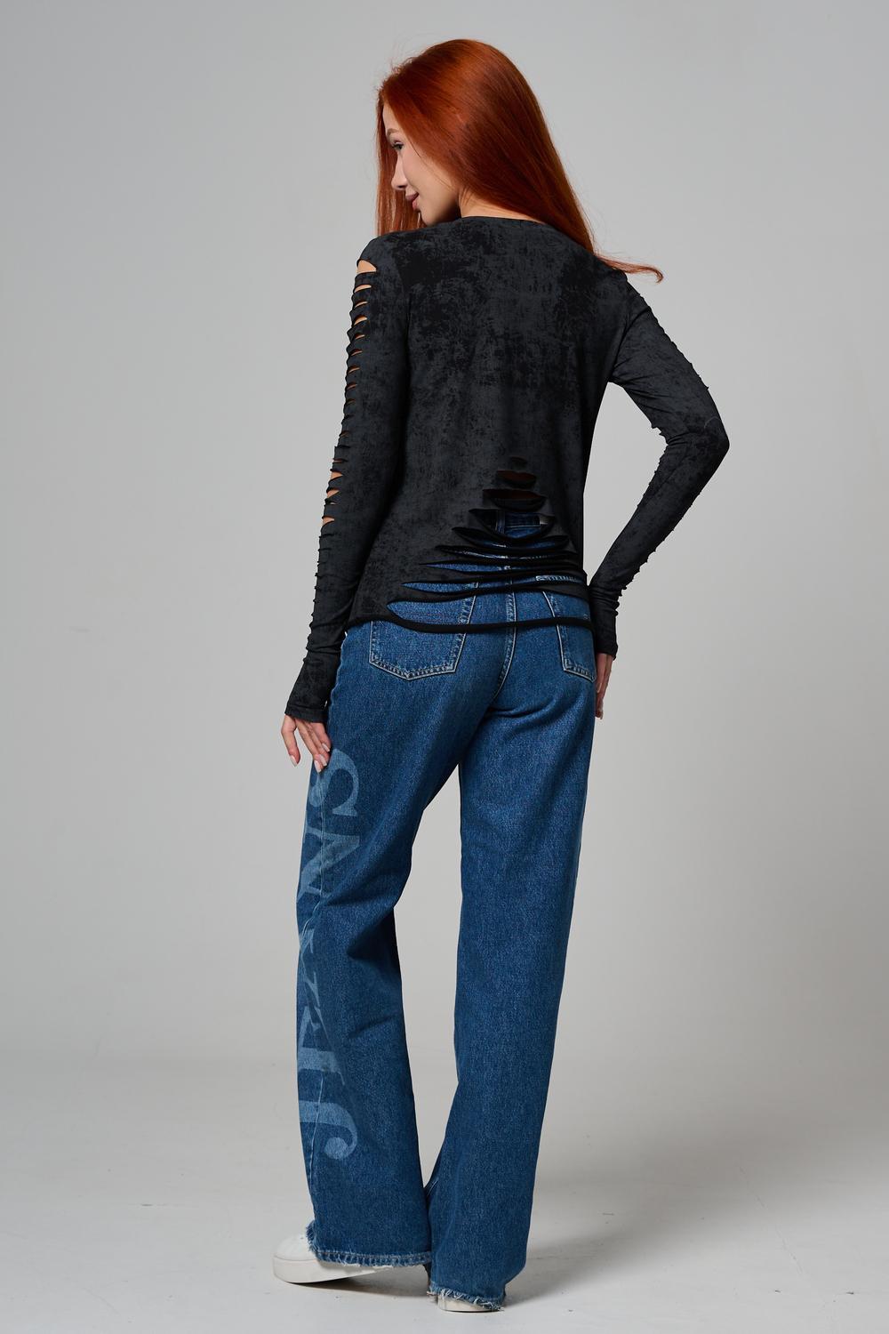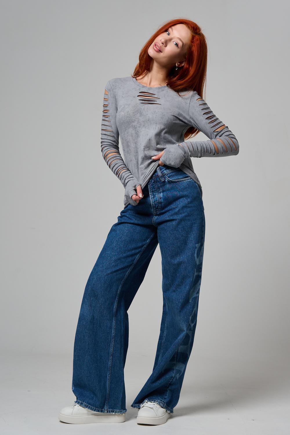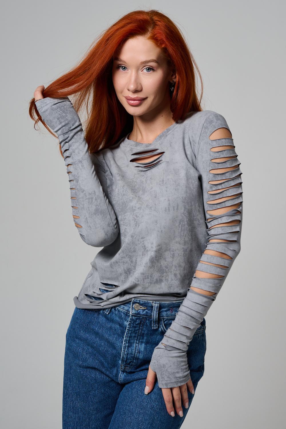 Женский лонгслив с длинными рукавами с из качественного хлопкового трикотажа. Необычный дизайнерский лонгслив с декоративным разрезами станет ярким дополнением к Вашему образу.
