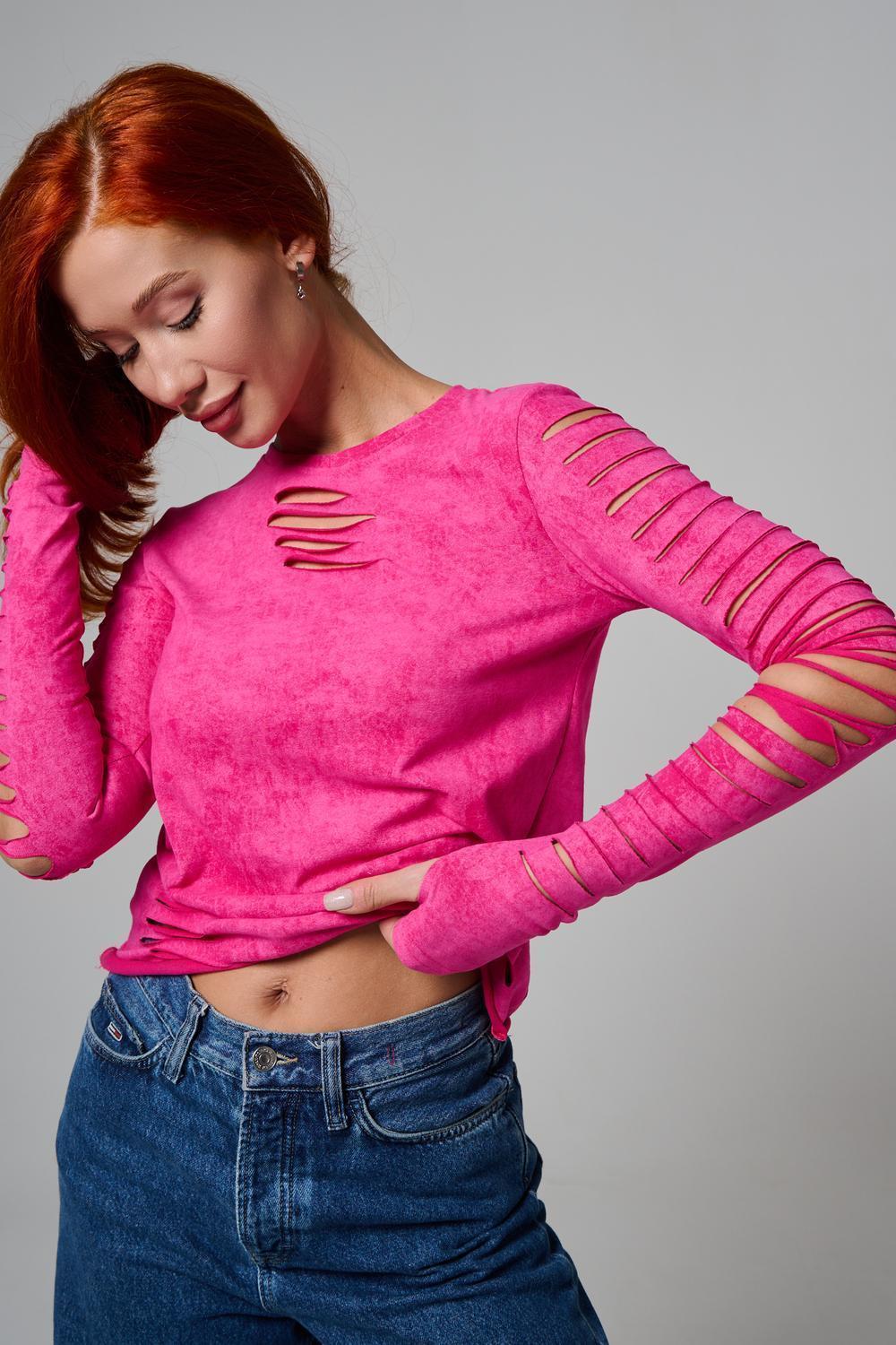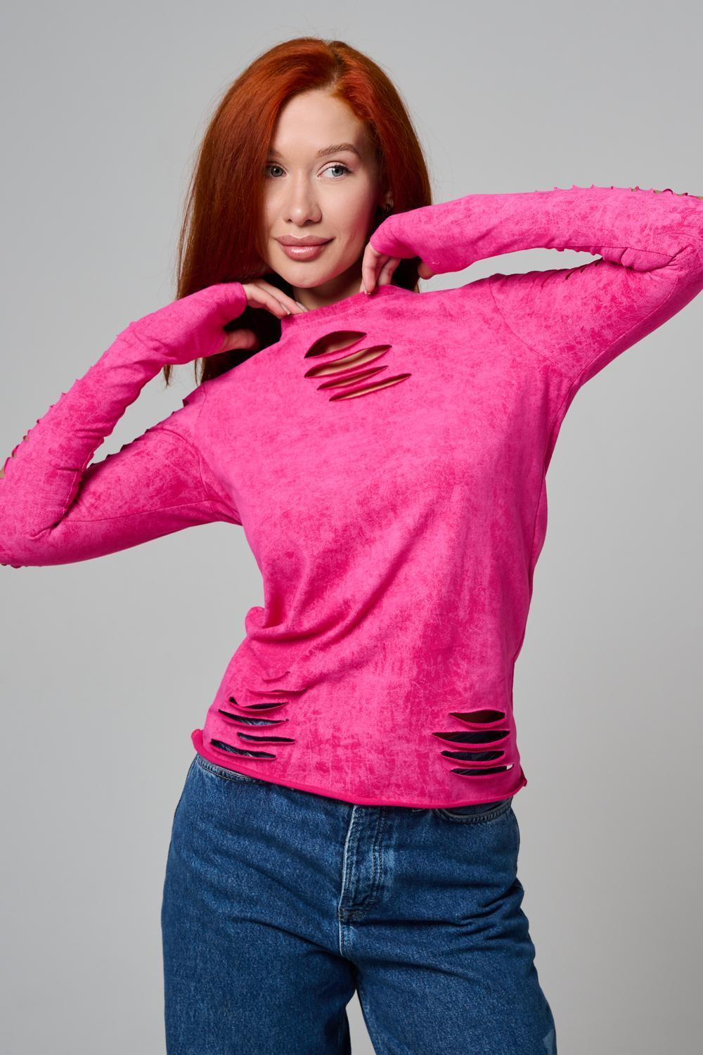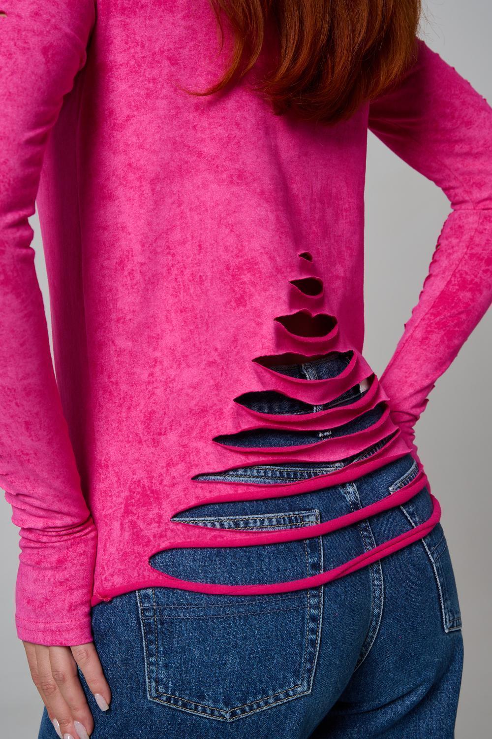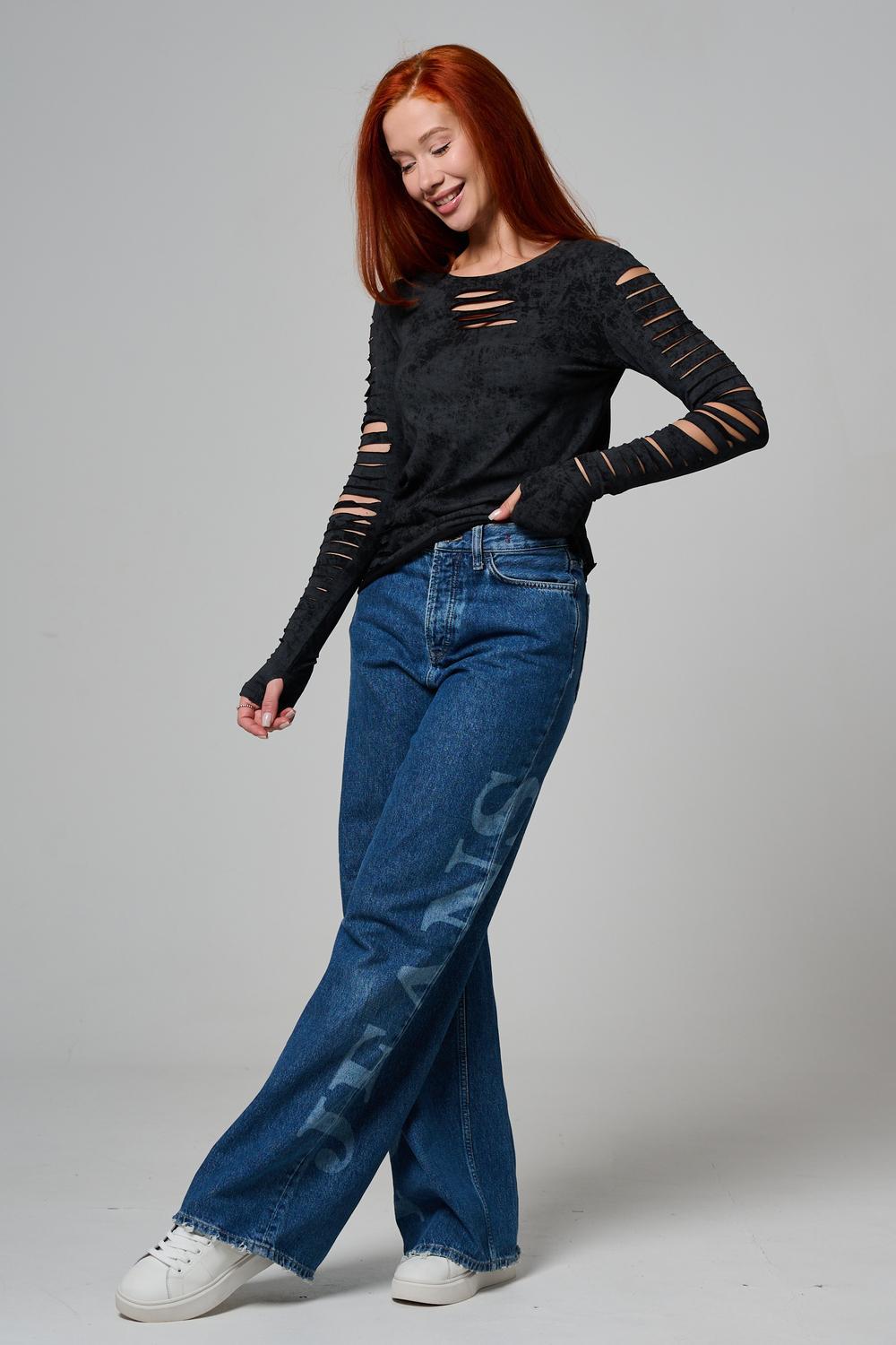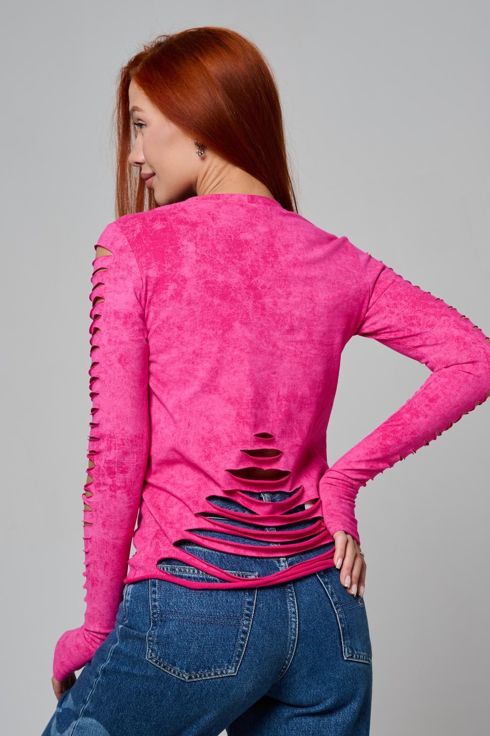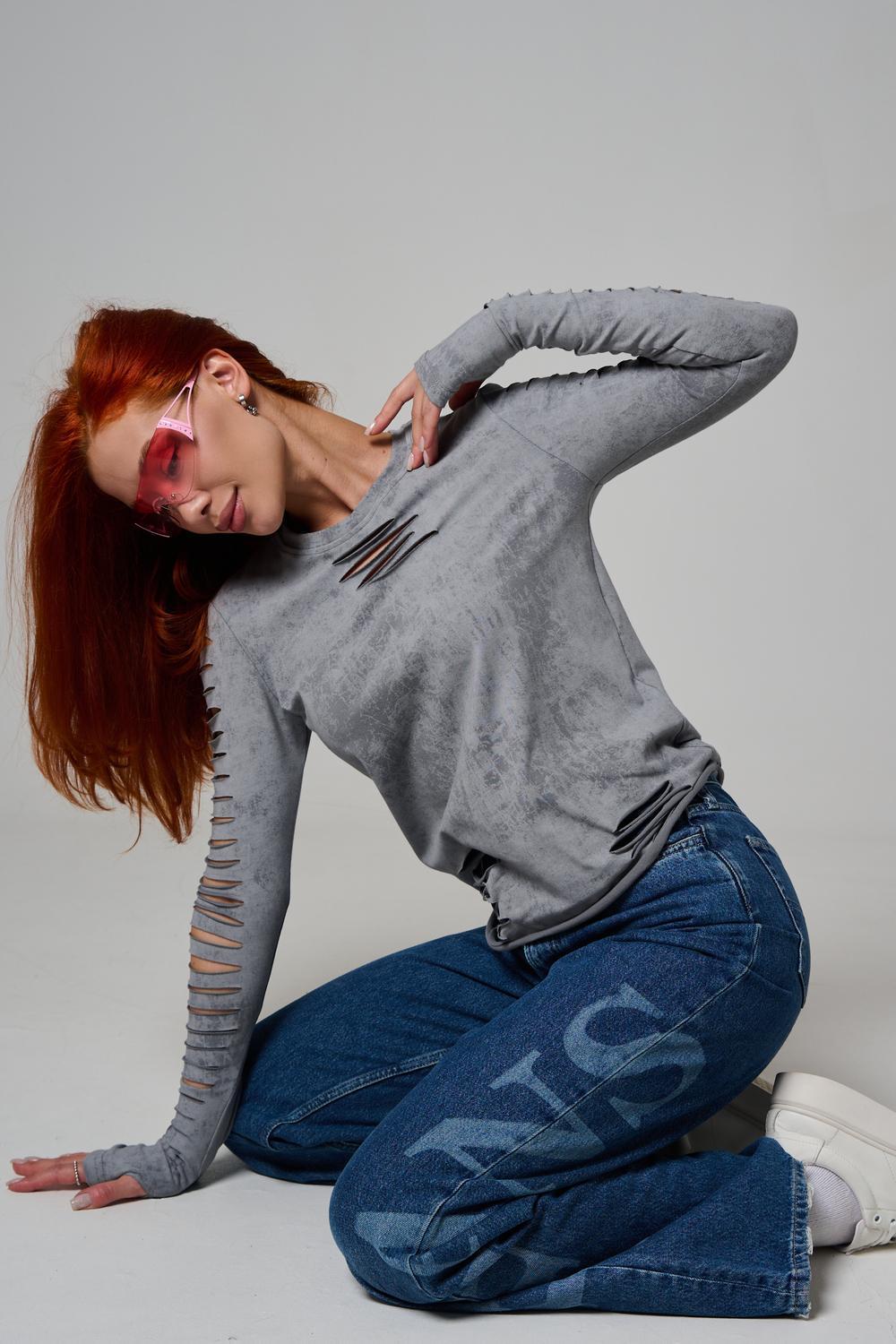 Женский лонгслив с длинными рукавами с из качественного хлопкового трикотажа. Необычный дизайнерский лонгслив с декоративным разрезами станет ярким дополнением к Вашему образу.