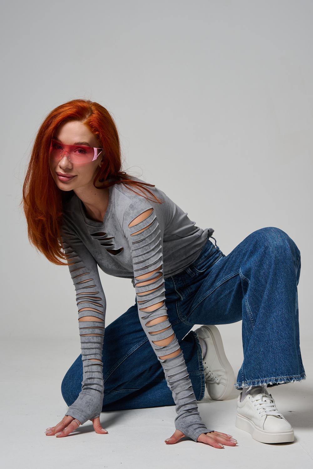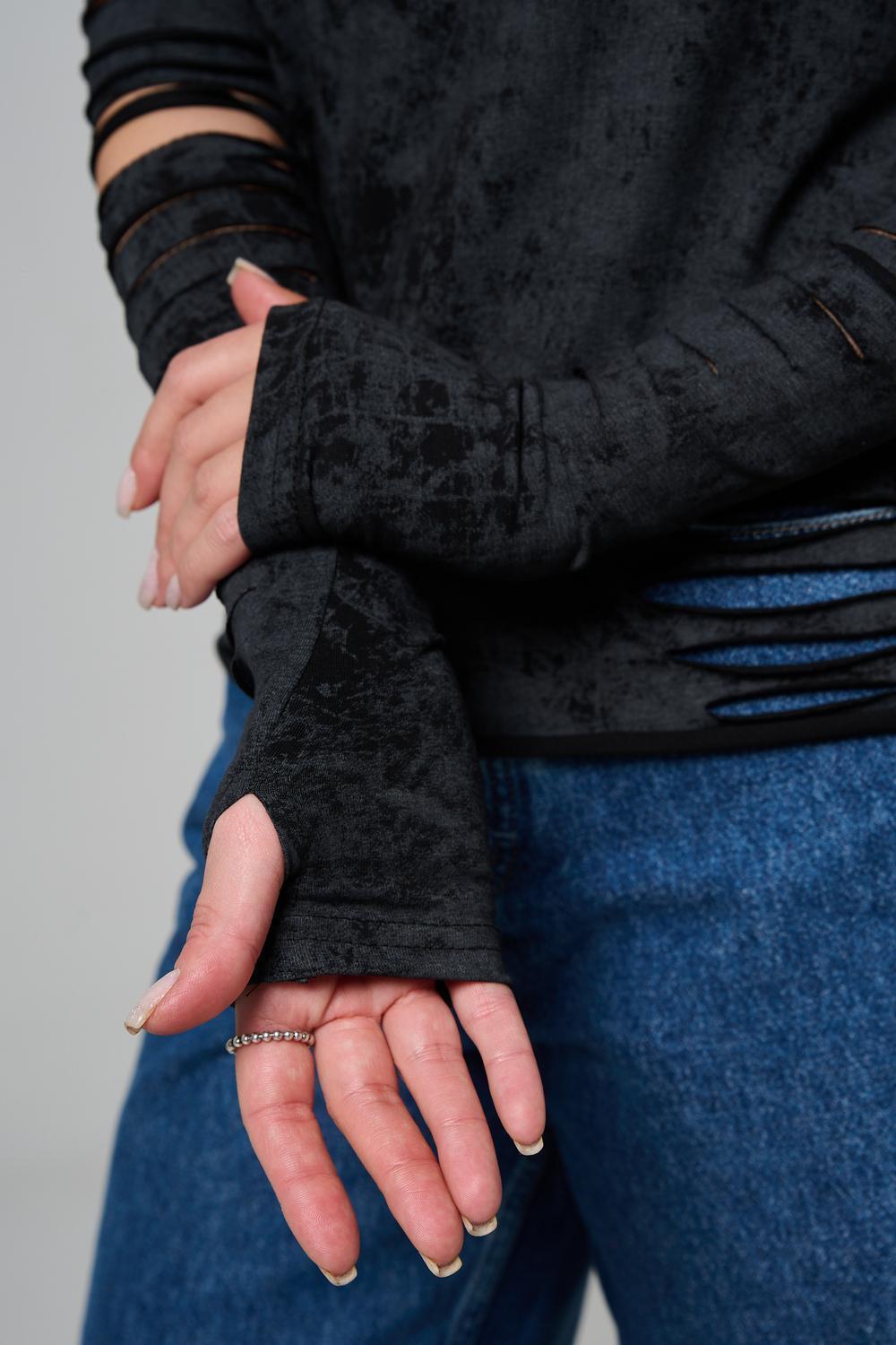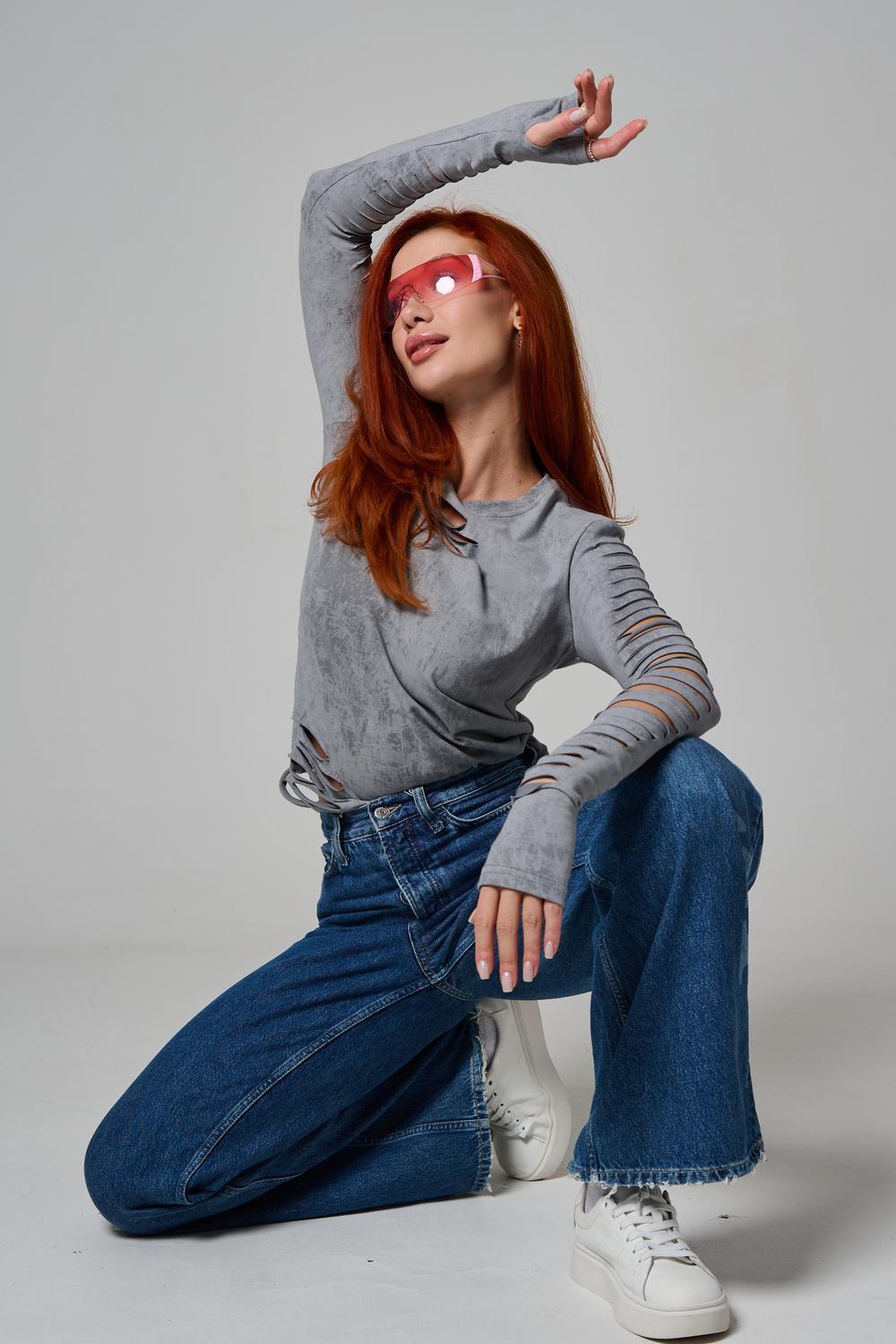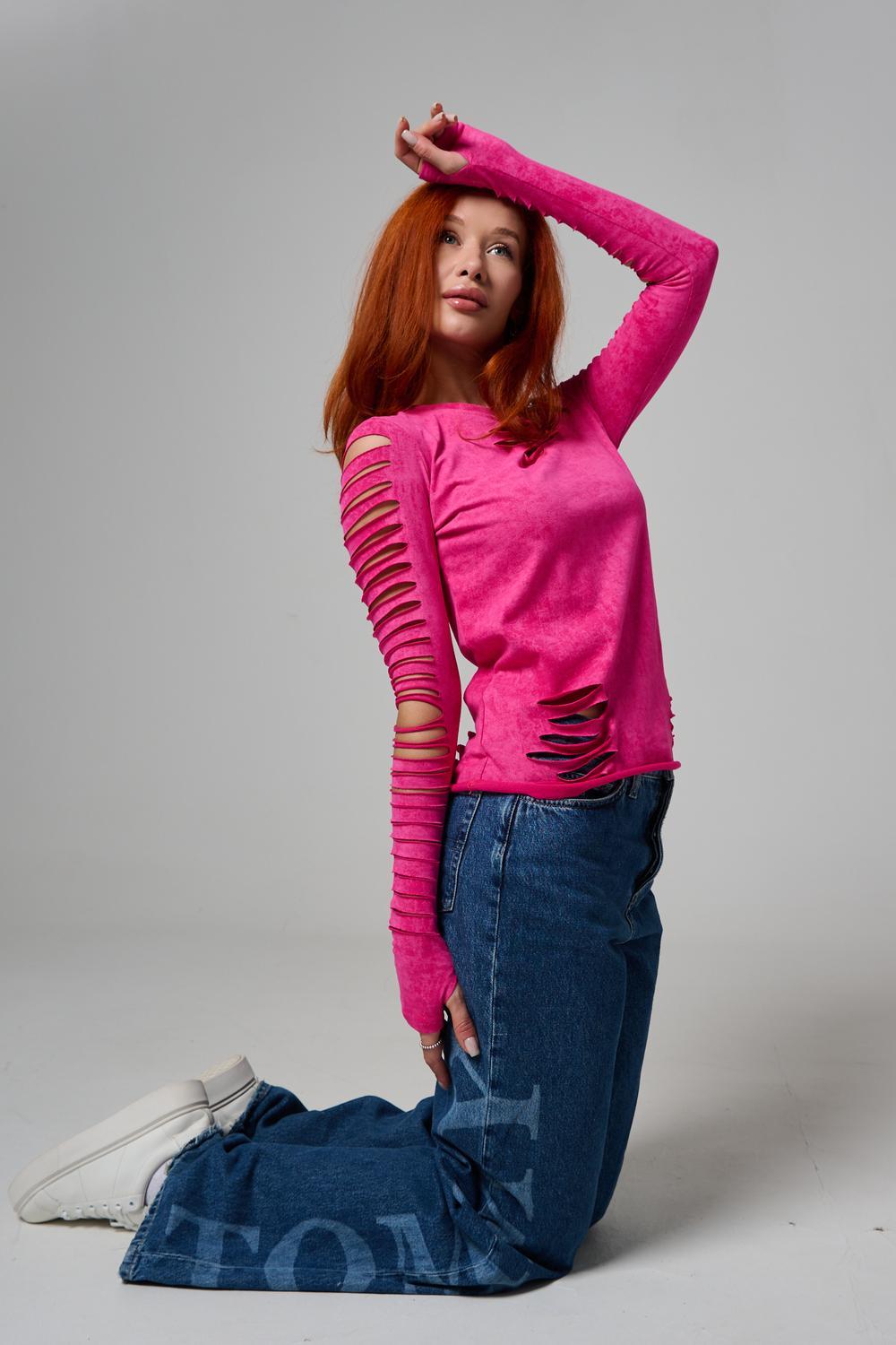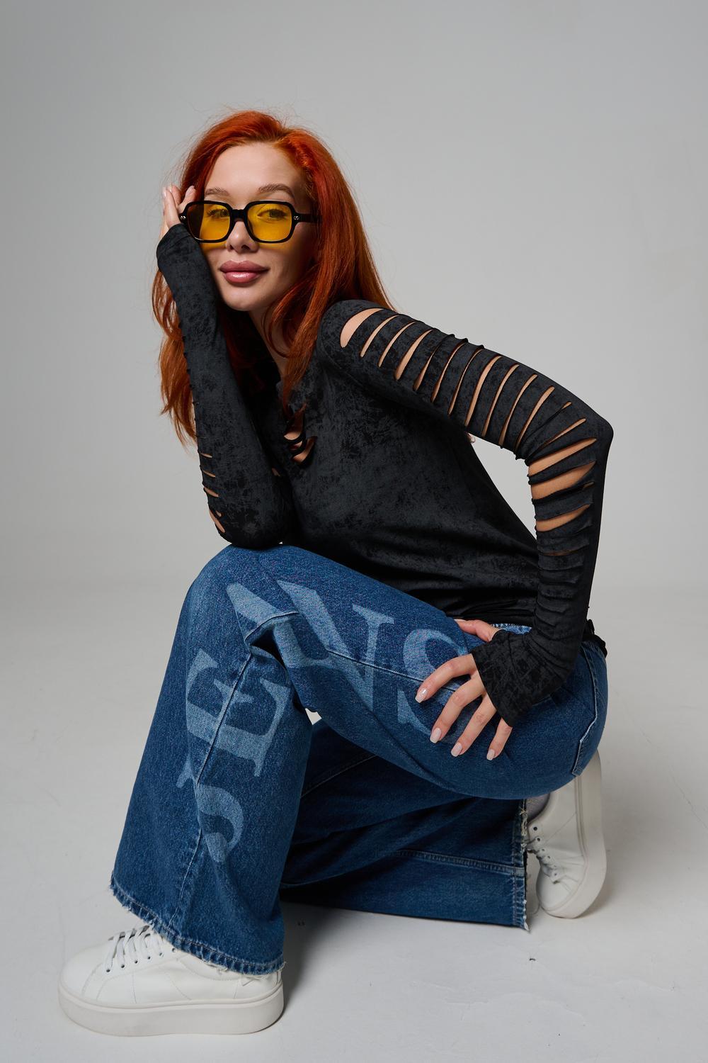 Женский лонгслив с длинными рукавами с из качественного хлопкового трикотажа. Необычный дизайнерский лонгслив с декоративным разрезами станет ярким дополнением к Вашему образу.