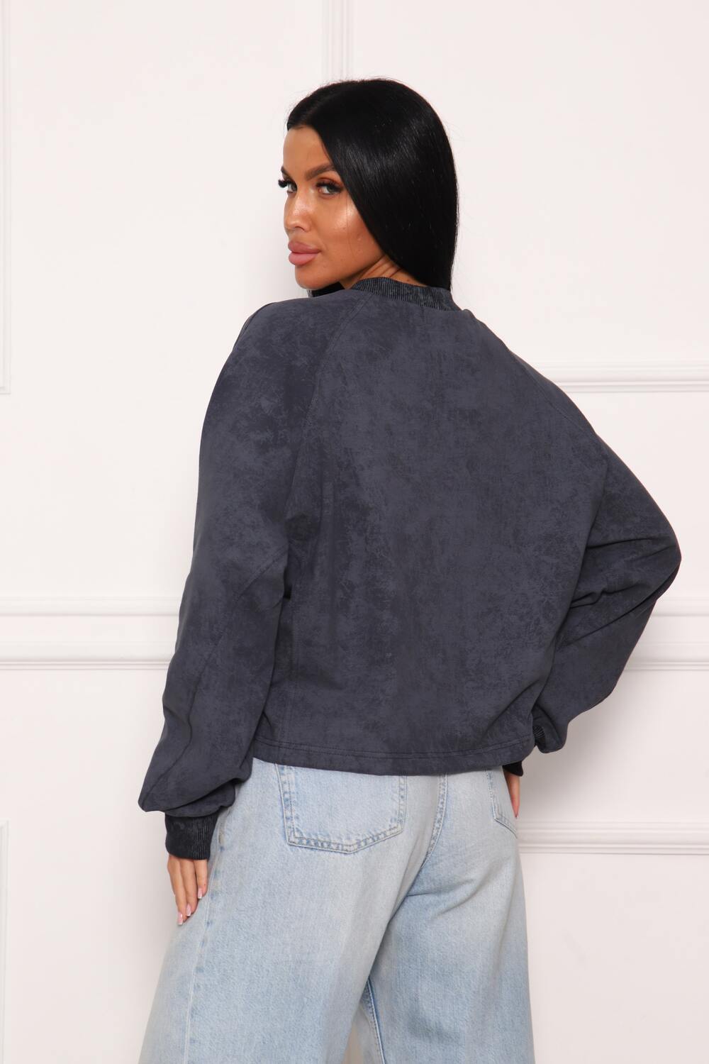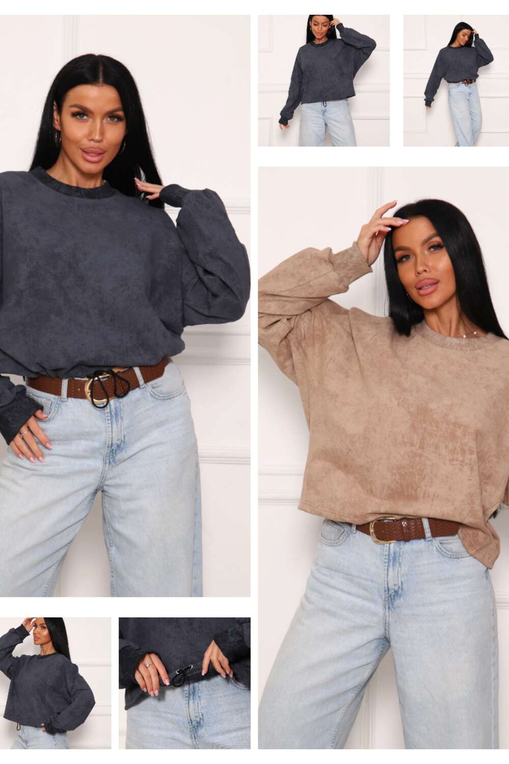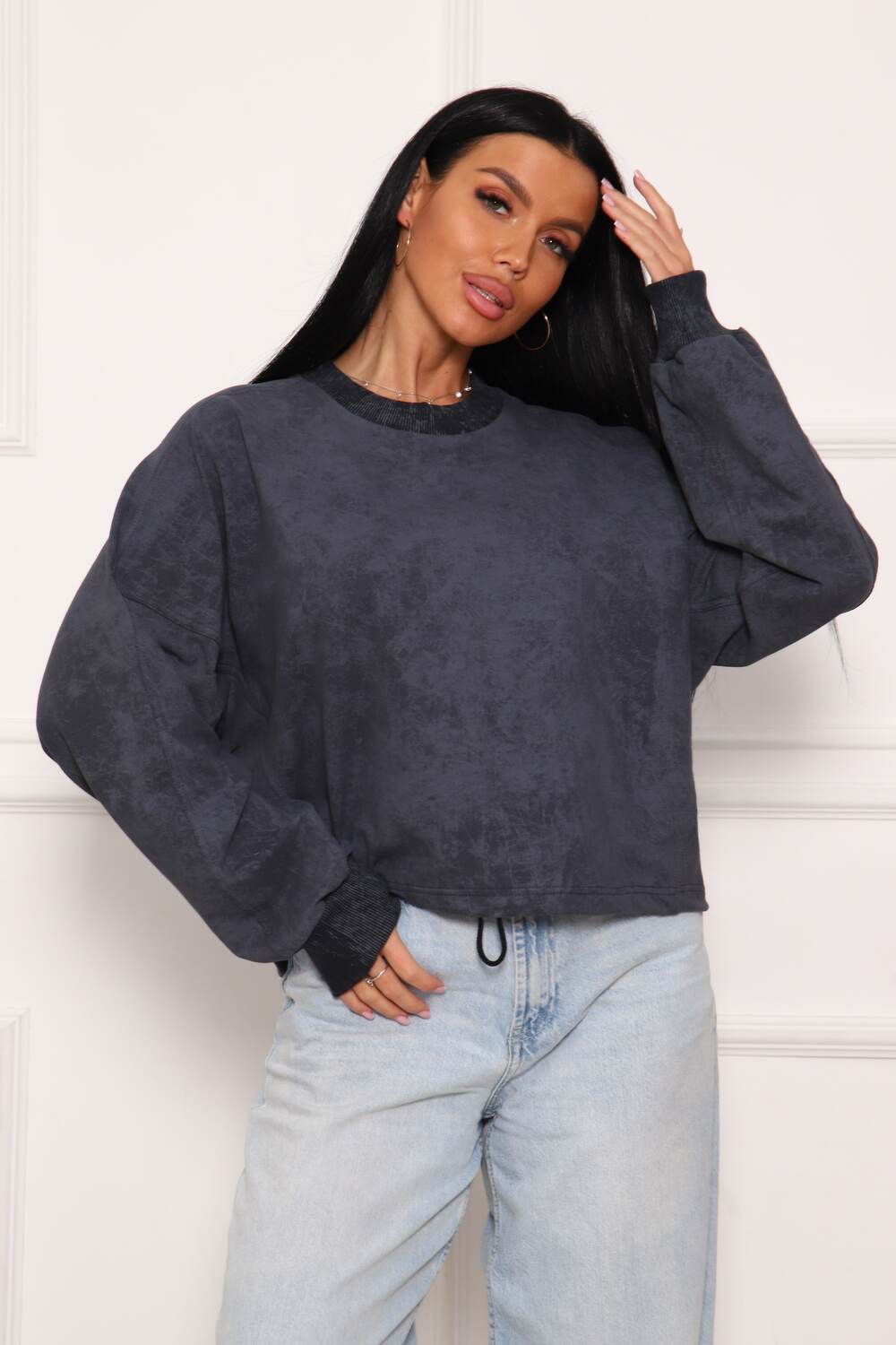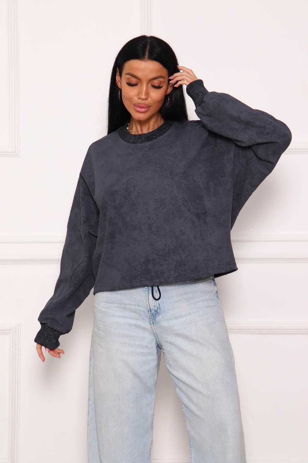 Свитшот женский сложного кроя, из трикотажного полотна с напылением, которое создает эффект стиля винтаж. Свитшот свободного облегания, рукав летучая мышь, на манжете. Горловина круглой формы, обработана обтачкой. Низ изделия на регулируемой кулисе со шнуром. Манжеты и обтачка горловины выполнены из кашкорсе в цвет основной ткани.