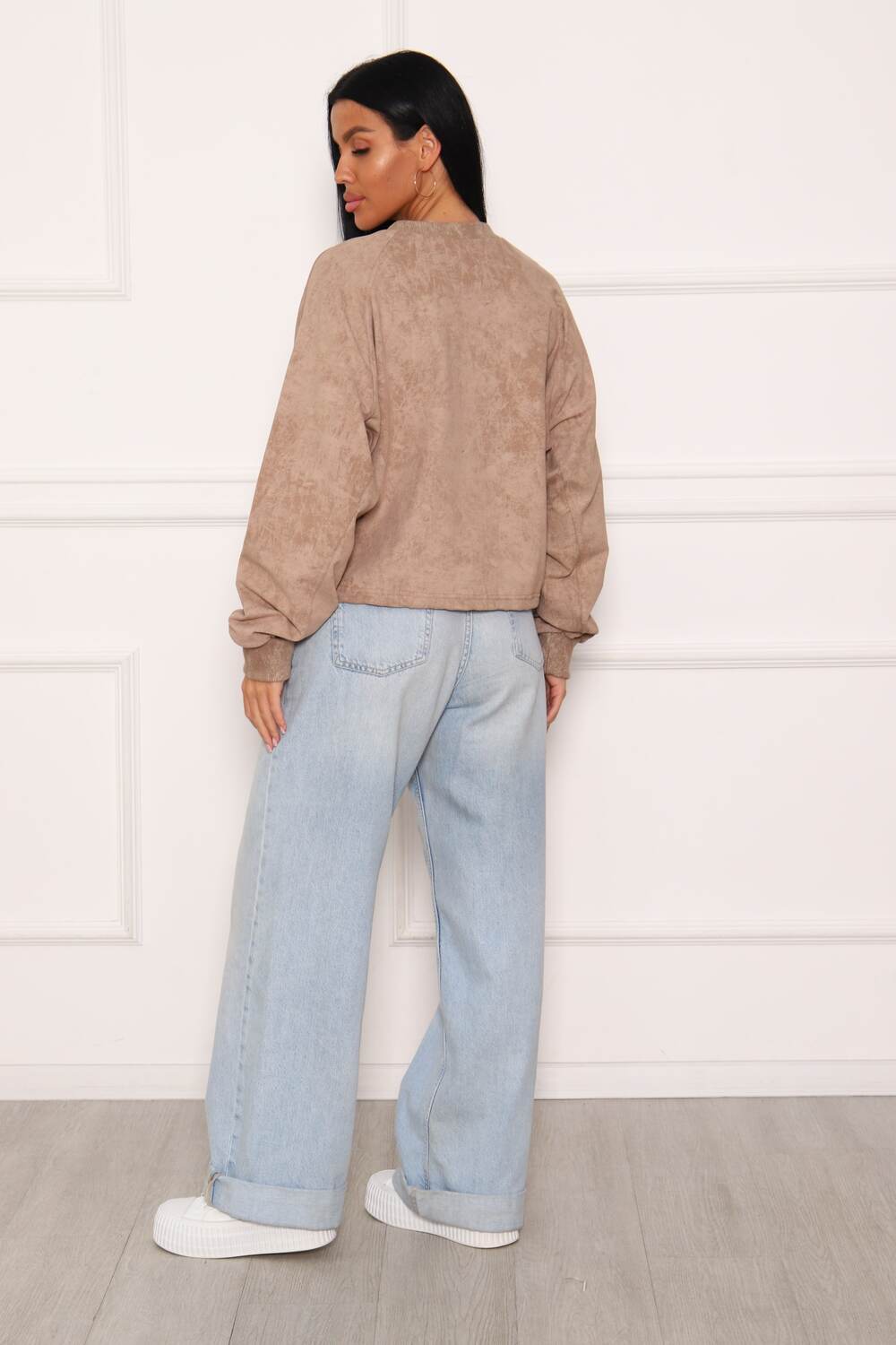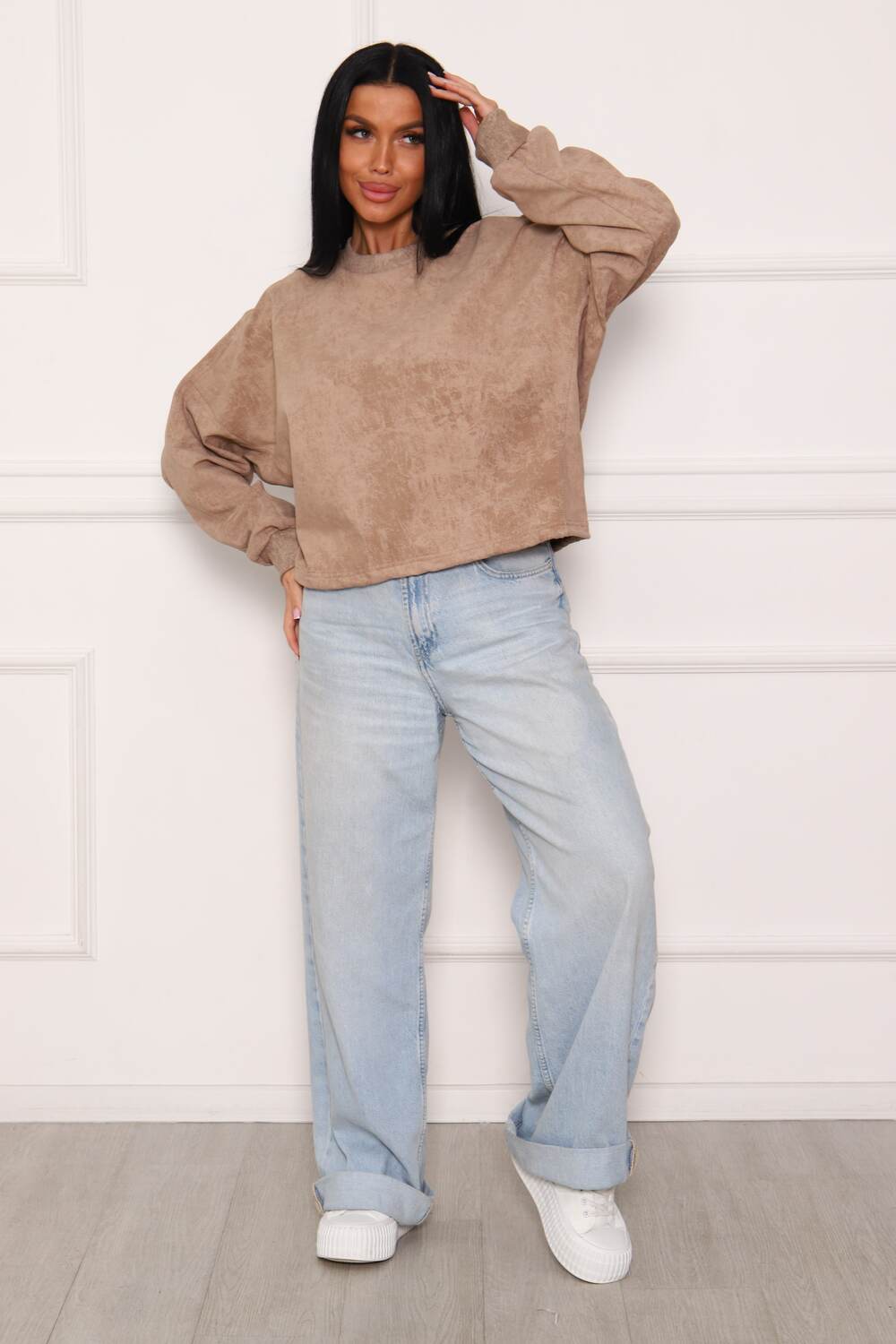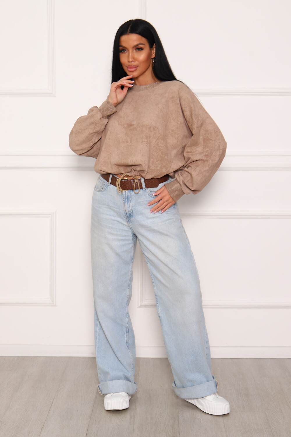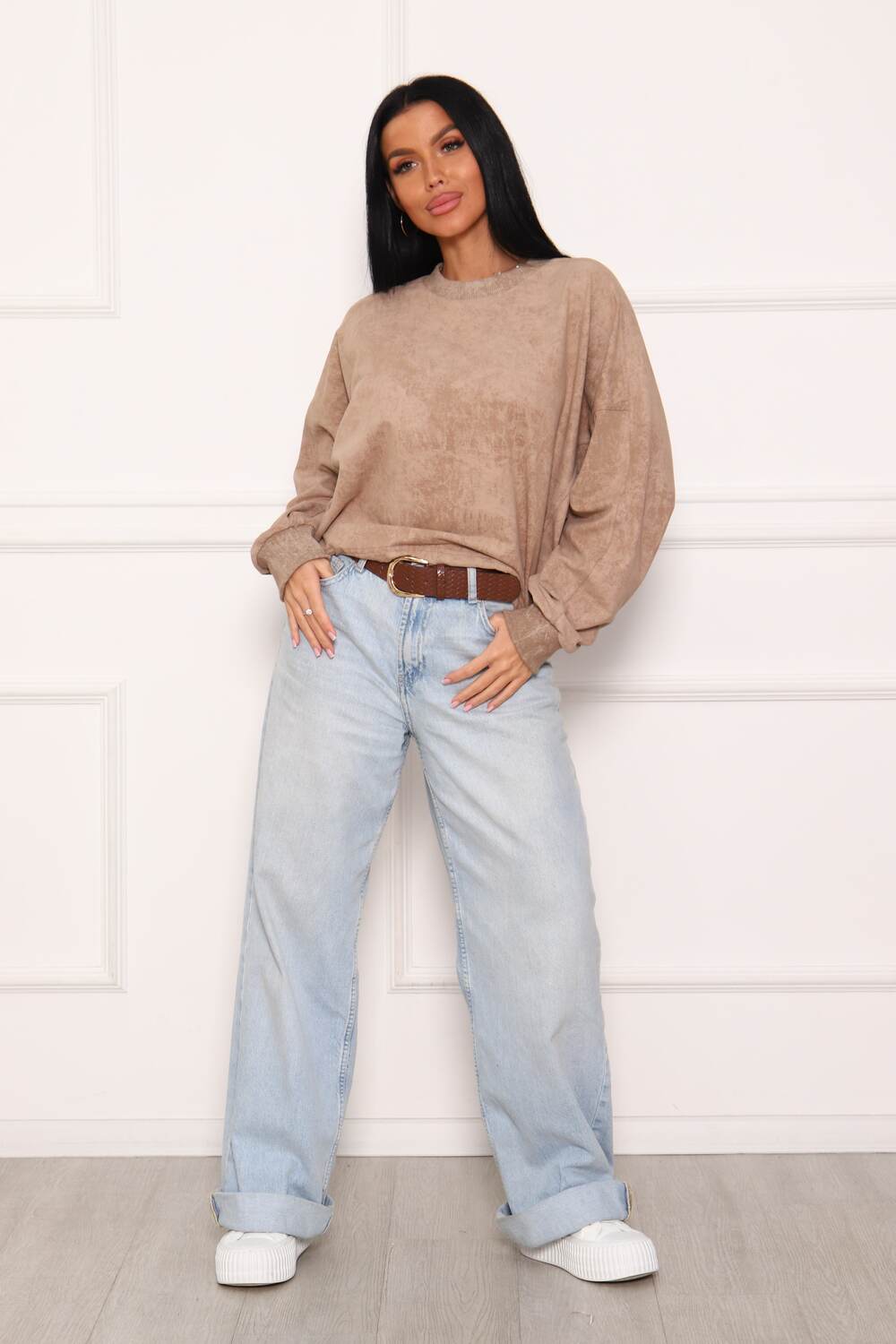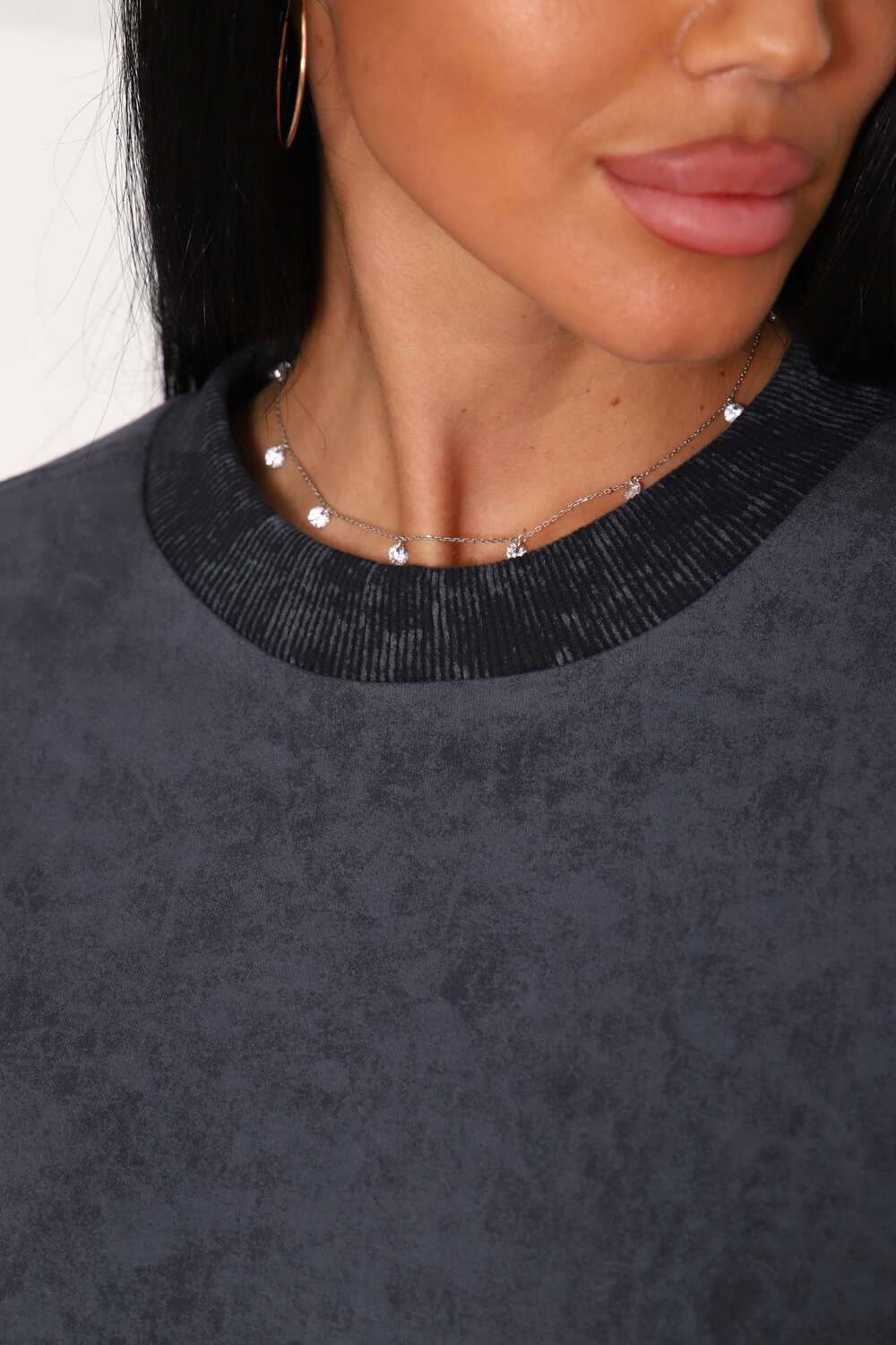 Свитшот женский сложного кроя, из трикотажного полотна с напылением, которое создает эффект стиля винтаж. Свитшот свободного облегания, рукав летучая мышь, на манжете. Горловина круглой формы, обработана обтачкой. Низ изделия на регулируемой кулисе со шнуром. Манжеты и обтачка горловины выполнены из кашкорсе в цвет основной ткани.