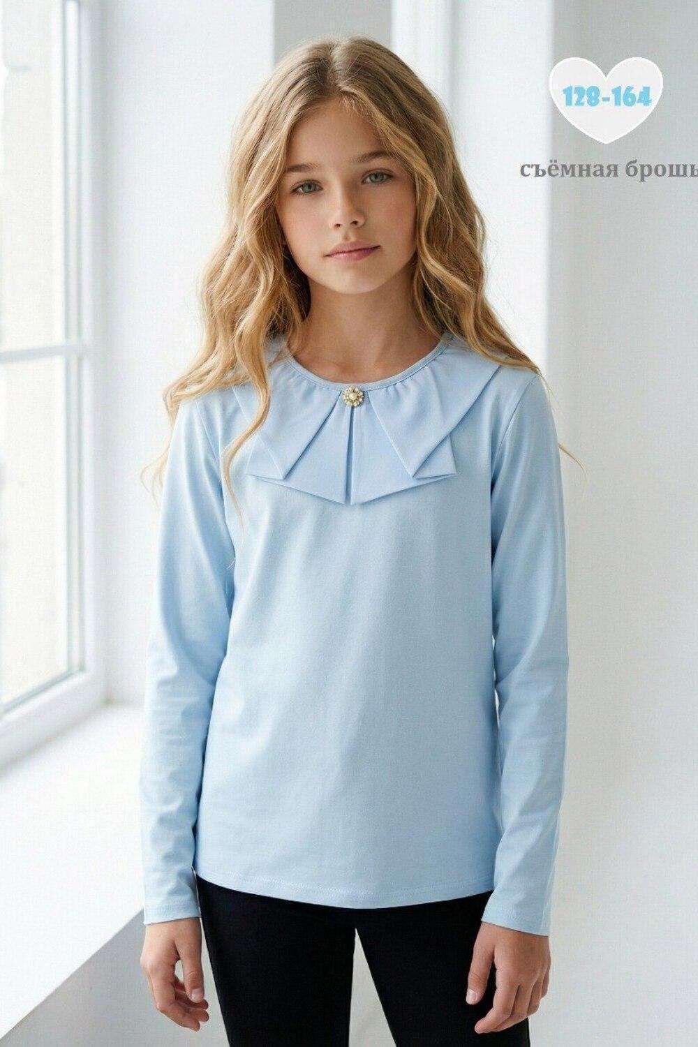 Джемпер для девочек младшего и старшего школьного возраста, из трикотажного полотна кулирка с лайкрой. Джемпер прилегающего силуэта, с втачным рукавом, с центральной застежкой на спинке на петлю и пуговицу, с воротником из шифона. Спереди отсутствуют линии членения. На спинке вырез в виде капельки под застежку. Рукав одношовный, длинный. Низа рукавов и изделия подогнуты. Воротник состоит из двух частей со складками. Спереди по центру прикреплена брошь.