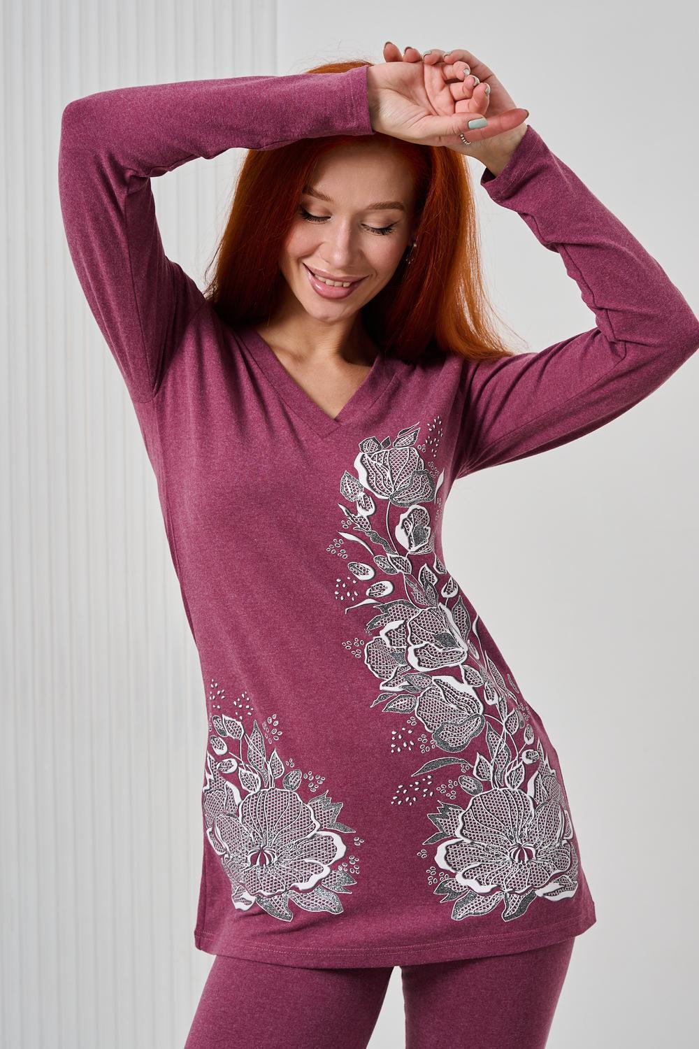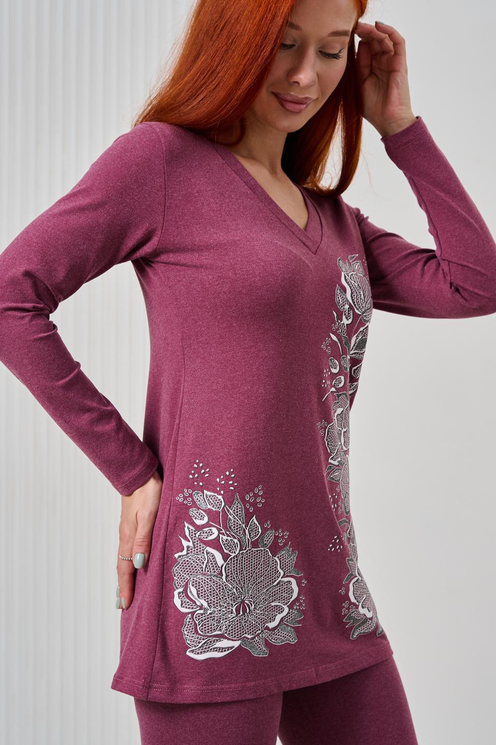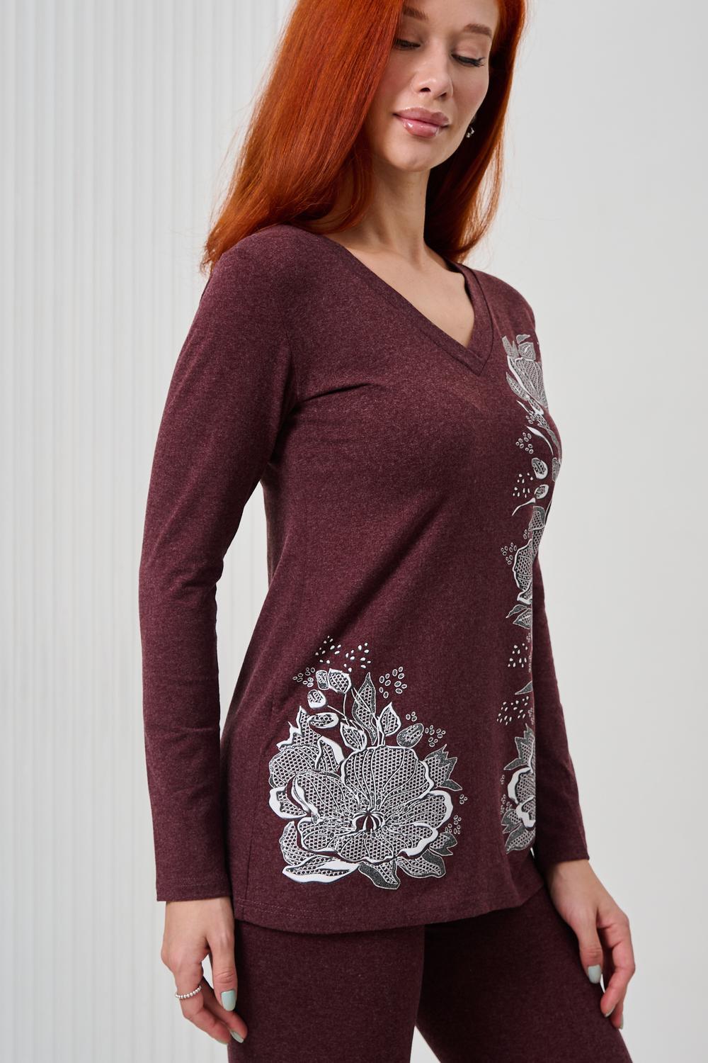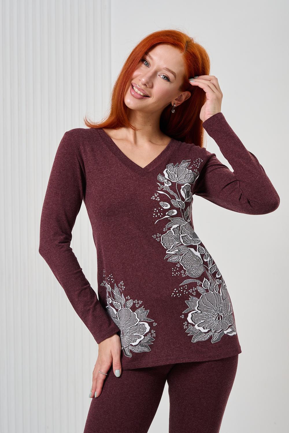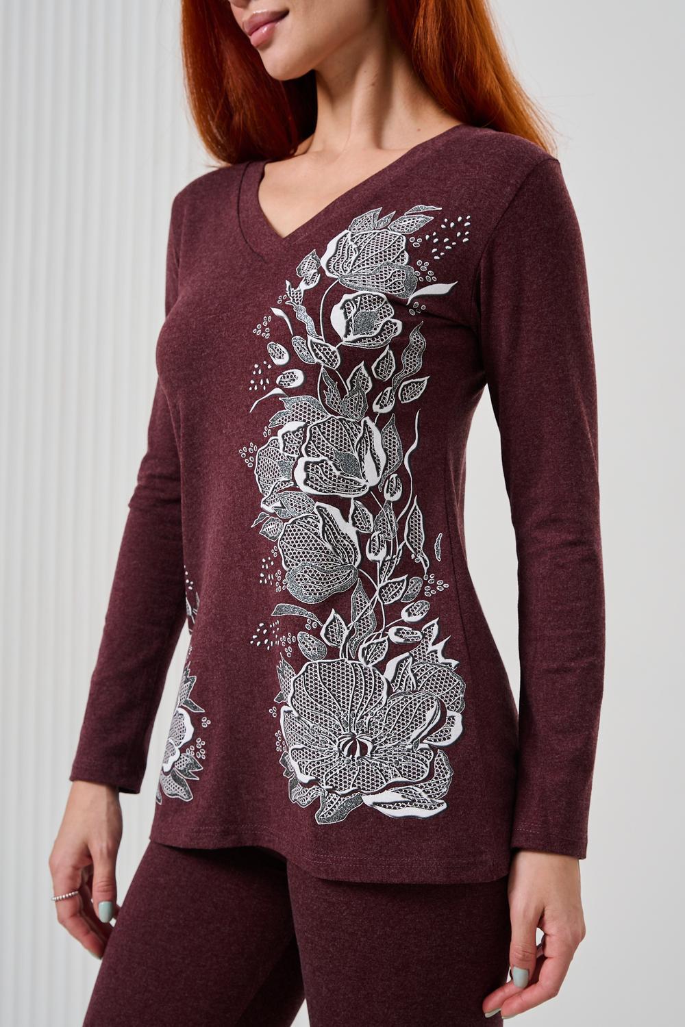 Элегантный джемпер чуть ниже бёдер полуприлегающего силуэта из очень мягкой, комфортной к телу ткани. Рукав длинный. Печать-имитация вышивки с глиттером. Модель прекрасно впишется в демисезонный гардероб. Ткань хорошо растягивается благодаря наличию в составе 5% лайкры.