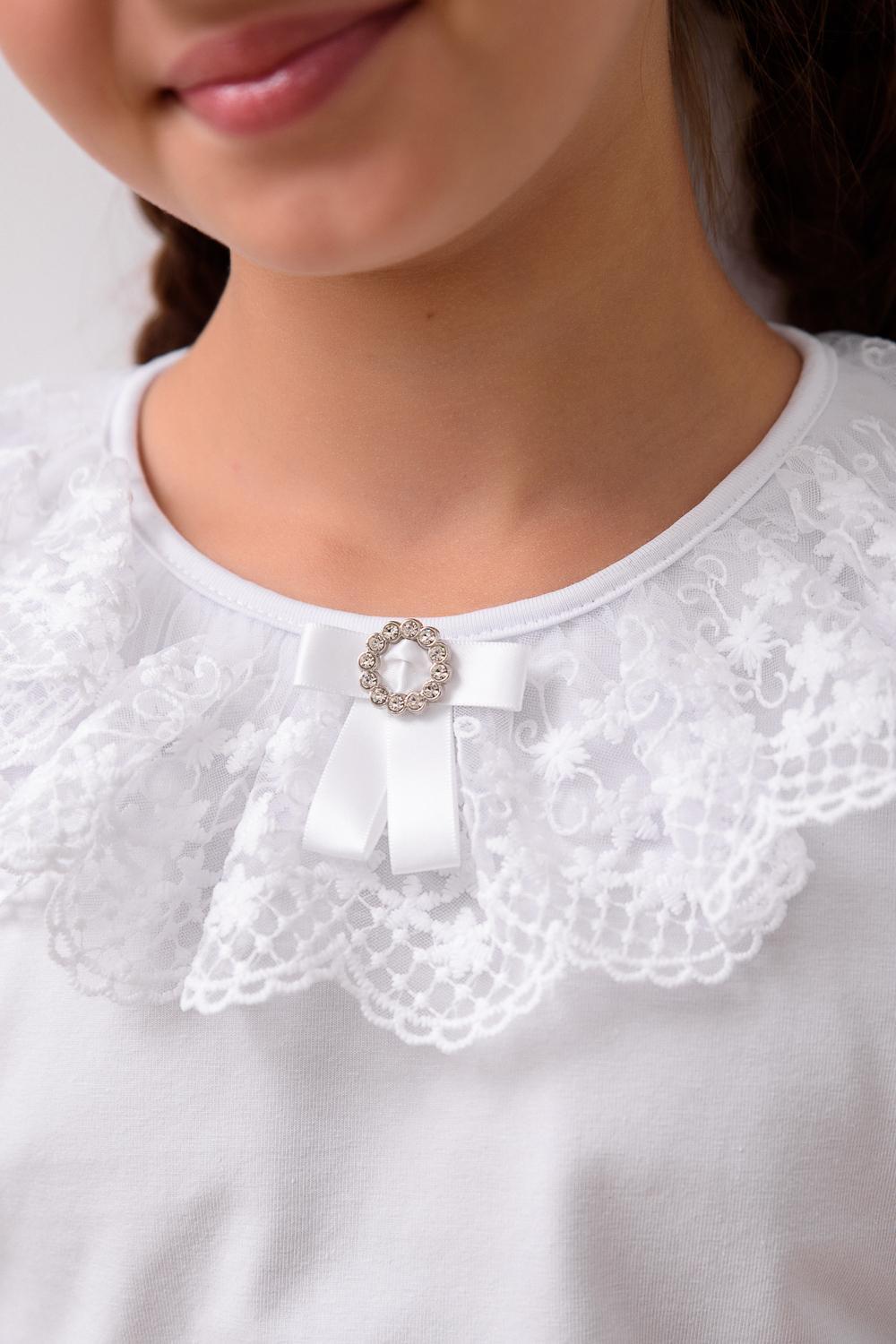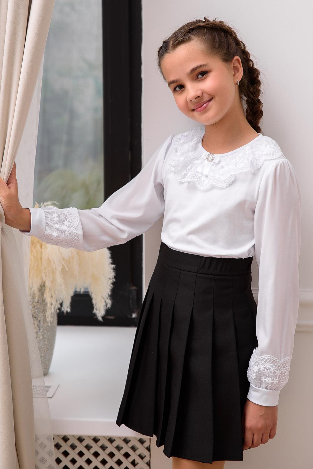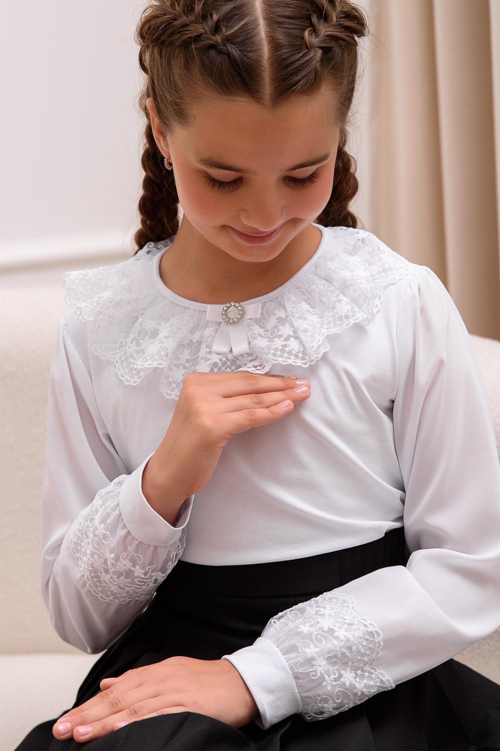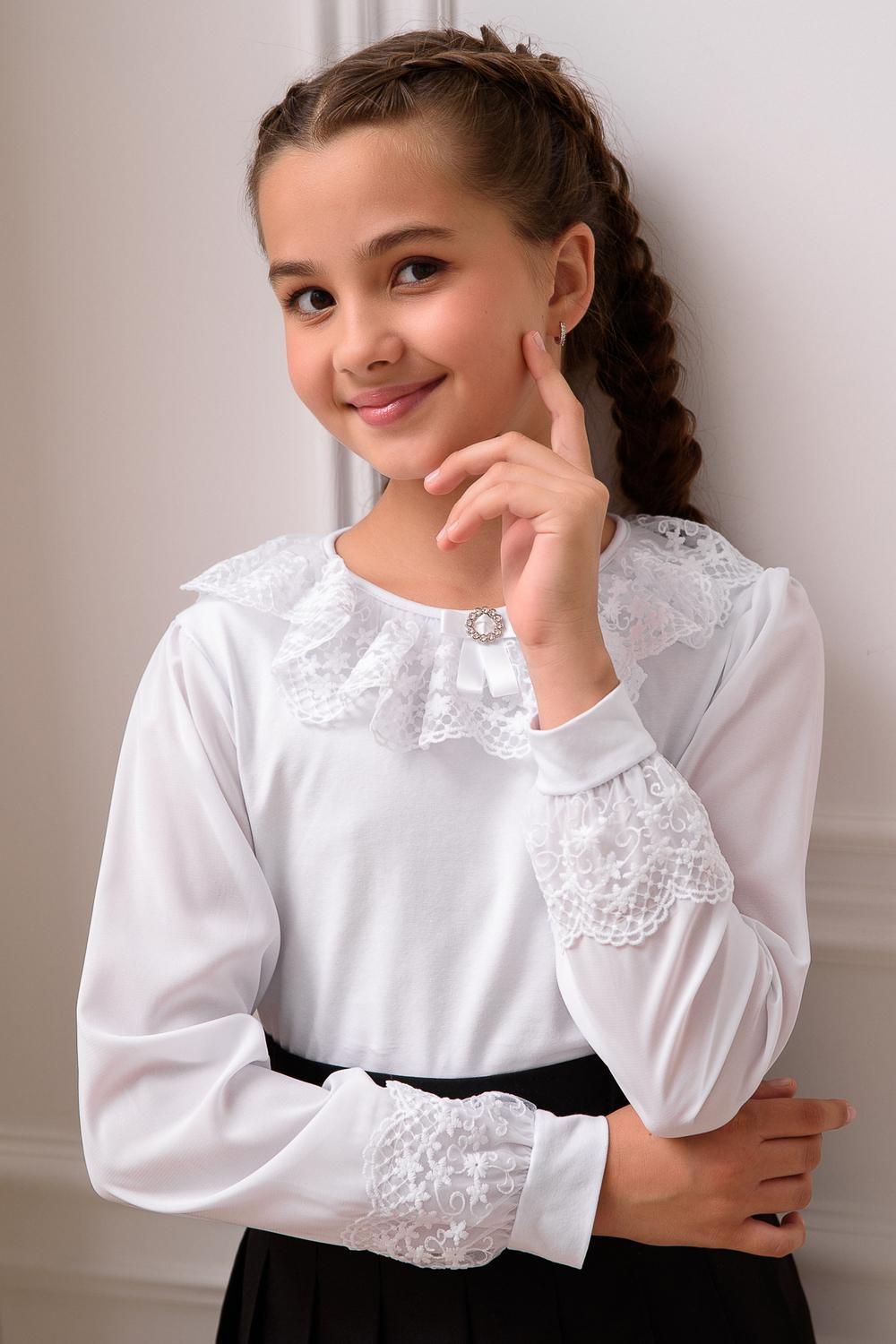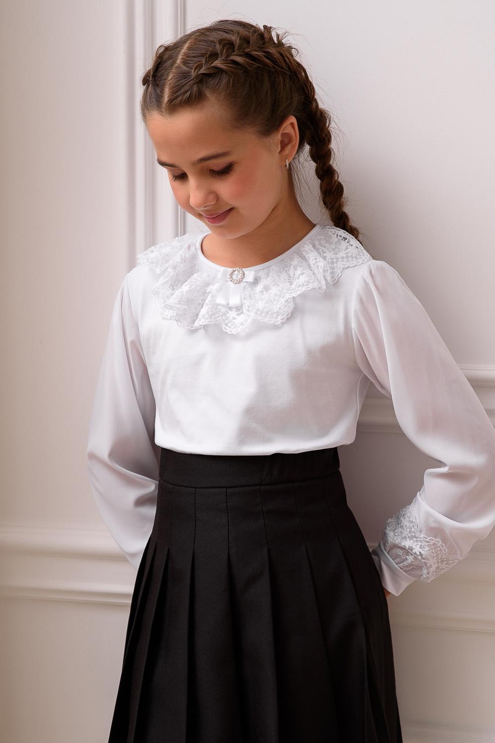 Джемпер для девочек с длинным рукавом. Данная модель станет основой школьного или праздничного образа. Элегантное мягкое кружево на горловине можно красиво разложить на сарафан или пиджак, что создаст нарядный look. Оригинальная модель добавит романтизма в образ и подчеркнет индивидуальность, можно сочетать с юбкой, сарафаном и брюками. Шифоновые рукава на манжете, по низу настрочено кружево. На спинке вырез в виде капли с застежкой на петлю и пуговицу. Джемпер сшит из качественного трикотажа - кулирка с лайкрой, используемый материал не теряет форму после многократных стирок, мягкий и приятный к телу, устойчив к износу. Для сохранения первоначальных свойств изделия, важно соблюдать рекомендации по уходу.