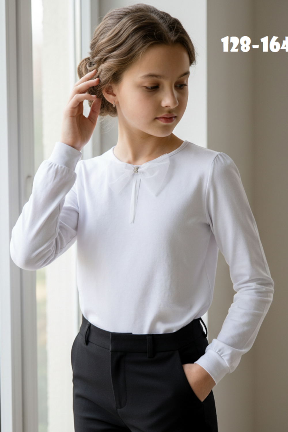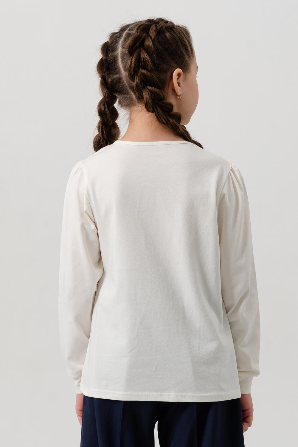 Блузка школьная для девочки с трикотажными длинными рукавами, круглым вырезом горловины, без застёжки, прилегающего силуэта, по центру переда настрочен бант из сетки, спереди прикреплен съёмный декоративный элемент, рукава на манжетах. Сшита из однотонного мягкого хлопкового трикотажного материала с добавлением в состав хлопка 92% и лайкры 8%. Школьная форма украсит и дополнит любой образ не только в школу, но и для повседневной носки, на день рождения, фотосессию и для особых случаев. Джемпер отлично сидит по фигуре, движения в нем комфортные, позволяет выглядеть ребенку изящно. Хорошо смотрится в сочетании с юбками, сарафанами, брюками, со школьным костюмом, отлично сохраняют цвет и форму при активной носке и после многократных стирок. Используемый материал блузки мягкий и приятный телу, устойчив к износу, не садится, не образует катышек на поверхности, имеет эффектный внешний вид.