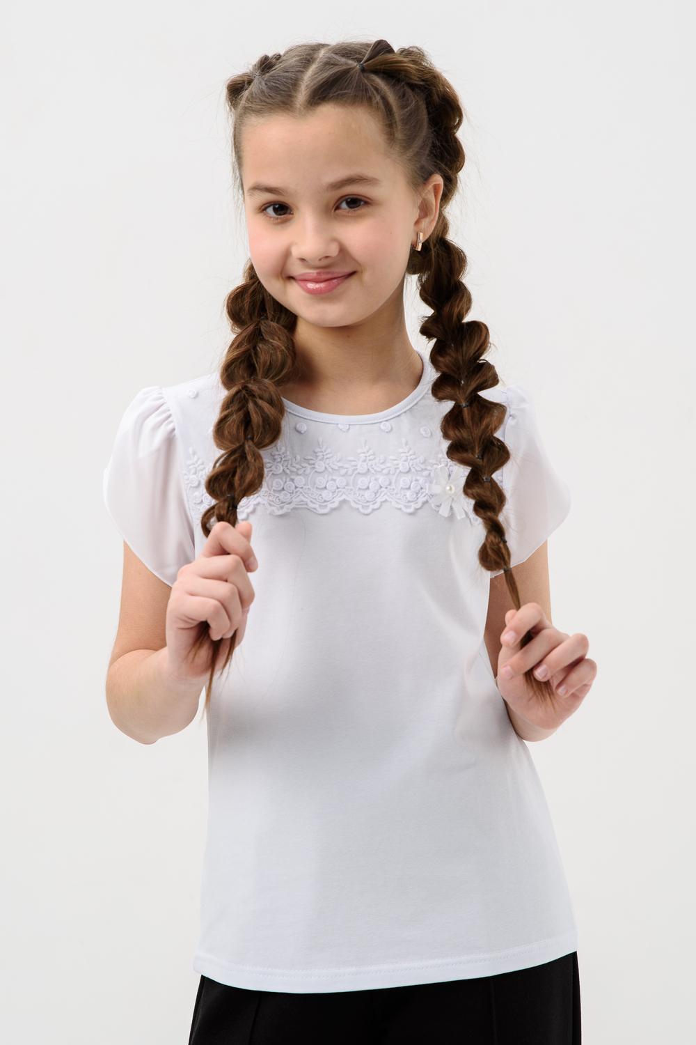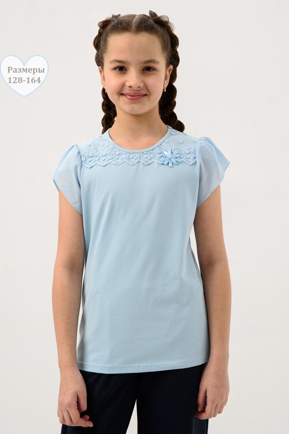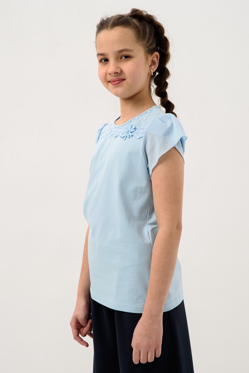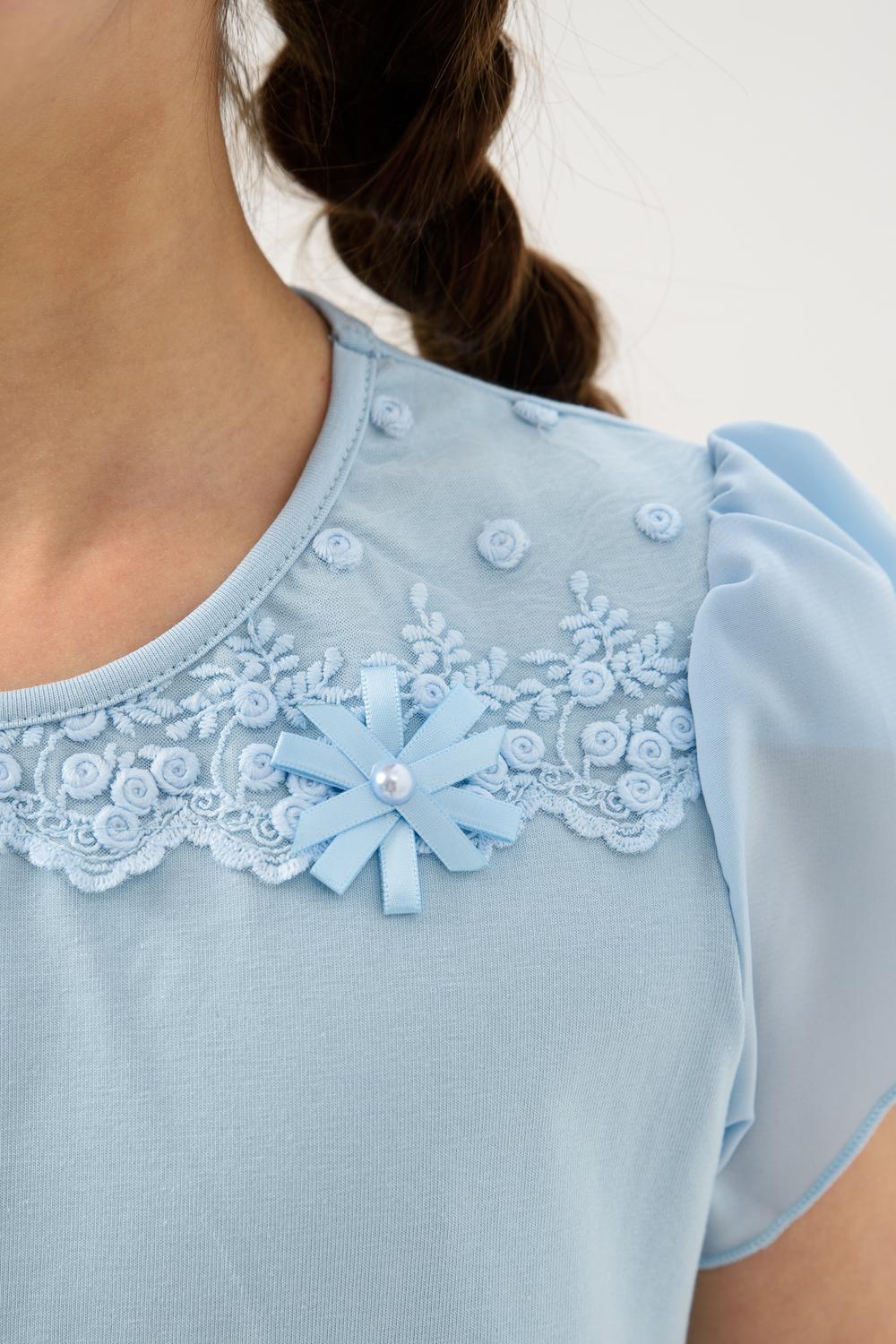 Джемпер для девочки из трикотажного полотна кулирка с лайкрой с коротким рукавом. Джемпер полуприлегающего силуэта, с втачным рукавом из шифона, без застежки. Спереди на кокетке настрочено кружево, прикреплен декоративный элемент. Рукав короткий, из двух частей, присборенный по окату. Низ рукавов обметан на краеобметочной машине. Низ изделия подогнут. Срез горловины обработан узкой окантовочной лентой из того же полотна.