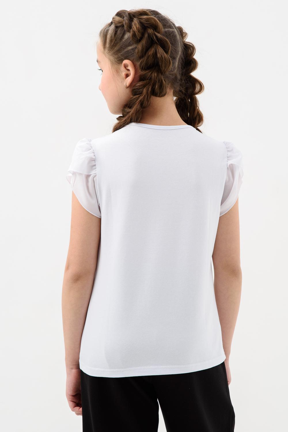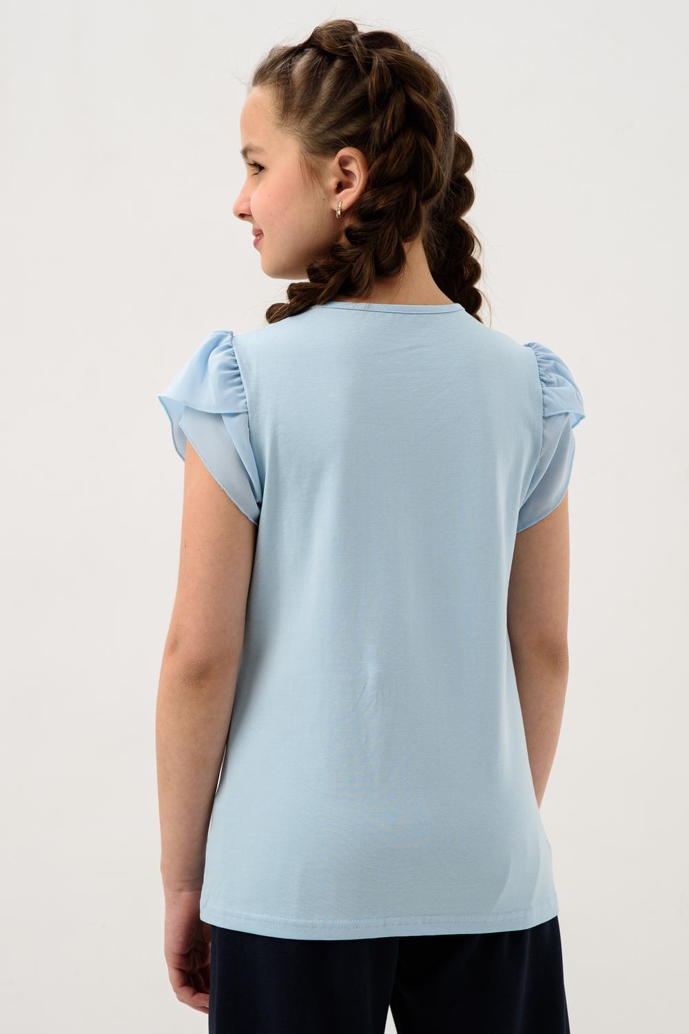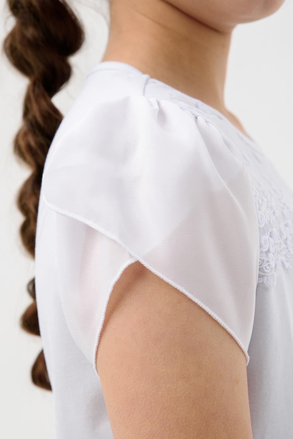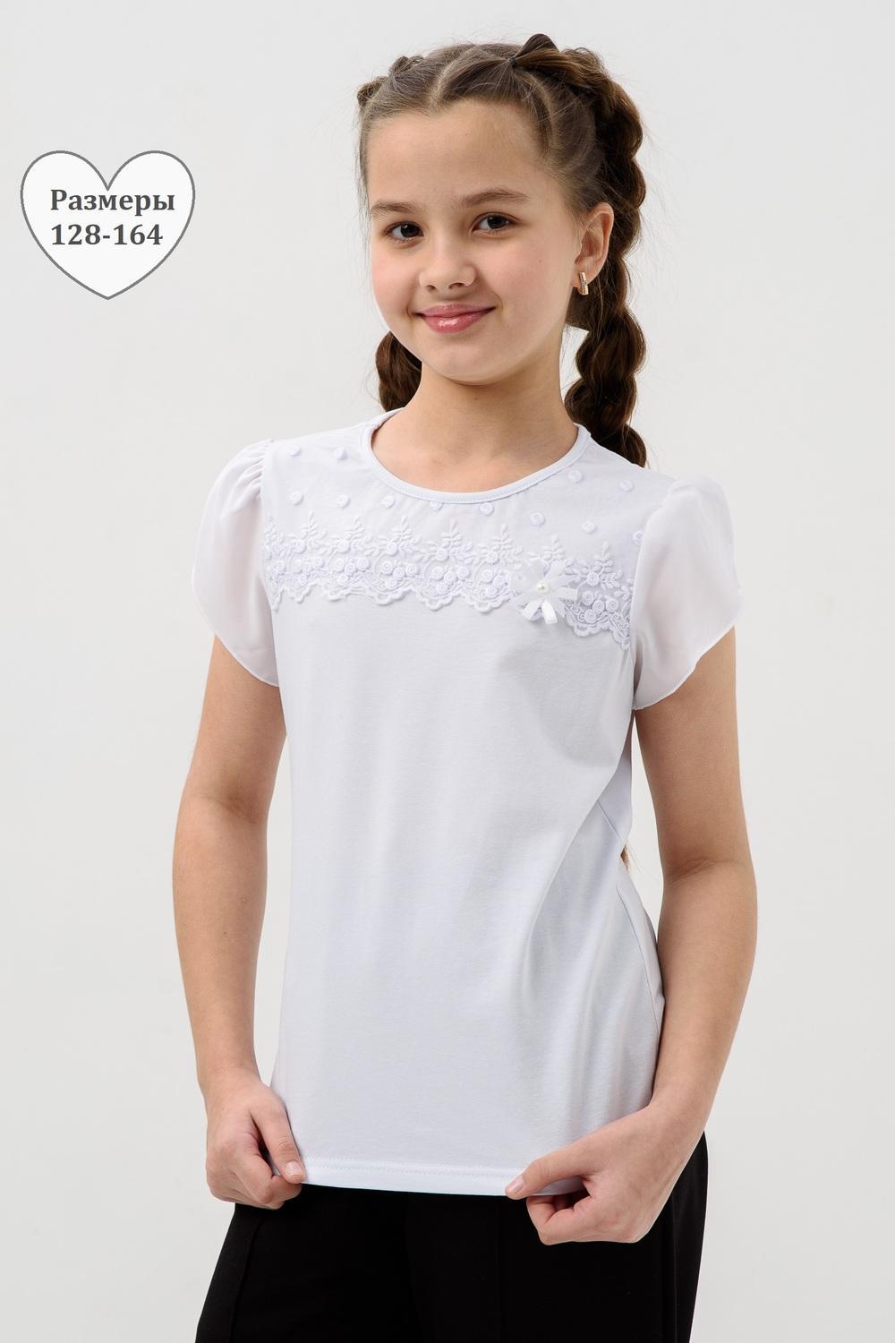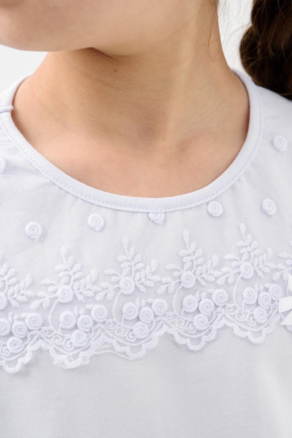 Джемпер для девочки из трикотажного полотна кулирка с лайкрой с коротким рукавом. Джемпер полуприлегающего силуэта, с втачным рукавом из шифона, без застежки. Спереди на кокетке настрочено кружево, прикреплен декоративный элемент. Рукав короткий, из двух частей, присборенный по окату. Низ рукавов обметан на краеобметочной машине. Низ изделия подогнут. Срез горловины обработан узкой окантовочной лентой из того же полотна.