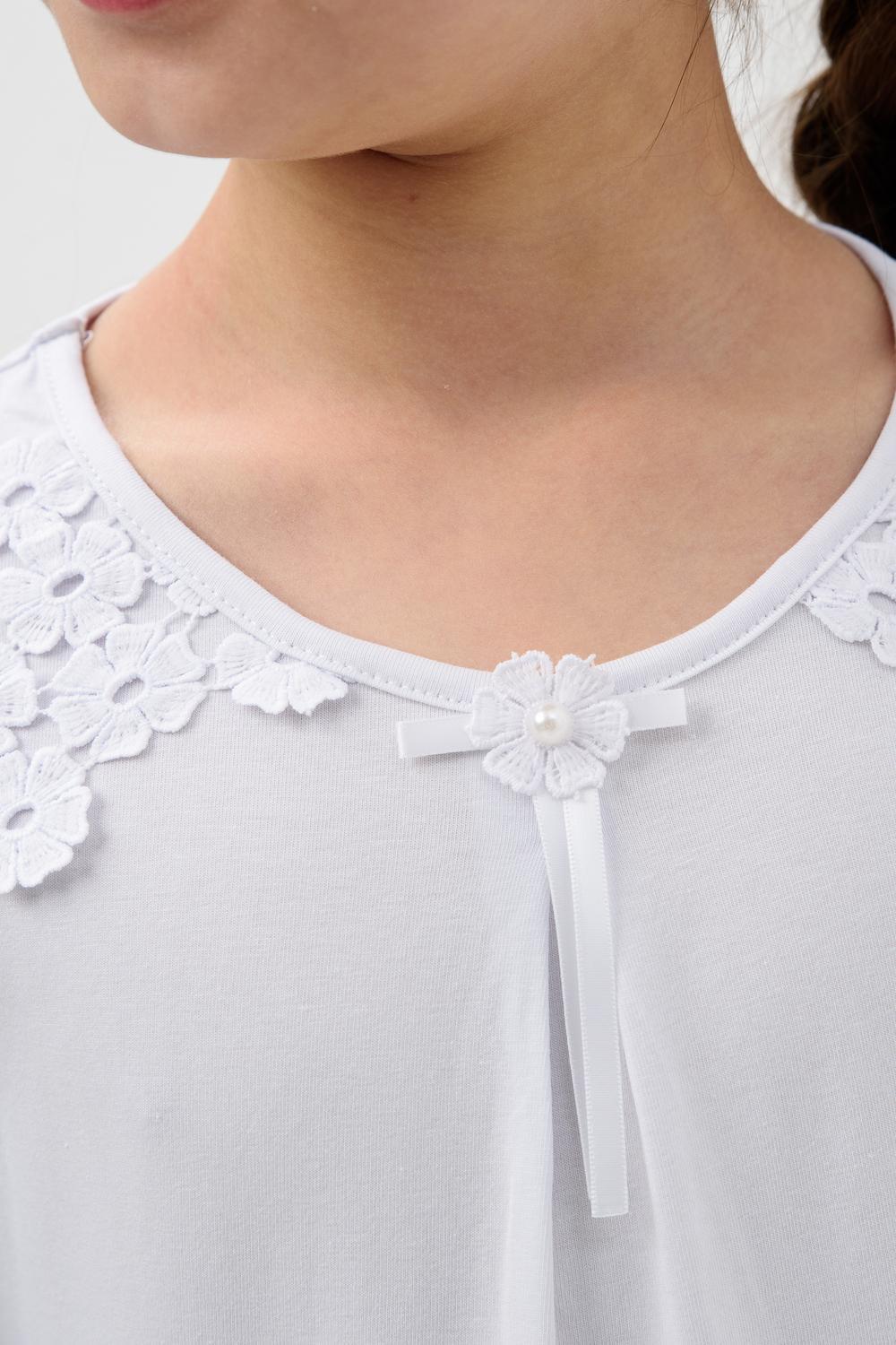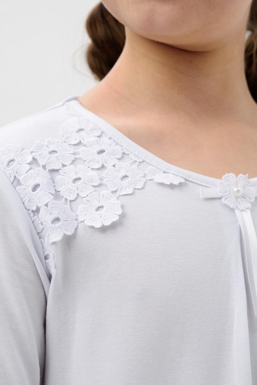 Джемпер для девочек дошкольного, младшего и старшего школьного возраста, из однотонного трикотажного полотна кулирка с лайкрой. Джемпер прямого силуэта, с втачным рукавом, без застежки. Спереди, по центру заложена встречная складка. На спинке отсутствуют линии членения. Срез горловины обработан узкой окантовочной лентой из того же полотна в 4 сложения. Рукав одношовный длинный. Низ рукава без манжеты, подогнут. На передней части джемпера настрочено кружево от горловины к проймам. По центру горловины приклеплен цветок с атласной ленточкой.