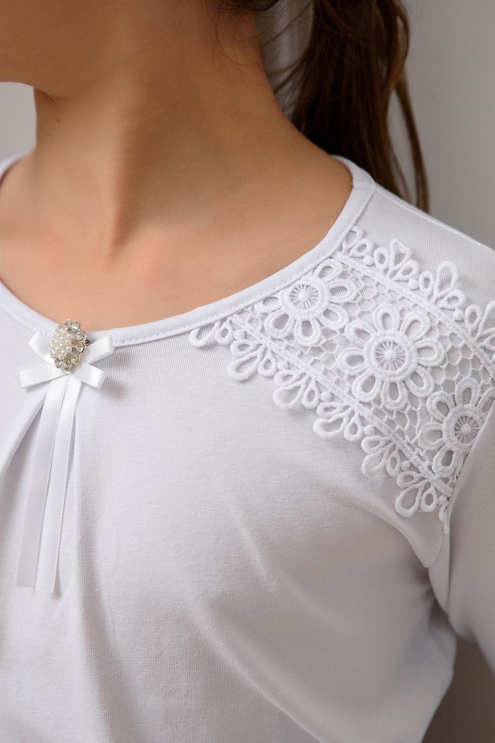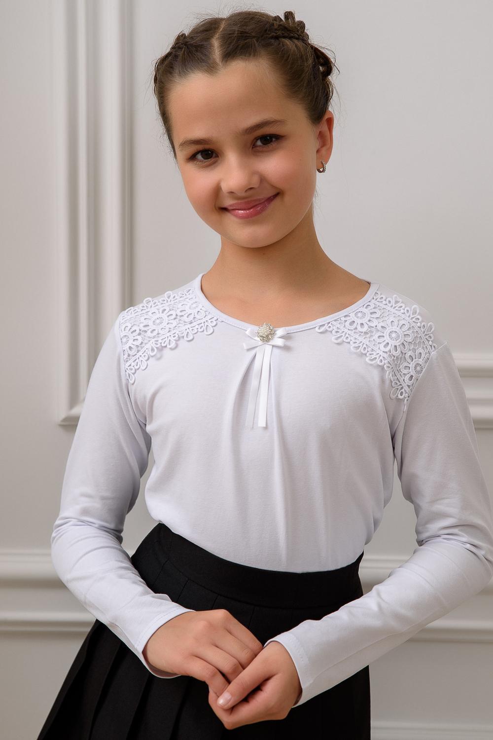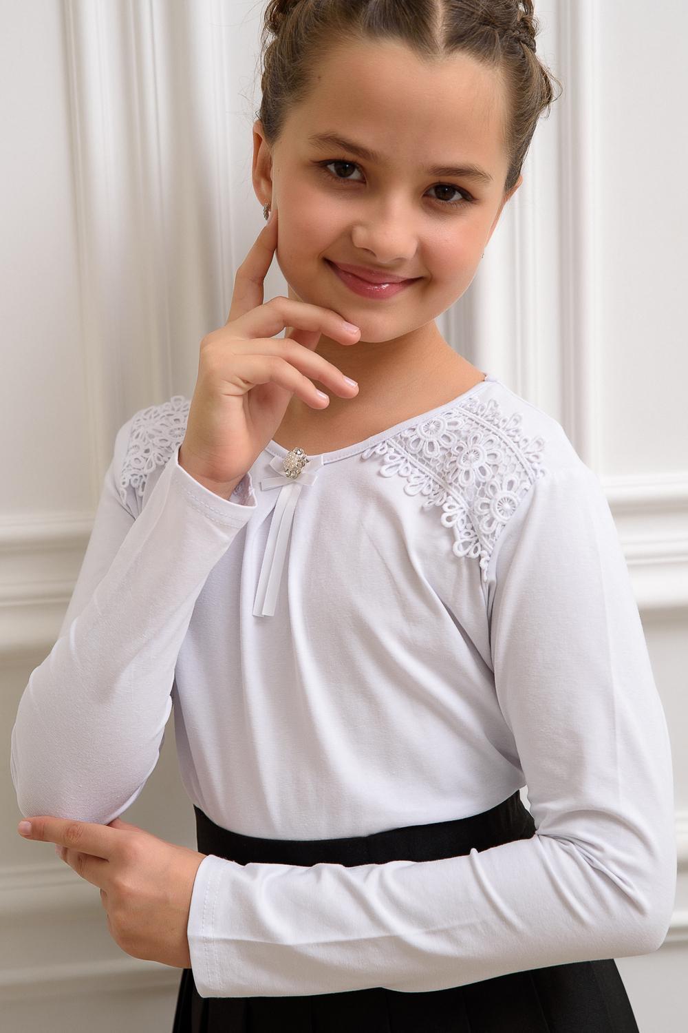 Блузка школьная для девочки с трикотажными длинными рукавами, круглым вырезом горловины, по центру горловины прикреплена брошь, без застёжки. На передней части блузки настрочено кружево. Сшита из мягкого хлопкового трикотажного материала с добавлением в состав хлопка 92% и лайкры 8 %. Школьная форма украсит и дополнит любой образ не только в школу, но и для повседневной носки, на день рождения, фотосессию и для особых случаев. Джемпер отлично сидит по фигуре, движения в нем комфортные, позволяет выглядеть ребенку изящно. Хорошо смотрится в сочетании с юбками, сарафанами, брюками, со школьным костюмом, отлично сохраняют цвет и форму при активной носке и после многократных стирок. Используемый материал блузки мягкий и приятный телу, устойчив к износу, не садится, не образует катышек на поверхности, имеет эффектный внешний вид.