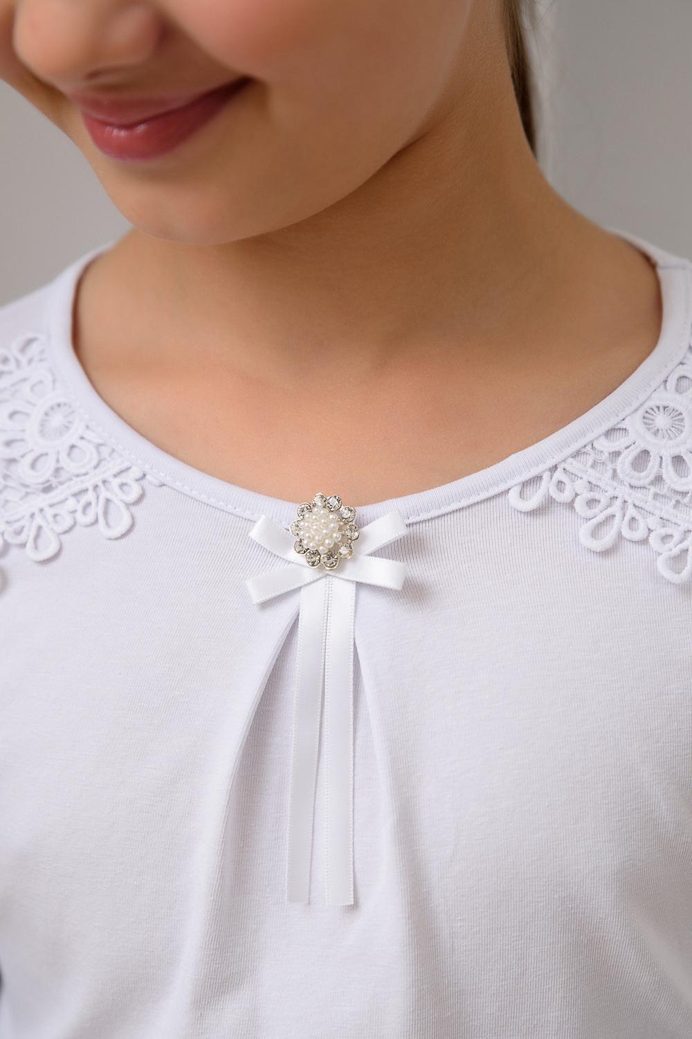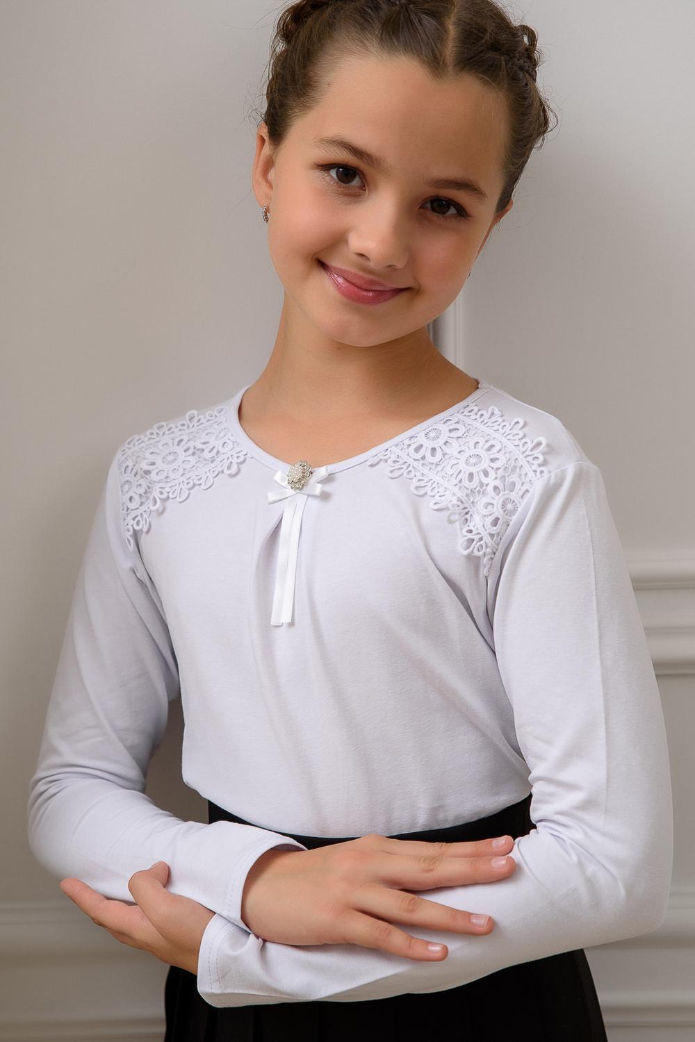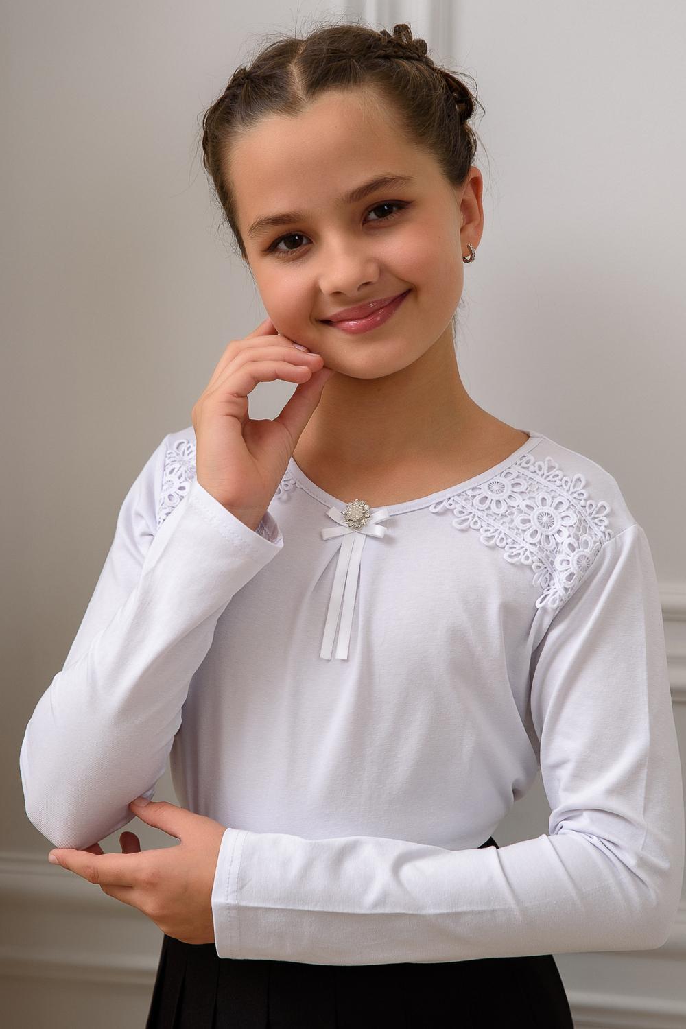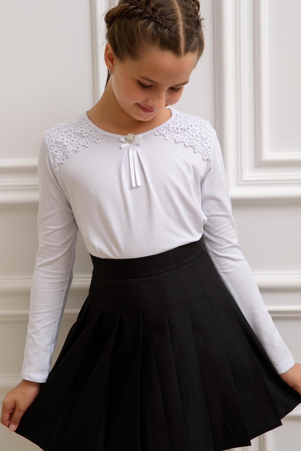 Блузка школьная для девочки с трикотажными длинными рукавами, круглым вырезом горловины, по центру горловины прикреплена брошь, без застёжки. На передней части блузки настрочено кружево. Сшита из мягкого хлопкового трикотажного материала с добавлением в состав хлопка 92% и лайкры 8 %. Школьная форма украсит и дополнит любой образ не только в школу, но и для повседневной носки, на день рождения, фотосессию и для особых случаев. Джемпер отлично сидит по фигуре, движения в нем комфортные, позволяет выглядеть ребенку изящно. Хорошо смотрится в сочетании с юбками, сарафанами, брюками, со школьным костюмом, отлично сохраняют цвет и форму при активной носке и после многократных стирок. Используемый материал блузки мягкий и приятный телу, устойчив к износу, не садится, не образует катышек на поверхности, имеет эффектный внешний вид.