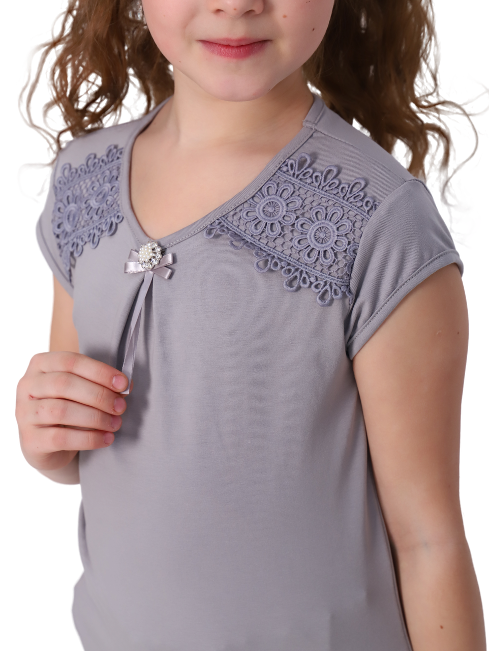 Базовый школьный джемпер для девочек с коротким рукавом. Нарядная блузка станет основой как повседневного, так и праздничного образа. Мягкое кружево придает модели нежности. Спереди прикреплен съемный декоративный элемент из атласных лент и броши. Модель составит одинаково удачный комплект и с юбкой, и с брюками. Джемпер сшит из качественного трикотажа, используемый материал не теряет форму после многократных стирок, мягкий и приятный к телу, устойчив к износу. Для сохранения первоначальных свойств изделия, важно соблюдать рекомендации по уходу.