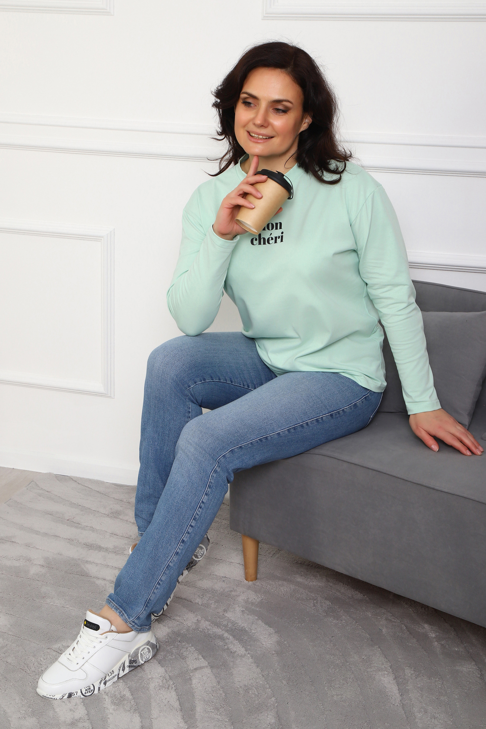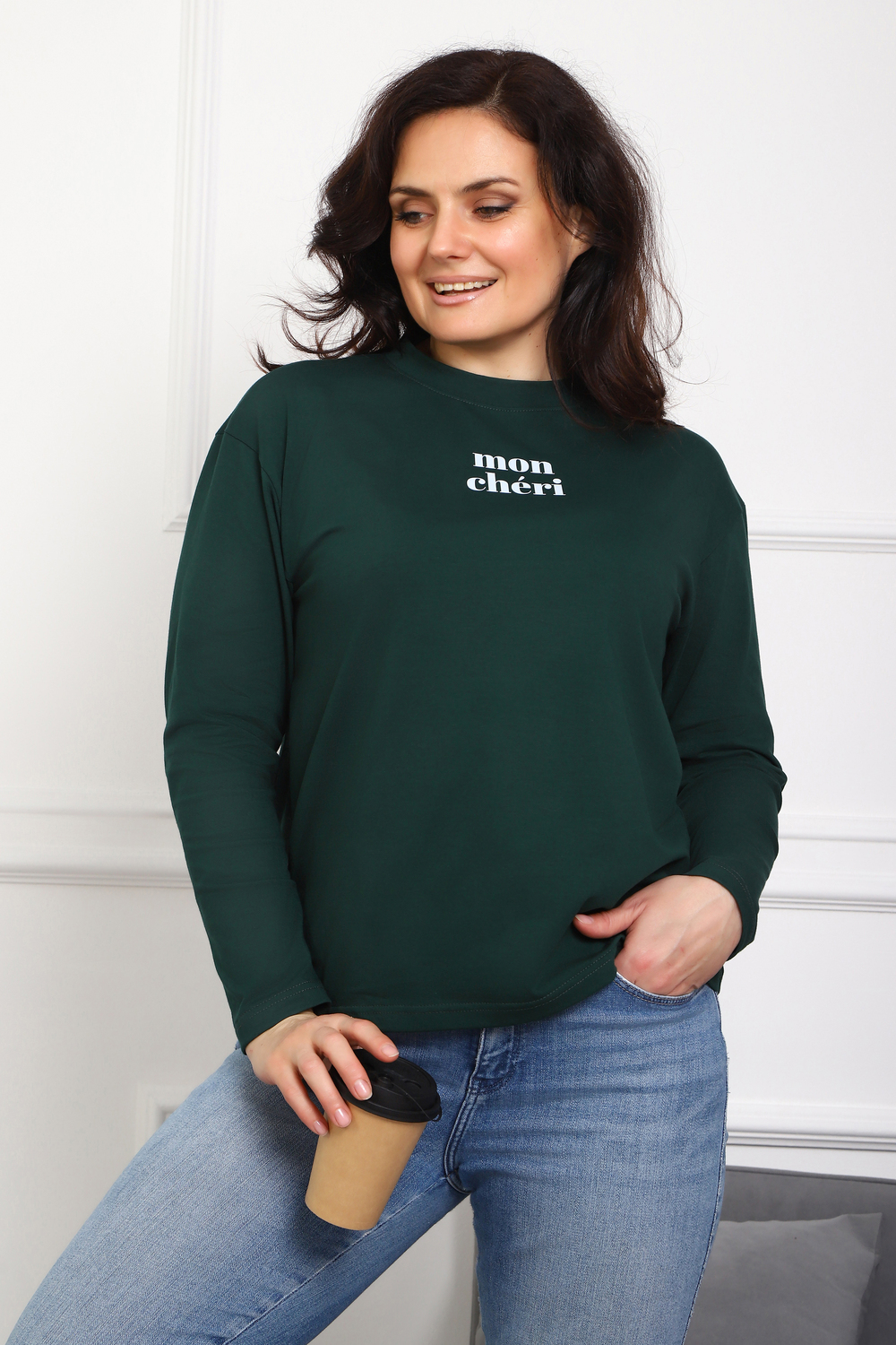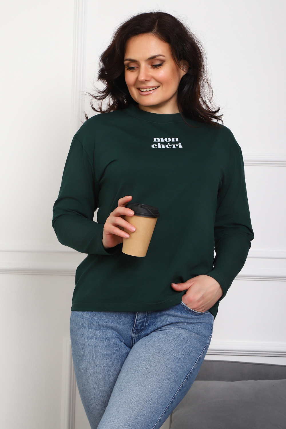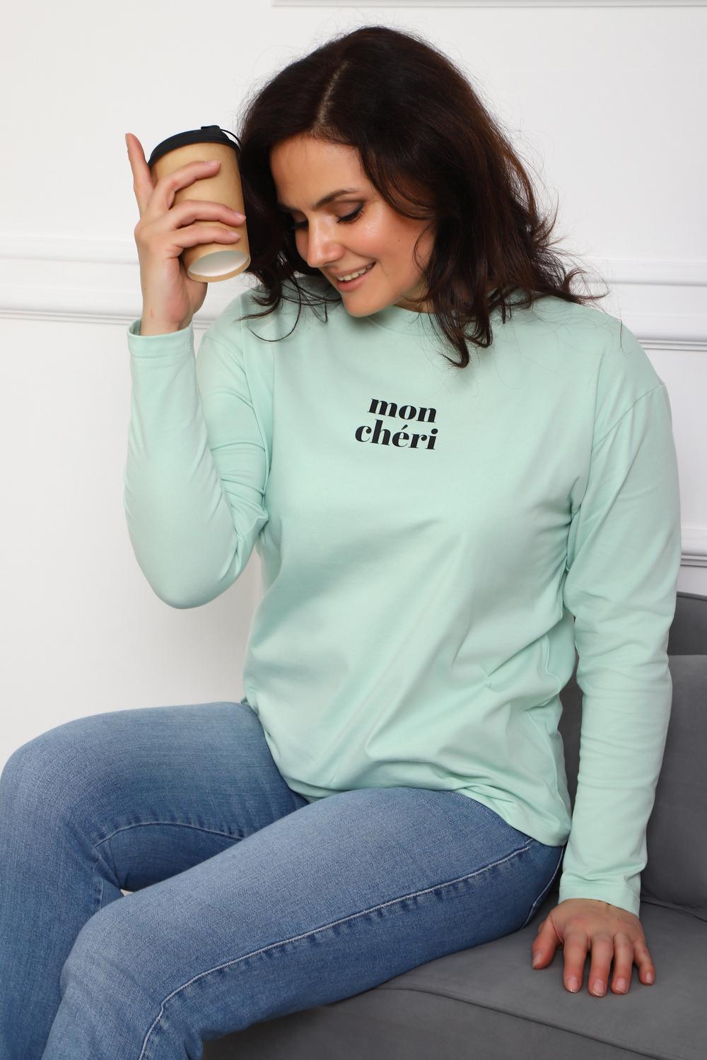 Лонгслив женский MON CHERI Женский лонгслив свободой посадки изготовлен из мягкой и приятной к телу кулирки, которая состоит из высококачественного хлопка (95%) и небольшого процента лайкры (5%), обеспечивающей лёгкую эластичность и долговечность изделия. Свободный прямой и удлиненный крой подчеркивает удобство и расслабленный стиль, позволяя носить его ежедневно. Длинные рукава и круглая горловина создают гармоничный внешний вид, подчеркивая женственность и утончённость. Элегантный минималистичный принт на груди с романтичным французским выражением "Mon Cheri" привносит особую атмосферу романтики и легкости в образ. Важным преимуществом является сдвоенный размер, позволяющий комфортно подобрать модель каждой женщине, независимо от особенностей фигуры. Данный лонгслив станет идеальным выбором для тех, кто ценит сочетание комфорта, удобства и современного дизайна.