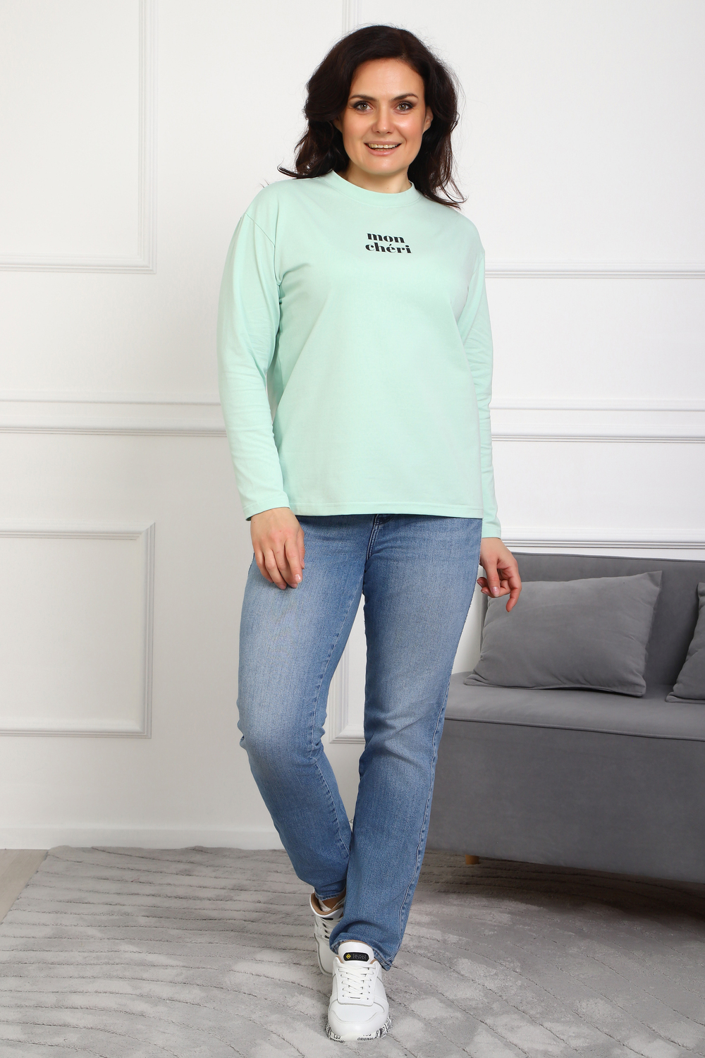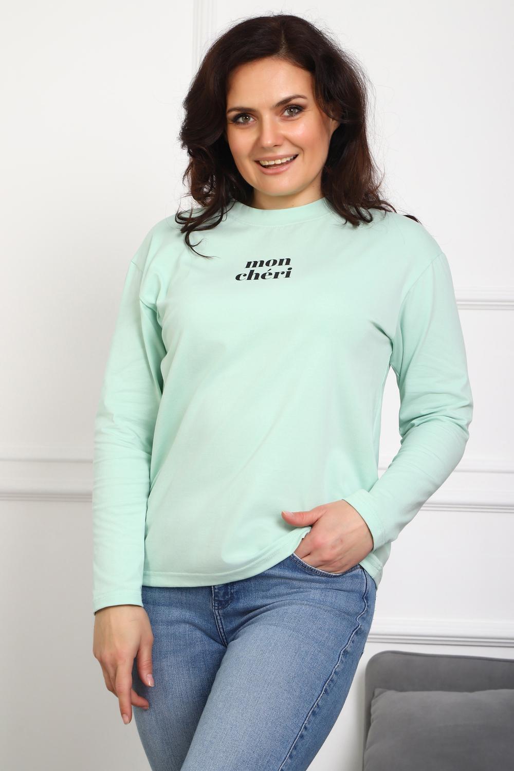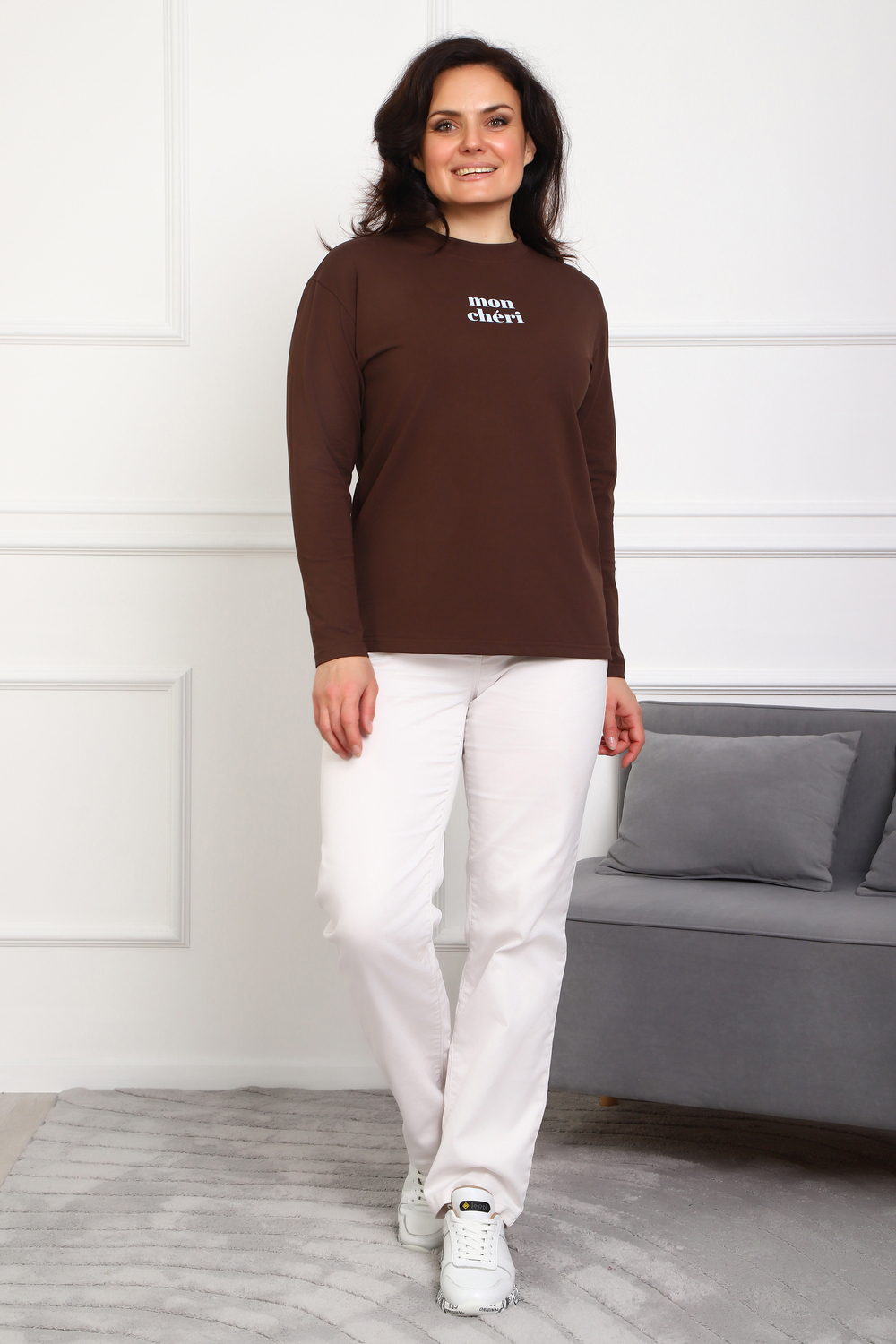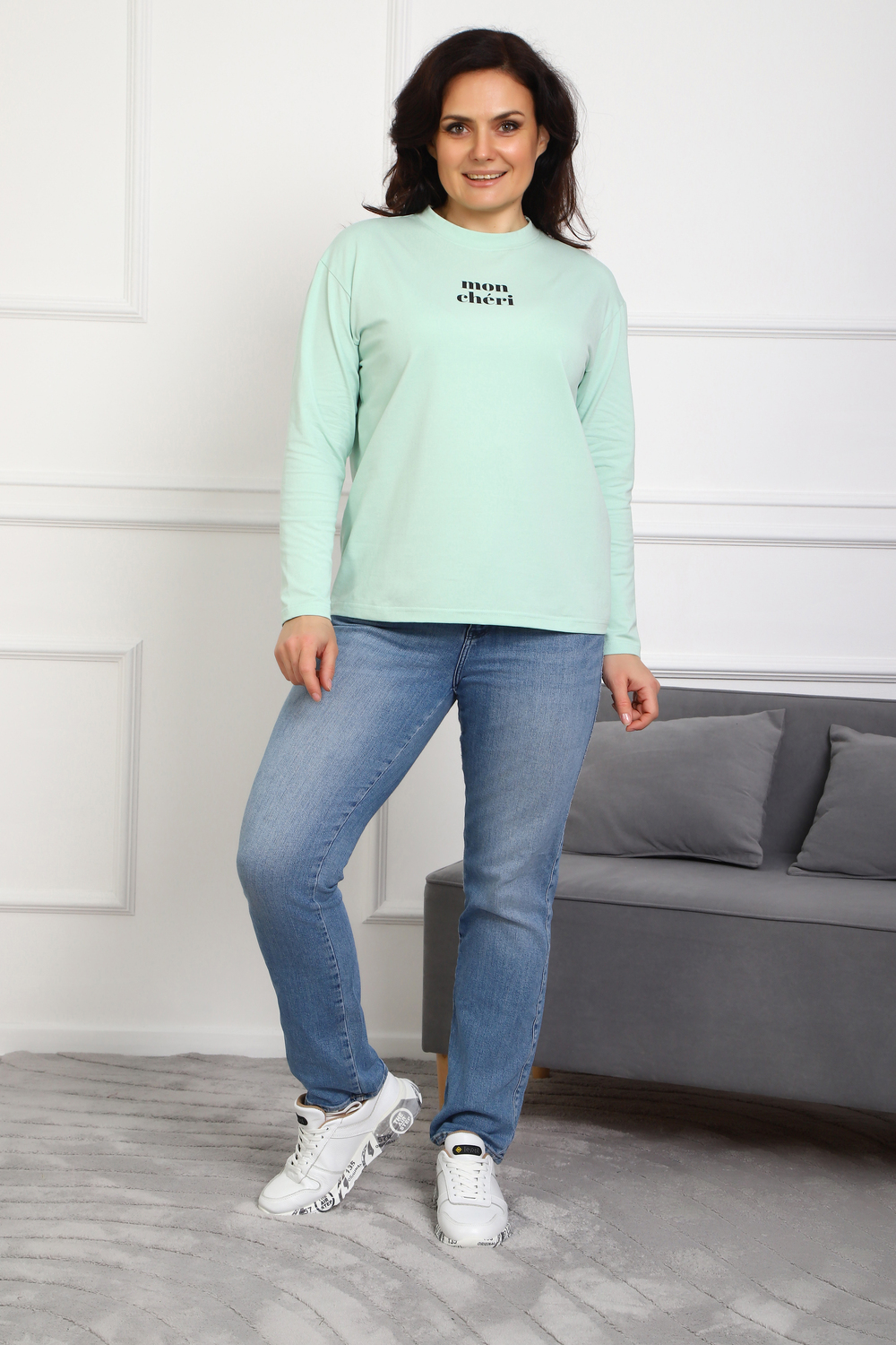 Лонгслив женский MON CHERI Женский лонгслив свободой посадки изготовлен из мягкой и приятной к телу кулирки, которая состоит из высококачественного хлопка (95%) и небольшого процента лайкры (5%), обеспечивающей лёгкую эластичность и долговечность изделия. Свободный прямой и удлиненный крой подчеркивает удобство и расслабленный стиль, позволяя носить его ежедневно. Длинные рукава и круглая горловина создают гармоничный внешний вид, подчеркивая женственность и утончённость. Элегантный минималистичный принт на груди с романтичным французским выражением "Mon Cheri" привносит особую атмосферу романтики и легкости в образ. Важным преимуществом является сдвоенный размер, позволяющий комфортно подобрать модель каждой женщине, независимо от особенностей фигуры. Данный лонгслив станет идеальным выбором для тех, кто ценит сочетание комфорта, удобства и современного дизайна.