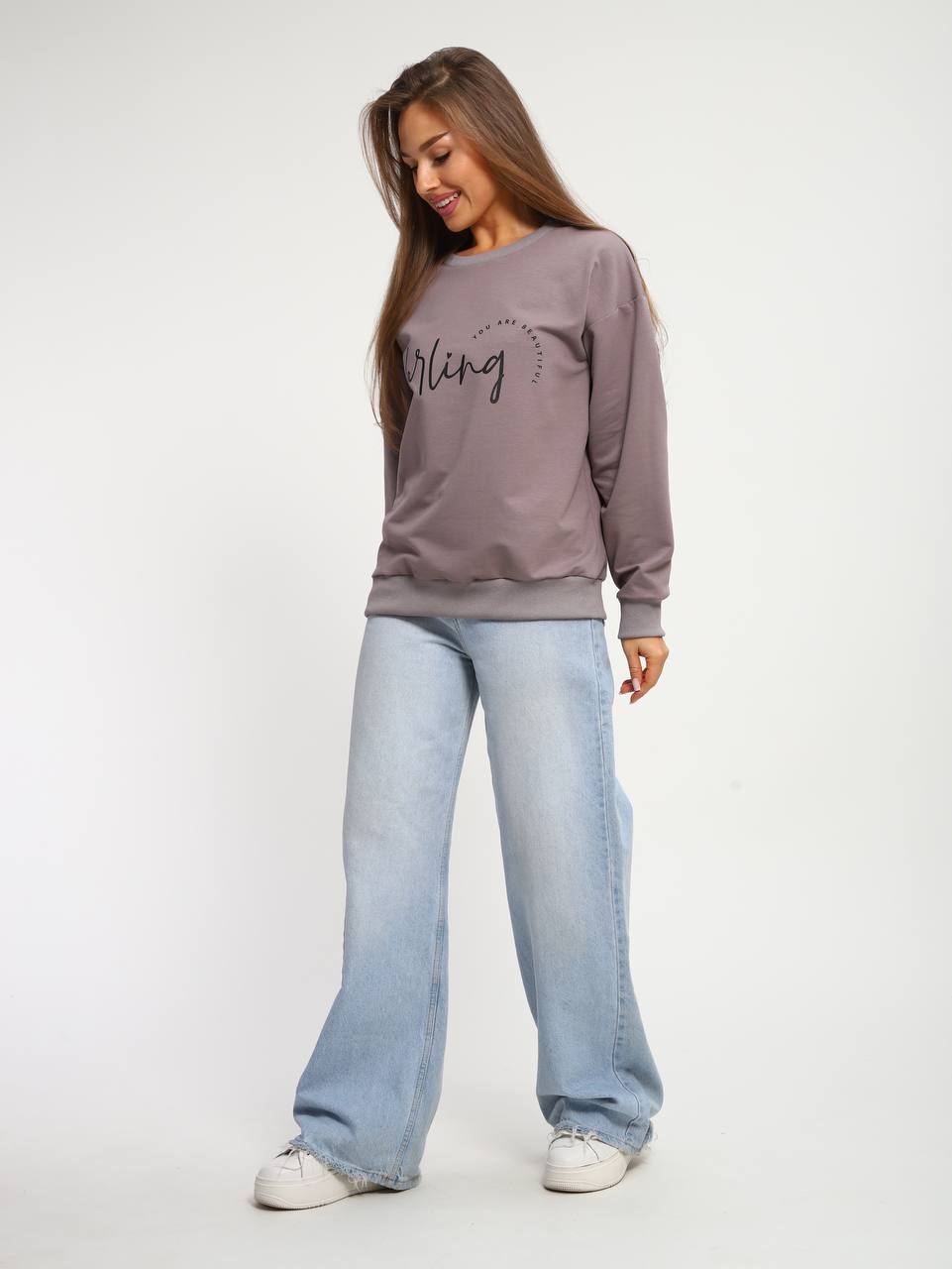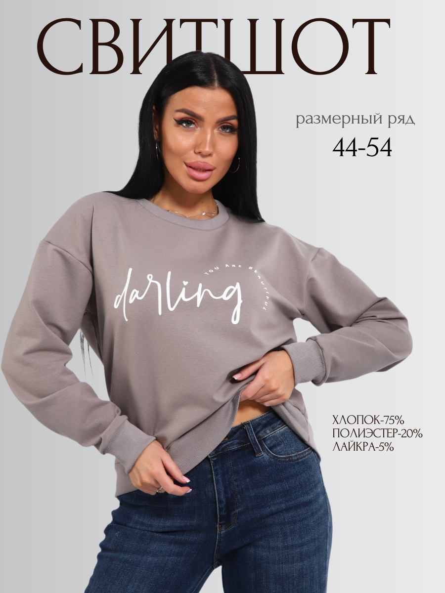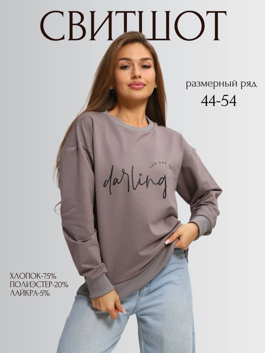 Стильный свитшот из футера 2-х нитки, плотной, но в то же время легкой ткани. Данная модель имеет свободный крой, длинные рукава и эластичные манжеты, что делает его удобным и практичным. На груди имеется стильный принт. Свитшот легко комбинировать с одеждой разных стилистических направлений: отлично сочетается с джинсами, спортивными брюками или юбками, создавая как casual-образ, так и более спортивный или уличный. Модель без начеса на внутренней стороне делает её комфортной в теплую погоду, сохраняя при этом достаточный уровень тепла в прохладные дни. Женский свитшот не сковывает движения, обеспечивает комфортную посадку на любой тип фигуры, подойдет на средний и высокий рост.