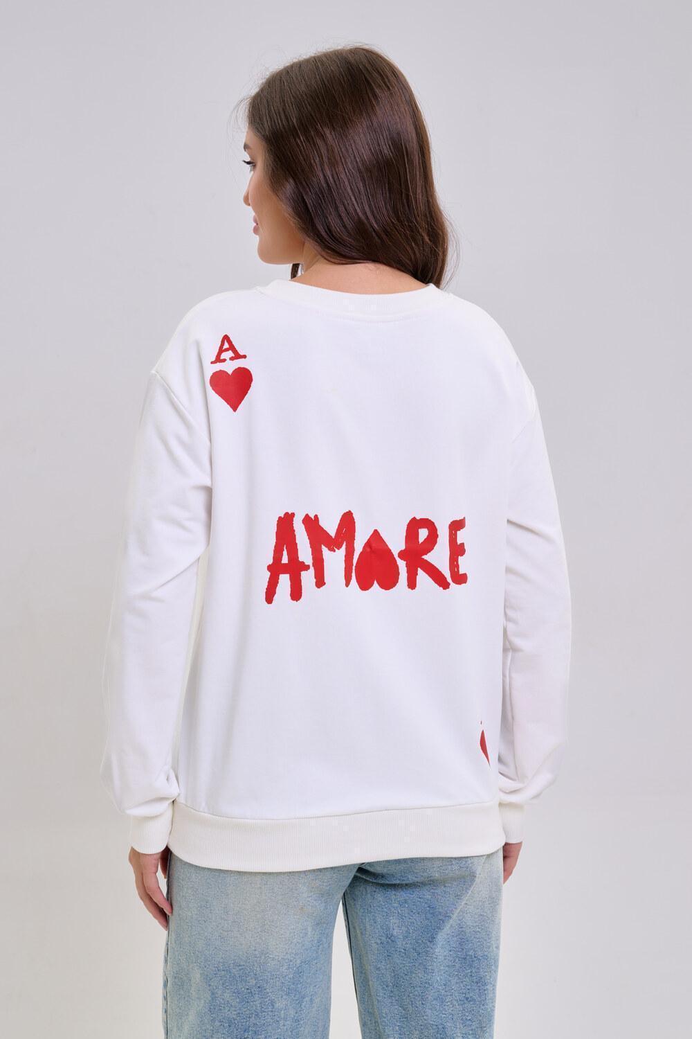 Женский свитшот свободного прямого кроя с круглой горловиной и слегка приспущенными плечами. На спинке нанесён принт в виде надписи "AMORE". Выполнен из мягкого и приятного материала — футера 2-х нитки, обеспечивающего дополнительный комфорт и сохранение тепла даже в холодную погоду. Доступен в сдвоенных размерах, что удобно для подбора идеальной посадки. Подходит как для повседневной носки, так и для создания эффектных образов в любом стиле.