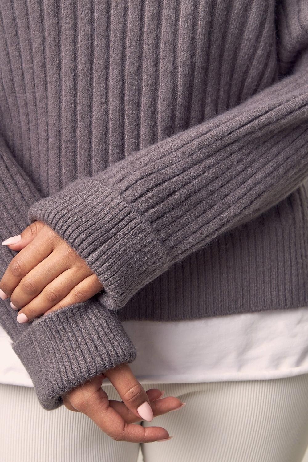 Уникальная вязка: Рельефная вертикальная резинка придает изделию объем и текстуру, делая его визуально интересным и тактильно приятным.