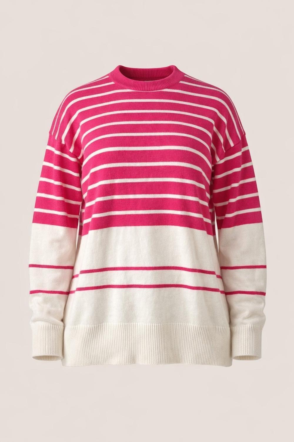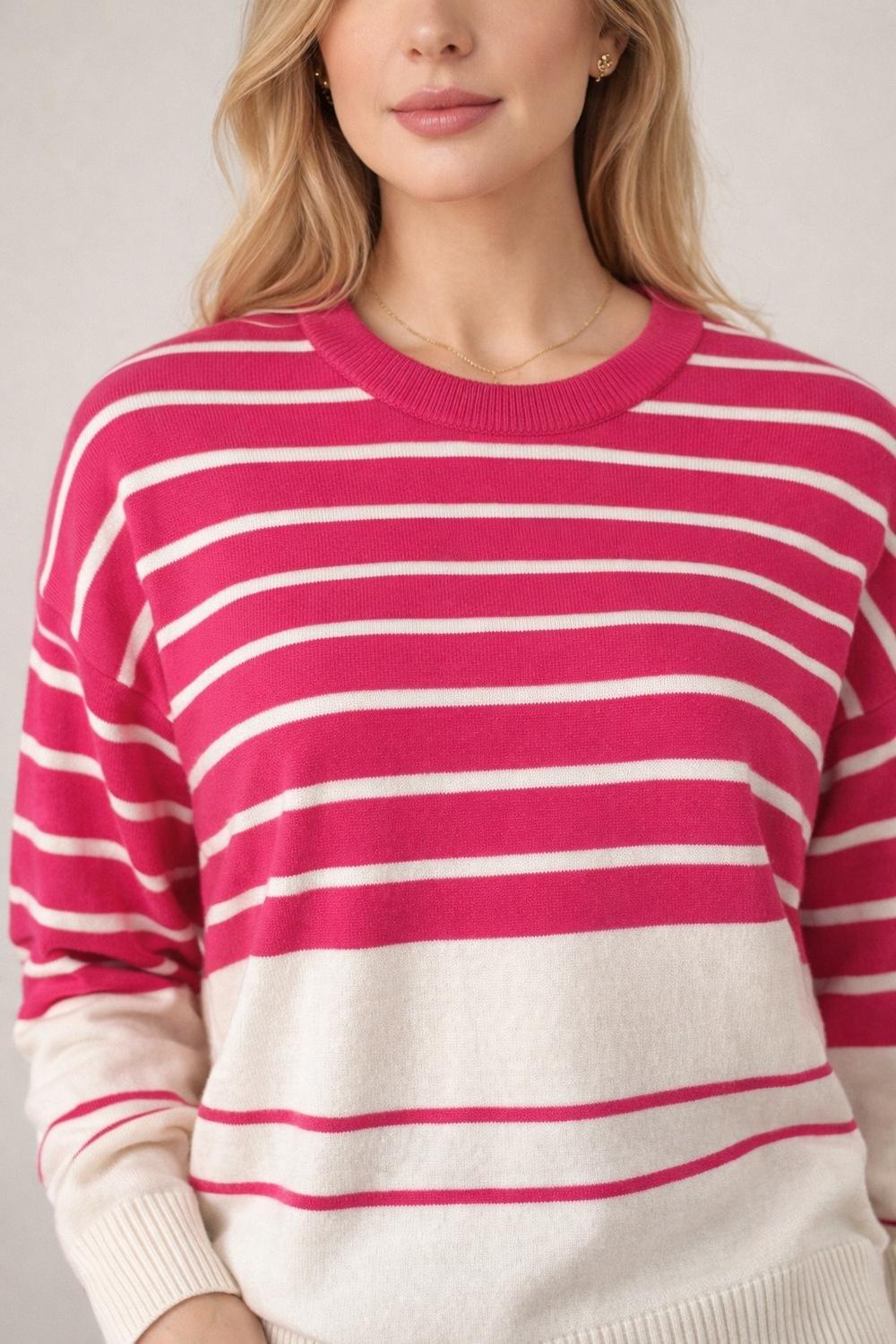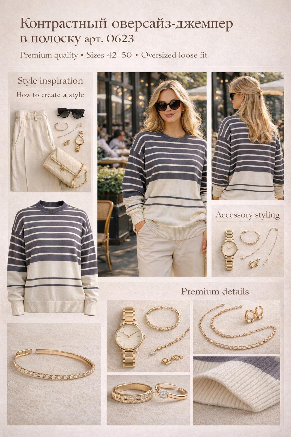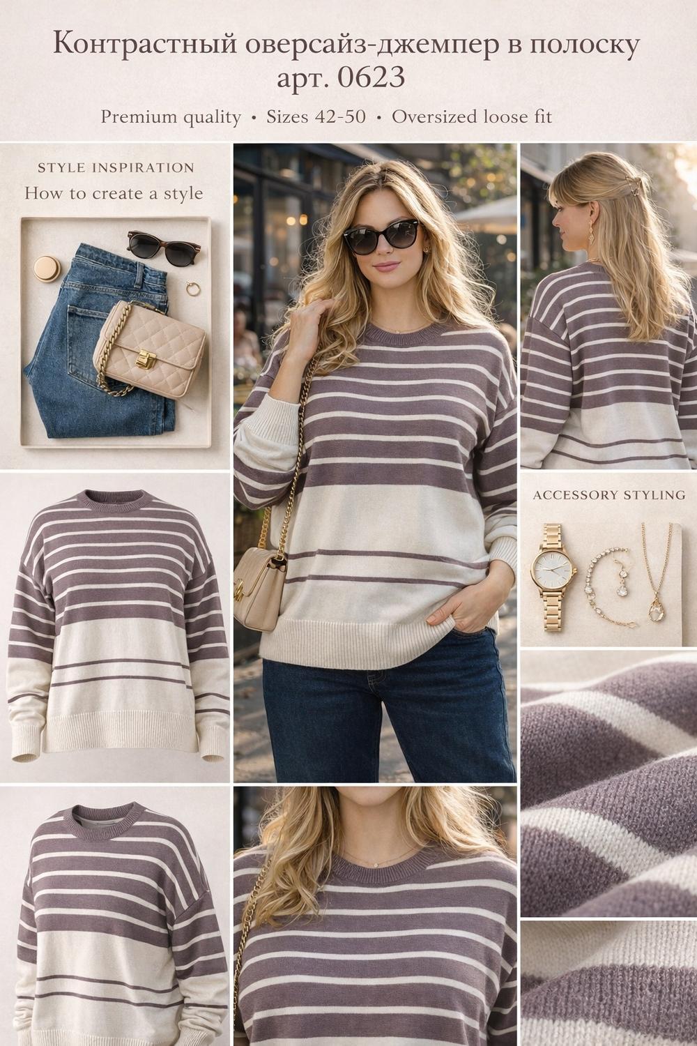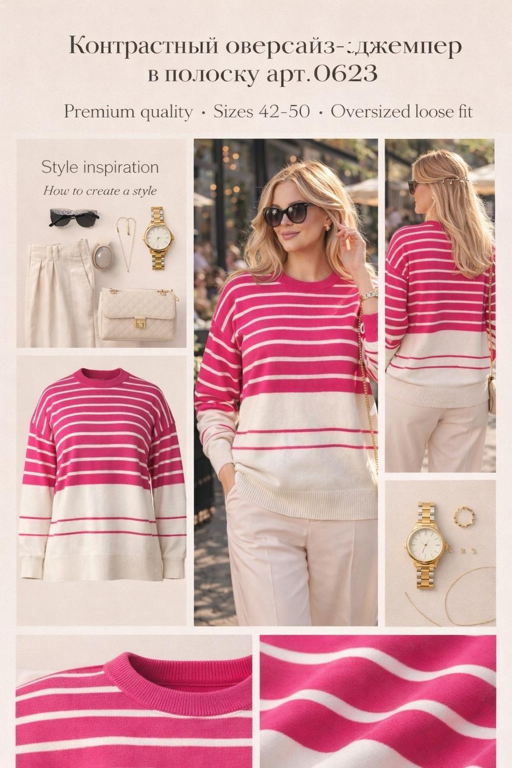 Контрастный оверсайз-джемпер в полоску арт. 0623 — идеальный выбор для тех, кто ищет стиль, комфорт и практичность в одном изделии. Этот джемпер выполнен из 100% высококачественного акрила, который обеспечивает мягкость, плотность и долговечность. В отличие от шерсти, он не колется, идеально подходит для чувствительной кожи и сохраняет форму даже после многократной носки. Гладкая текстура без ворса и приятная на ощупь фактура создают ощущение уюта и стиля, а контрастные полосы добавляют образу современности и индивидуальности.