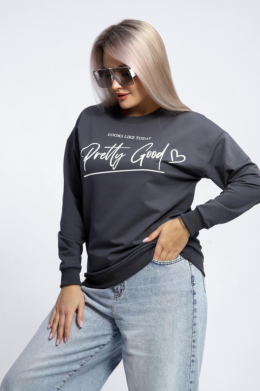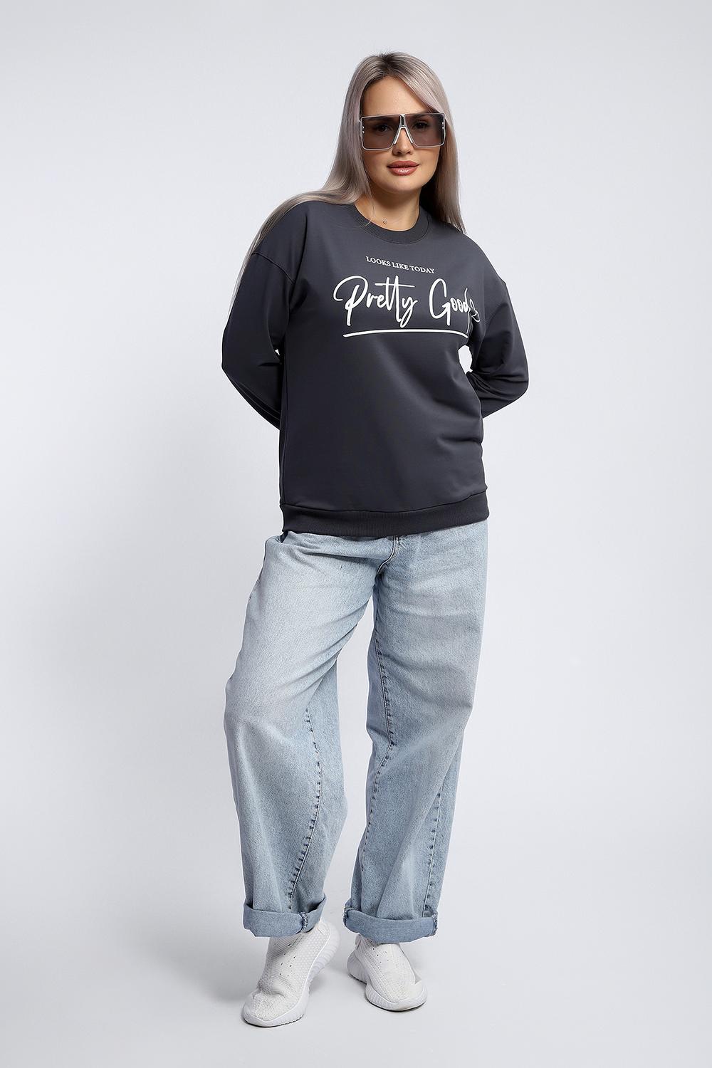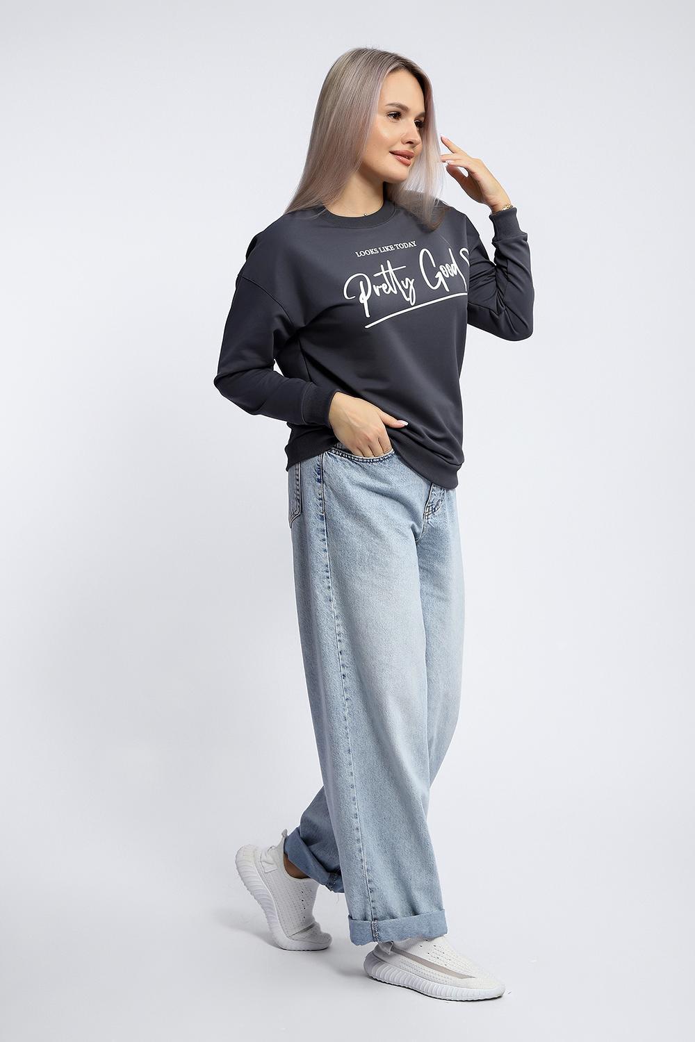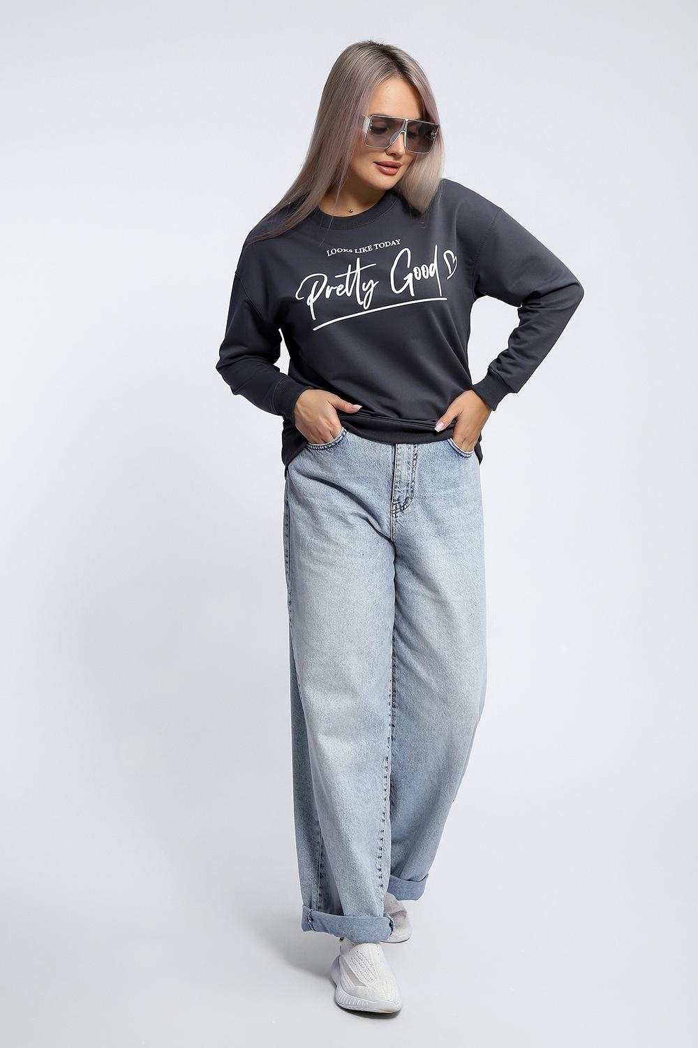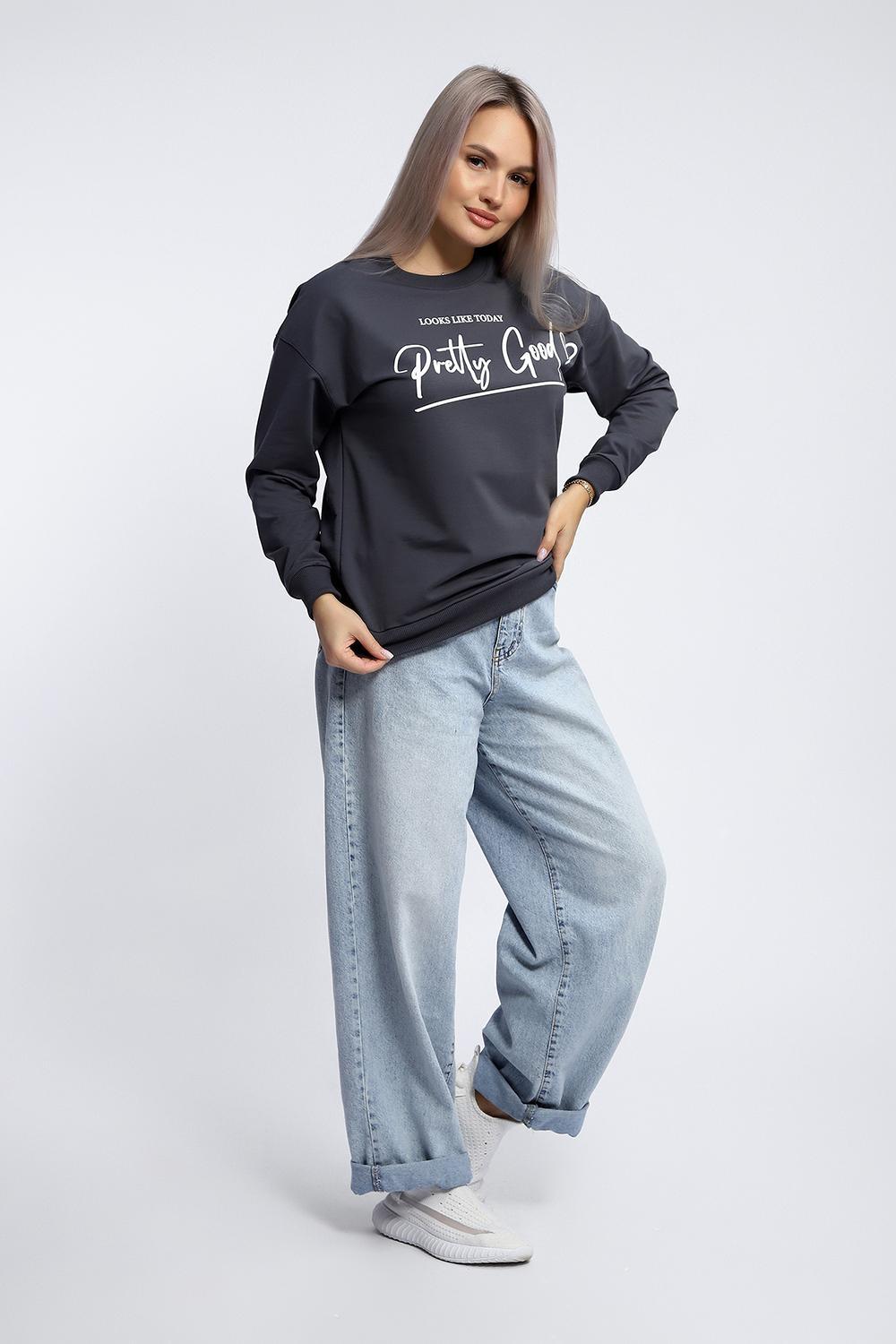 Толстовка свободного кроя "оверсайз" со спущенной линией плеча прекрасный вариант для прохладной погоды! Мягкое, эластичное кашкорсе в тон ткани использовано для отделки горловины, манжет и пояса. На полочке декоративный принт.