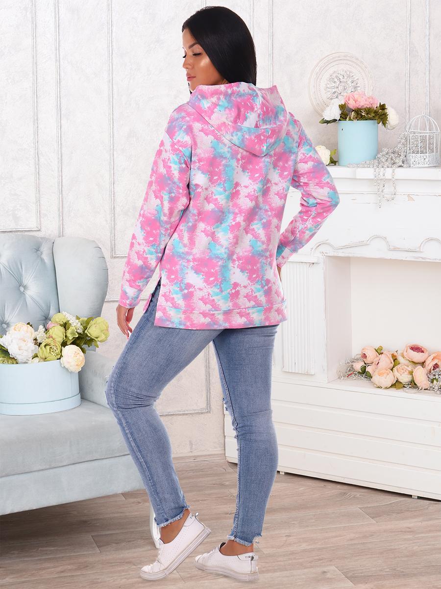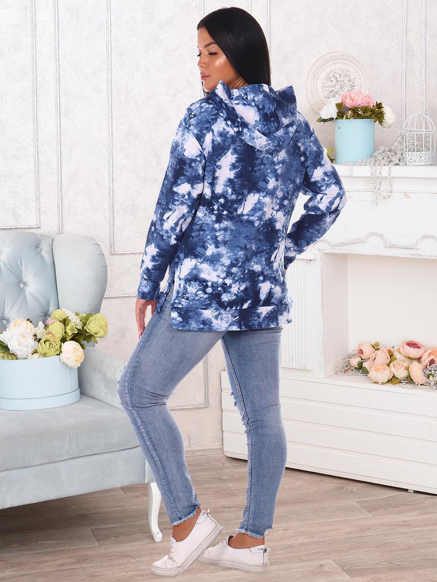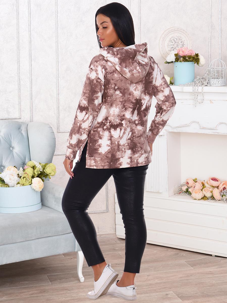 Толстовка женская со спущенным рукавом на манжете, двойным капюшоном, накладным карманом, в боковых швах разрезы.