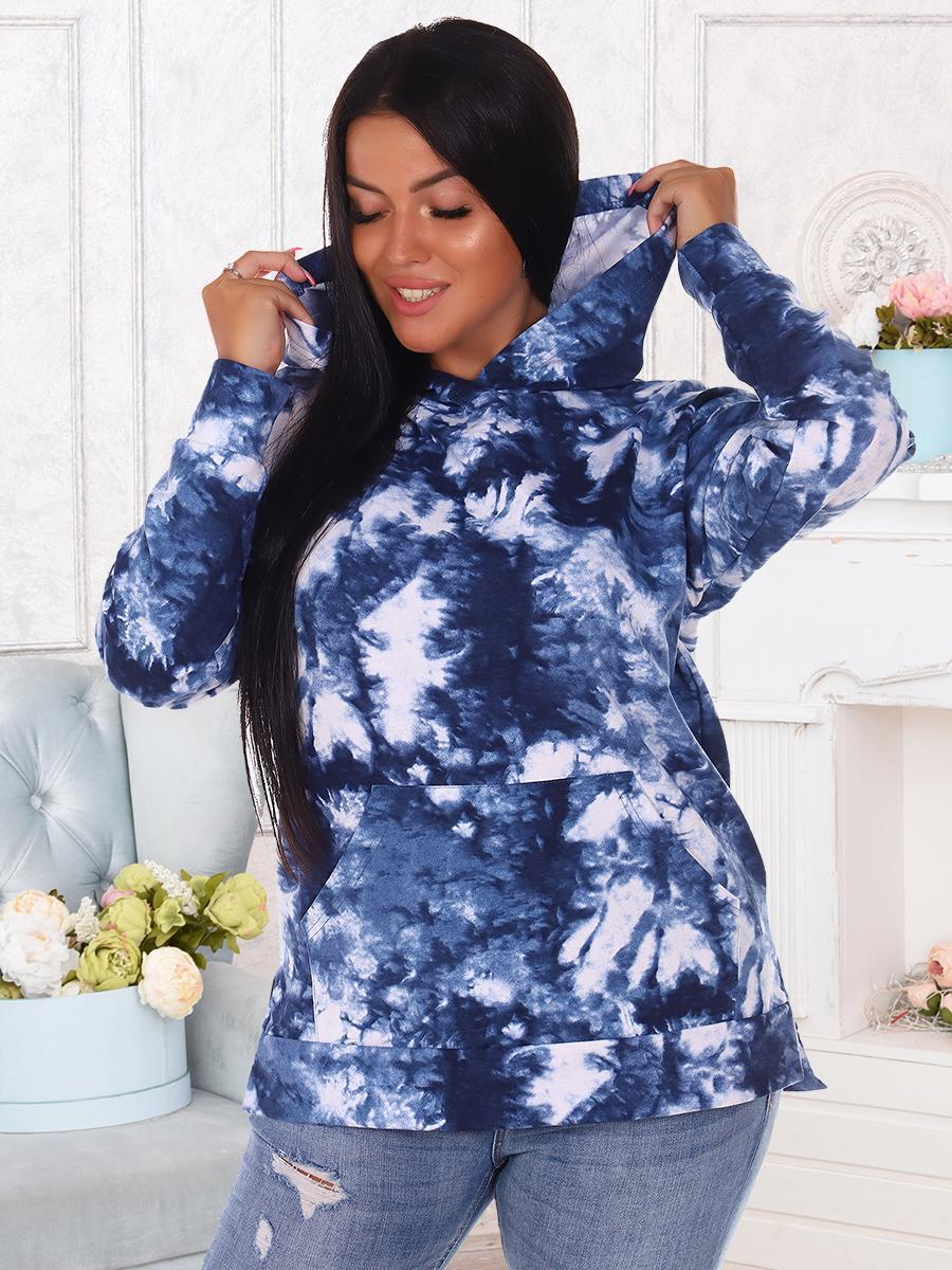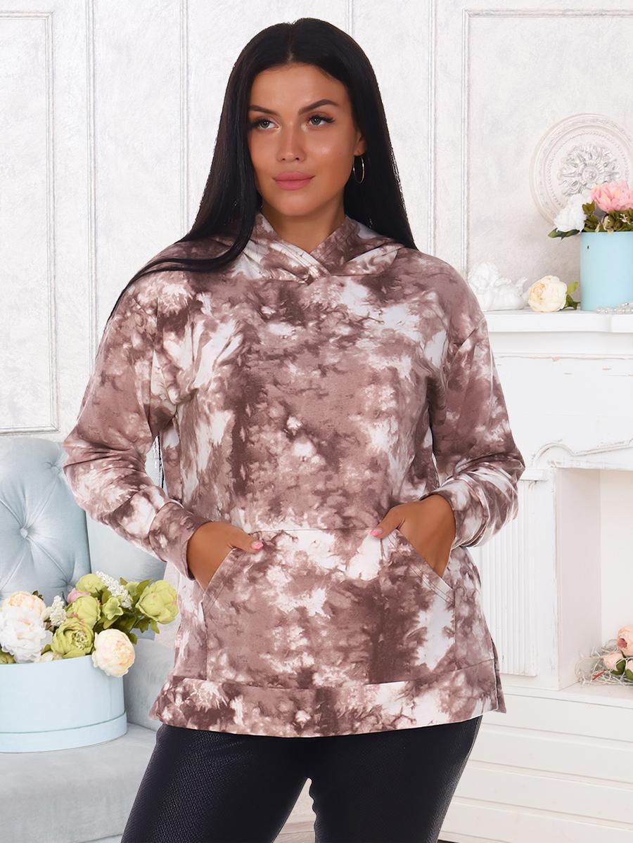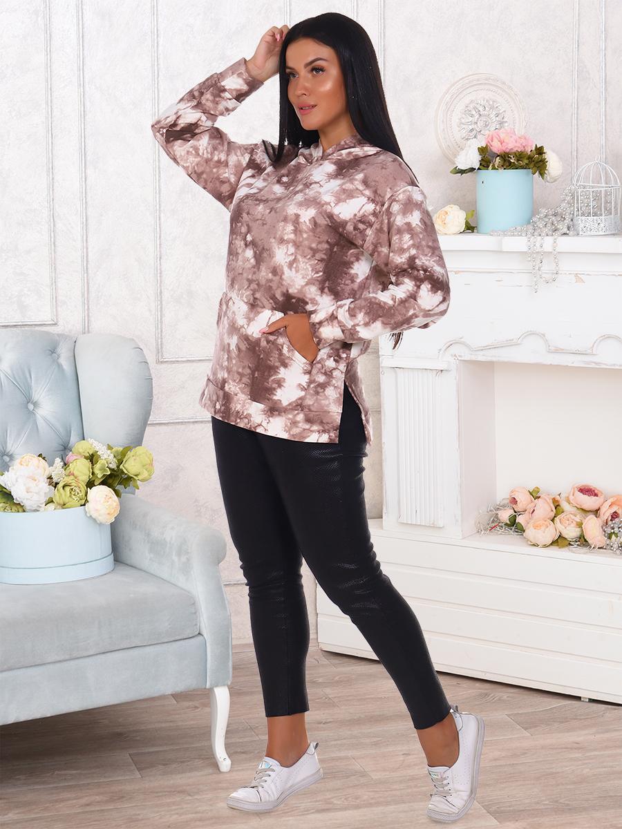 Толстовка женская со спущенным рукавом на манжете, двойным капюшоном, накладным карманом, в боковых швах разрезы.