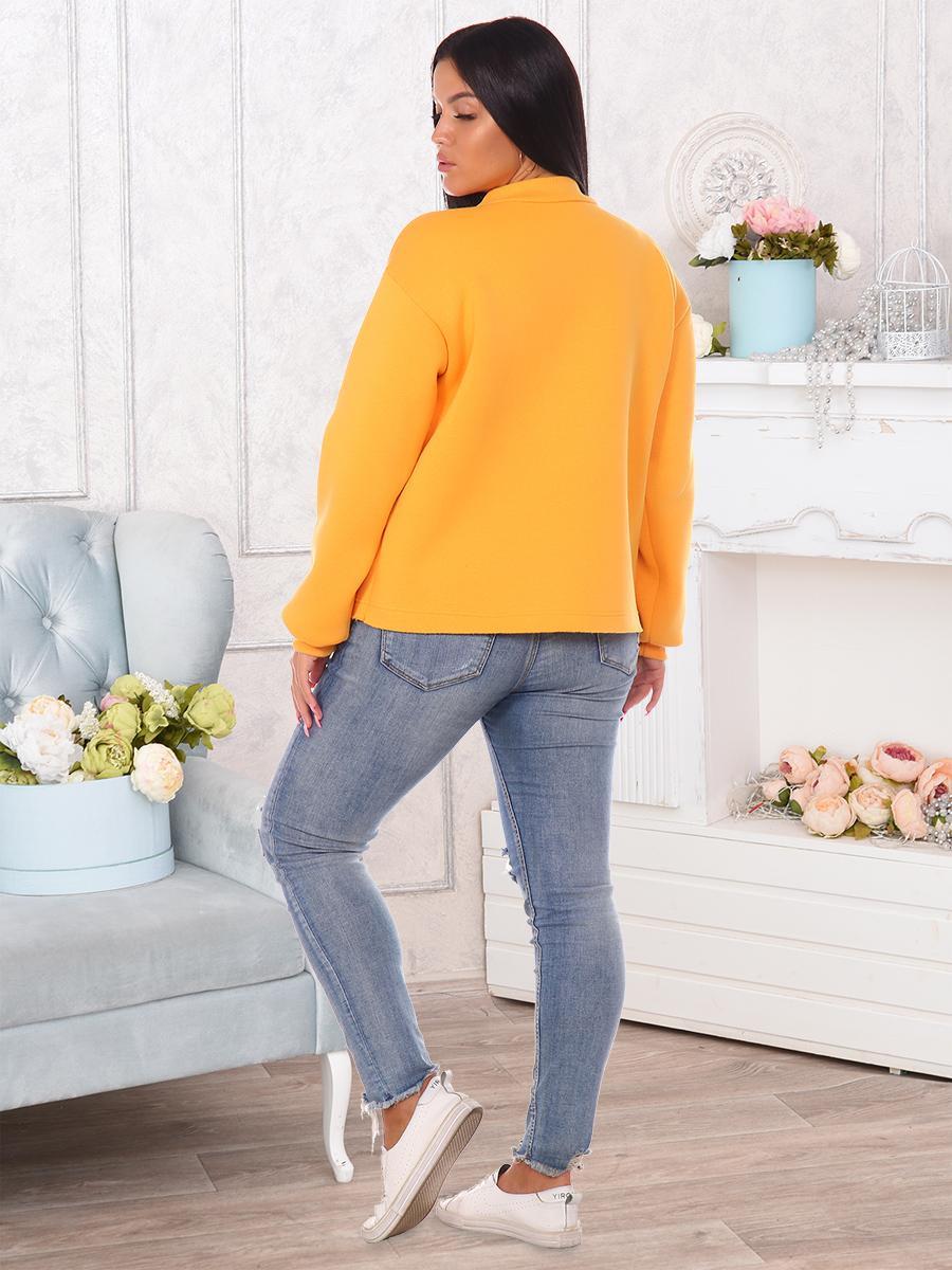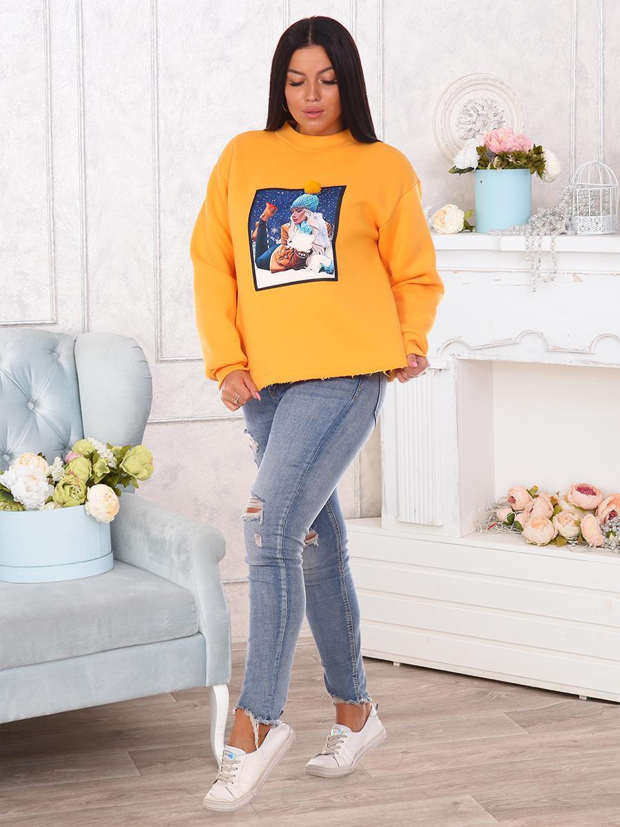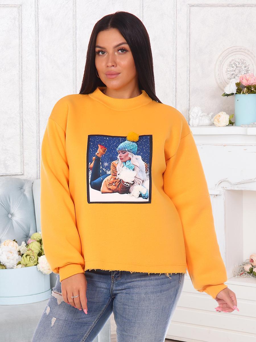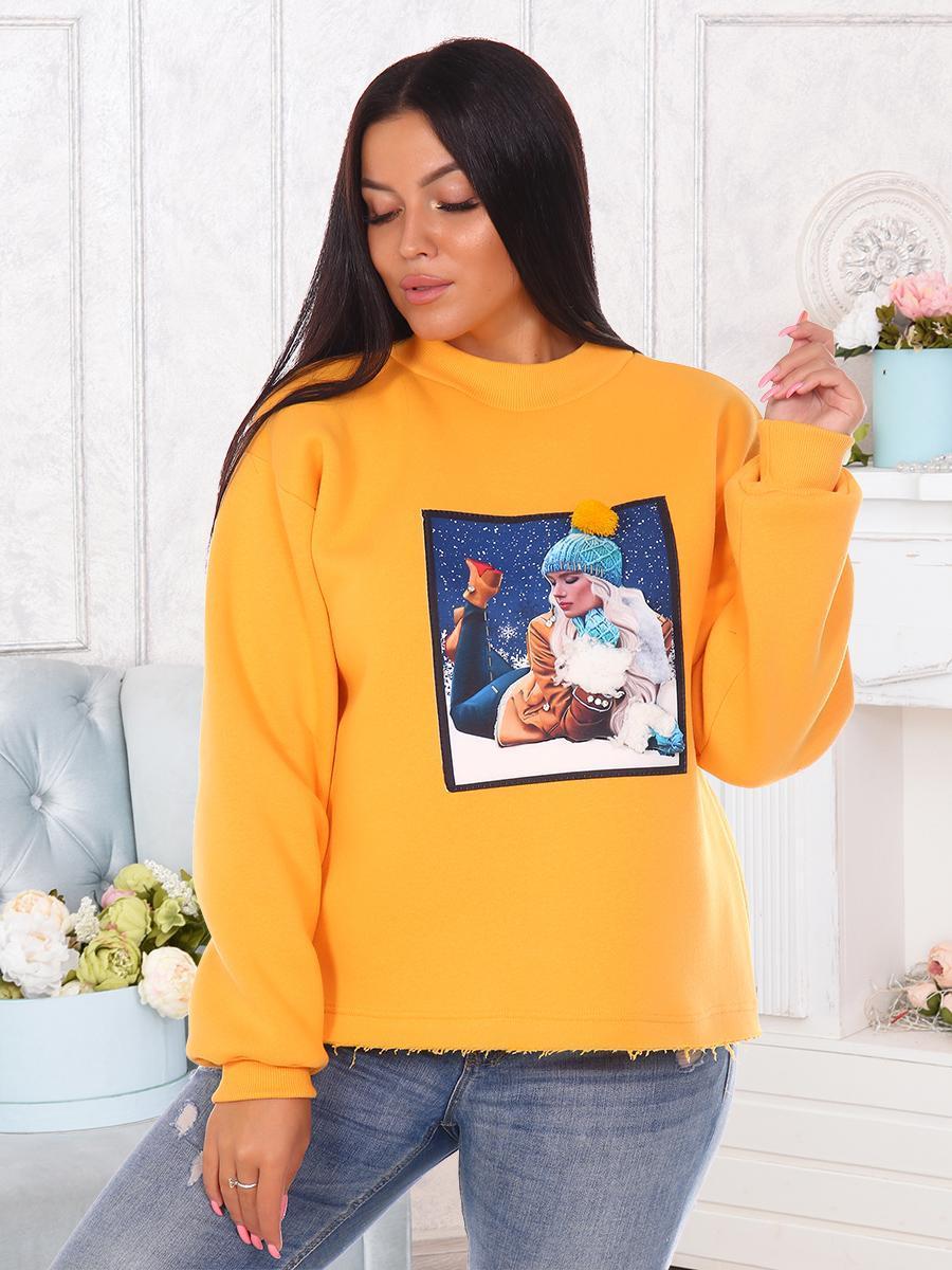 Толстовка женская утепленная с оригинальной нашивкой в технике 3D. Манжеты и горловина выполнены из кашкорсе, нижний срез толстовки оставлен открытым.