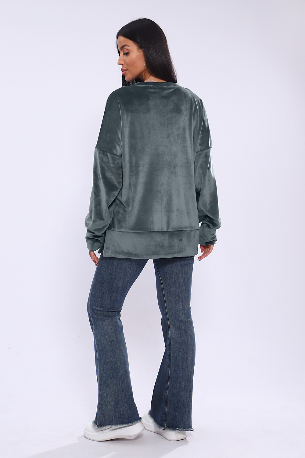 Женское худи свободного кроя со спущенным рукавом и разрезами по бокам. Модель выполнена из премиального велюра.