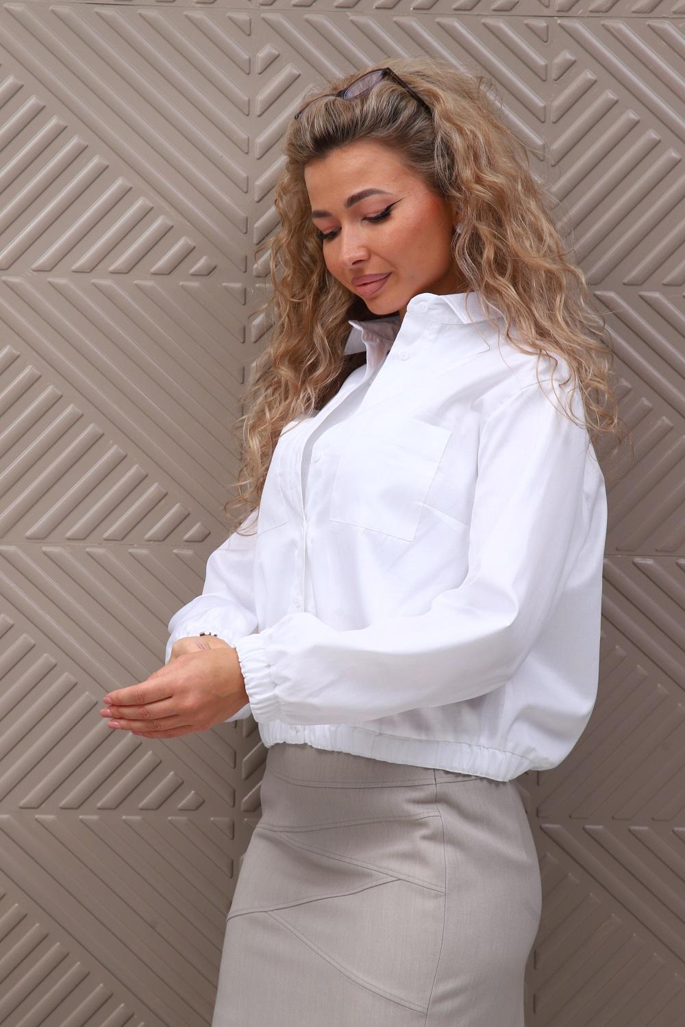 Рубашка женская в спортивном стиле (силуэт - "бомбер"), из премиального сатина (100% хлопок). Новый трендовый силуэт выделяют её среди других белых рубашек. Низ изделия и манжеты на резинке. Резинка по низу рубашки создаёт силуэт, посадка по фигуре задумана без натяжения резинки. Манжеты на рукавах не тугие, тоже свободная посадка. Планка на пуговицах. Данная рубашка - универсальный выбор и для делового стиля (отлично сочетается с классическими юбками и брюками), и для повседневной одежды (сочетается с джинсами, спортивными штанами).
