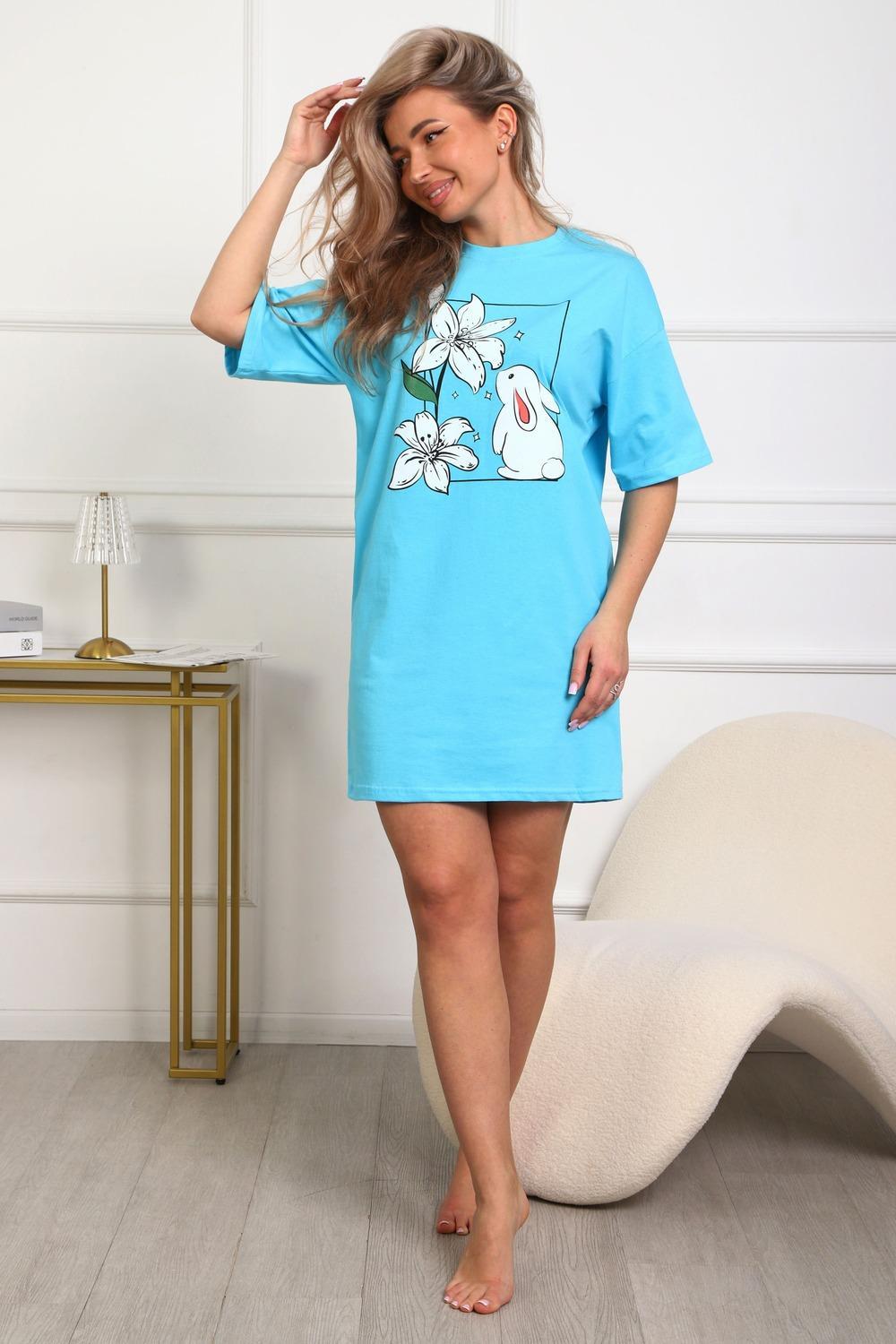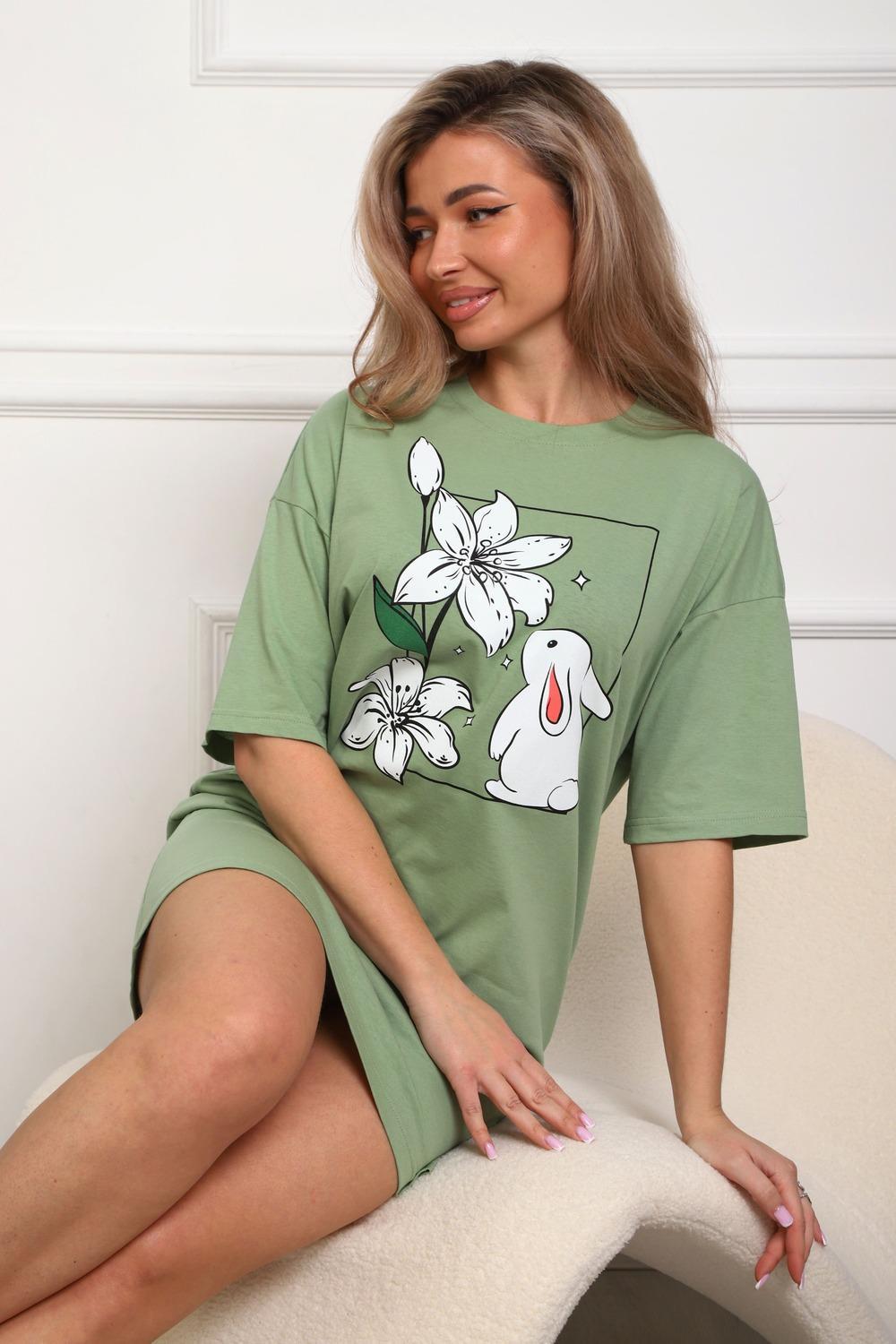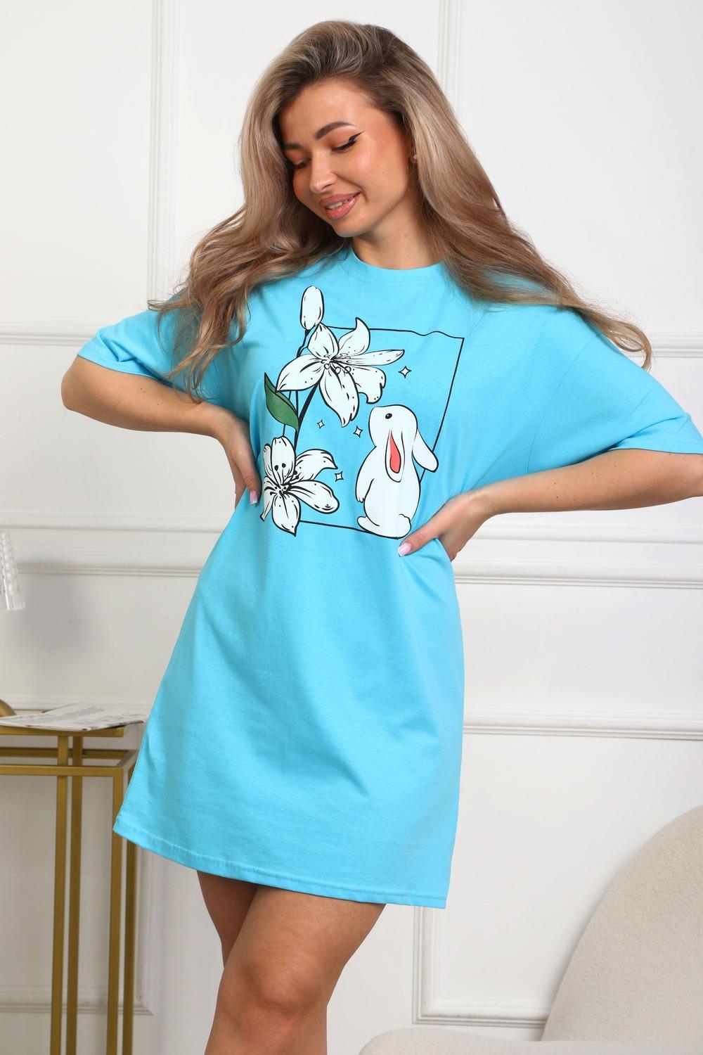 Туника женская прямого силуэта. Низ изделия прямой. Длинна выше колена, плечо спущенное, рукав короткий. Горловина круглой формы, обработана планкой с отделочной строчкой по шву притачивания. Принт (шелкография) располагается по центру переда.