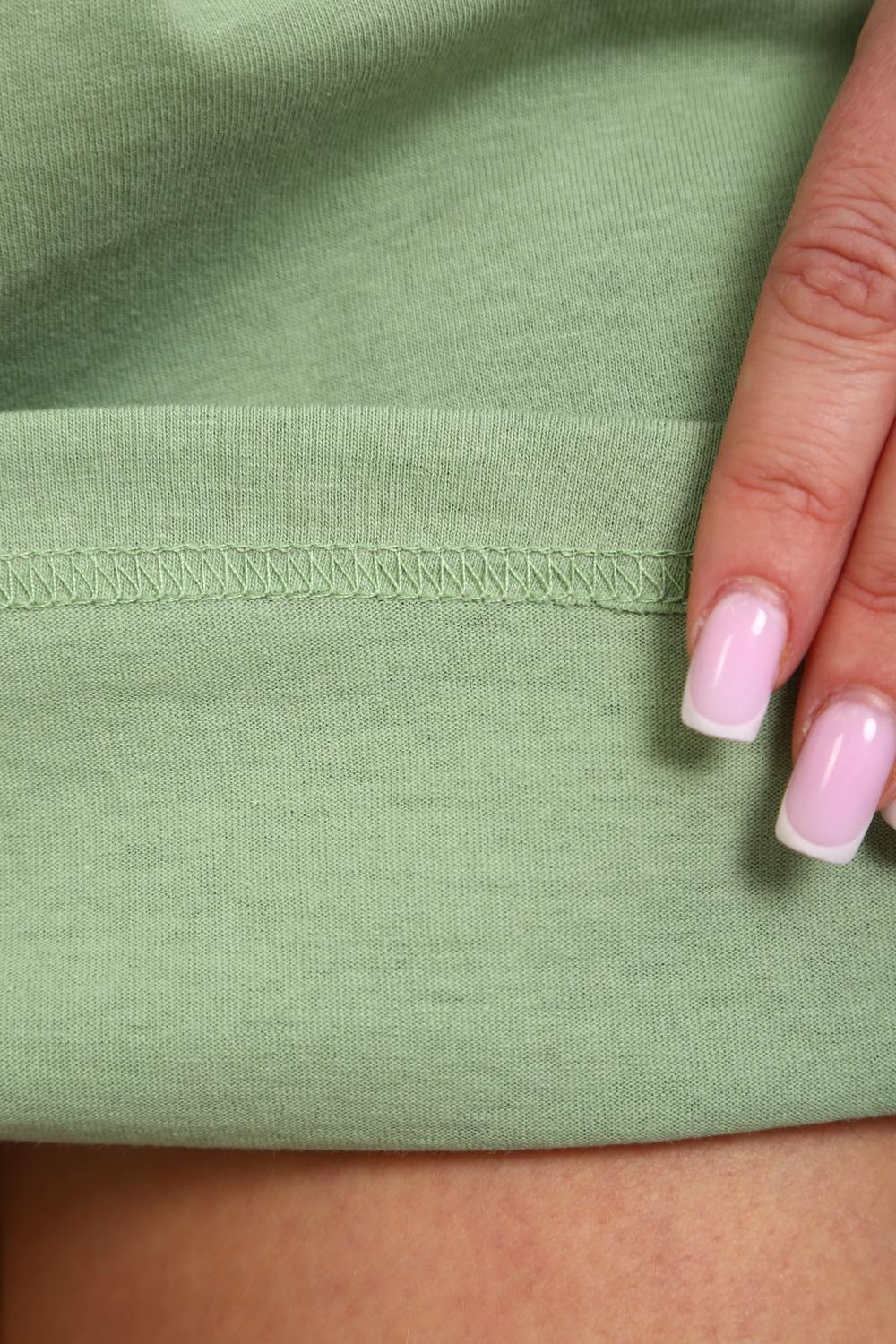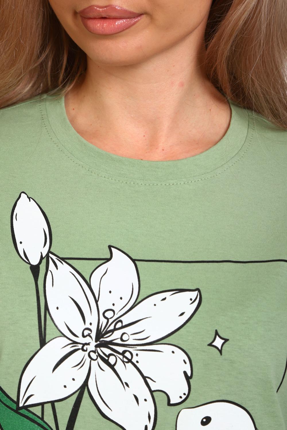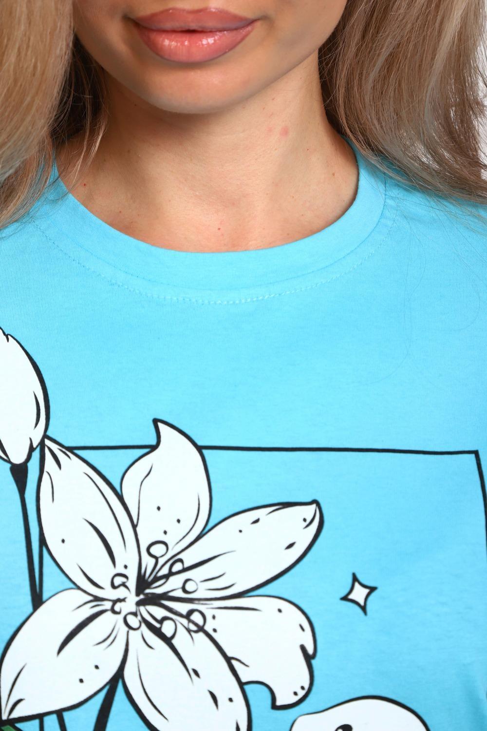Туника женская прямого силуэта. Низ изделия прямой. Длинна выше колена, плечо спущенное, рукав короткий. Горловина круглой формы, обработана планкой с отделочной строчкой по шву притачивания. Принт (шелкография) располагается по центру переда.